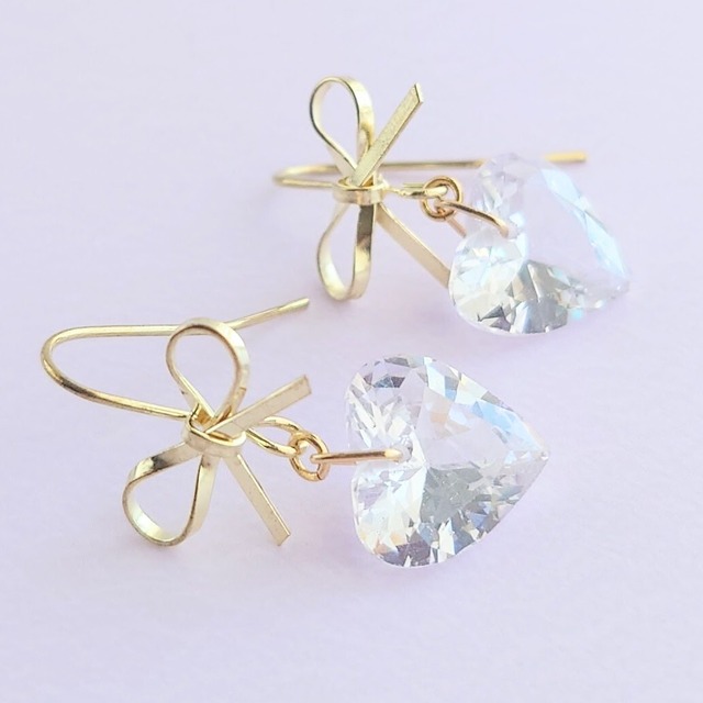 リボンピアスにキュービックジルコニアのハートがゆれるピアス♡ キラキラ輝くハートのデザインと可愛らしいリボンが印象的なピアスです。華やかさと上品さを兼ね備えたデザインは、幅広いスタイルに合わせることができます。特別な日のパーティーシーンから、普段使いまで幅広く活躍してくれます。 キラキラと輝くジルコニアは、まるで本物のダイヤモンドのように輝きます。 リボンには絆、結びつき、約束といった意味のあるラッキーモチーフ♡大切な人へのプレゼントにもおすすめです。 ハートには恋愛成就や幸福な結婚といった意味があり、片想いや愛を長続きさせたいときにつけるといいラッキーモチーフ♡ サイズ:リボンピアス 縦17mm×横15mm ハート(ジルコニア) 12mm(7mm) ピアス金具含め全体で長さ31mm ■購入の際の注意点 ・金属アレルギーには非対応ですので金属アレルギーの方はご利用をお控えください。(一部対応しているものもあります。) ・ピアス金具は一部サージカルステンレスへの変更が可能なものもありますのでご相談ください。 ・ニッケルフリーやK18メッキ、サージカルステンレスなど使用しているものもありますので商品説明の記載をご覧ください。 ・1点1点心を込めて丁寧に制作しておりますが、ハンドメイドのため左右のバランスが微妙に違うことがございます。 また、既製品よりもデリケートに出来ています。装着は丁寧に行なってください。