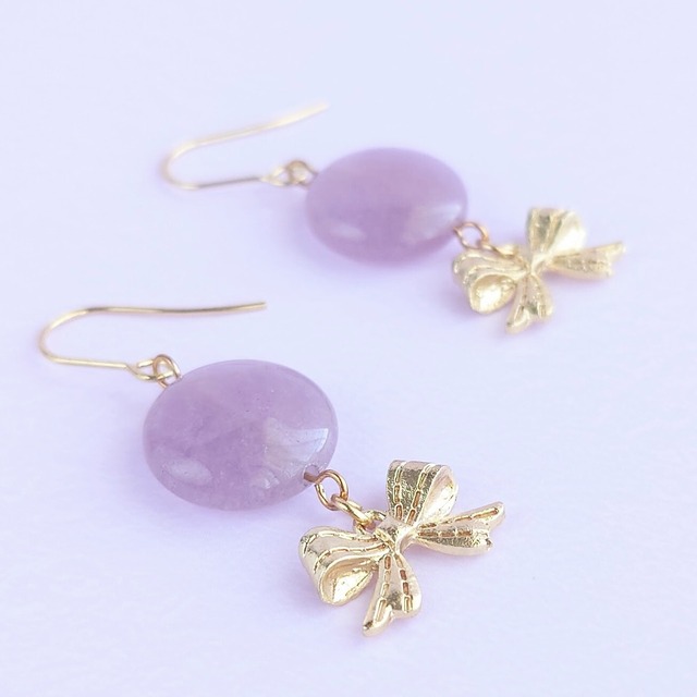 パープルの翡翠コインビーズにリボンチャームのゆれるピアス♡ リボンには絆、結びつき、約束といった意味のあるラッキーモチーフ♡ 大切な人へのプレゼントにもおすすめです。 サイズ:翡翠コインビーズ 15mm(6mm) リボンチャーム 縦10mm×横15mm ピアス金具含め全体で長さ45mm リボンチャーム以外はすべてサージカルステンレスにK18コーティングをしてあるものを使用しています。 ■購入の際の注意点 ・金属アレルギーには非対応ですので金属アレルギーの方はご利用をお控えください。 ・ピアス金具は一部サージカルステンレスへの変更が可能なものもありますのでご相談ください。 ・一部ニッケルフリーやK18メッキ、サージカルステンレスなど使用しているものもありますので商品説明の記載をご覧ください。 ・1点1点心を込めて丁寧に制作しておりますが、ハンドメイドのため左右のバランスが微妙に違うことがございます。 また、既製品よりもデリケートに出来ています。装着は丁寧に行なってください。