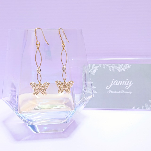 ツイストループにすかし蝶がゆれるピアス✨ 蝶には美・愛・復活といった意味があり、美や成長のシンボル✨縁起のいいラッキーモチーフ♪ サイズ:スカシ蝶 縦18mm×横25mm ツイストループピアス 40mm×10mm ピアス金具含め全体で長さ 74mm すべてニッケルフリーを使用、つりピアスはサージカルステンレスにK18コーティングをしてあるものを使用しています。 ■購入の際の注意点 ・金属アレルギーには非対応ですので金属アレルギーの方はご利用をお控えください。 ・1点1点心を込めて丁寧に制作しておりますが、ハンドメイドのため左右のバランスが微妙に違うことがございます。 また、既製品よりもデリケートに出来ています。装着は丁寧に行なってください。
