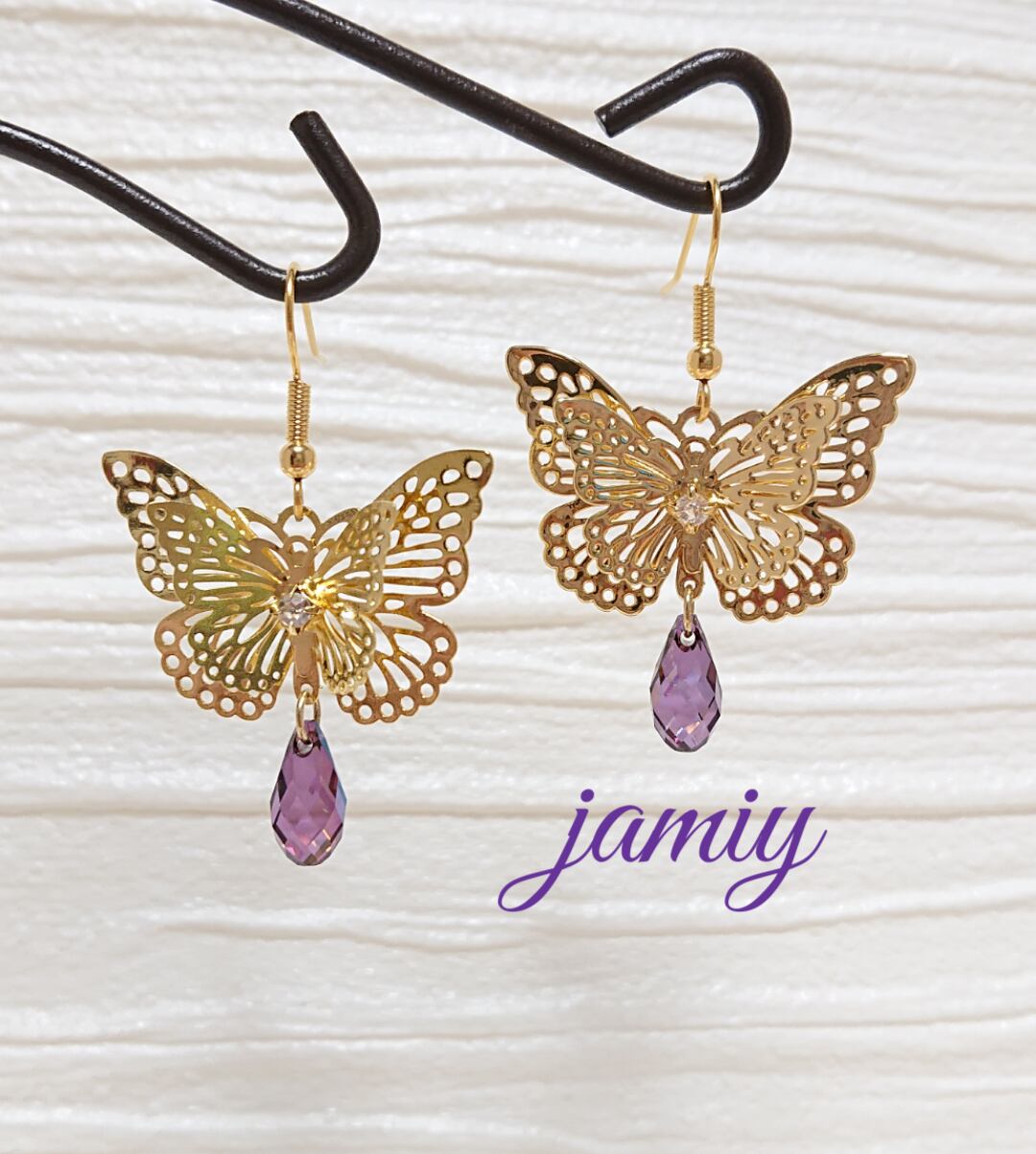 蝶は立体的でゴージャスに耳元に揺れます。しずく型のクリスタルは紫色がみる方向によって微妙に色が変化します。