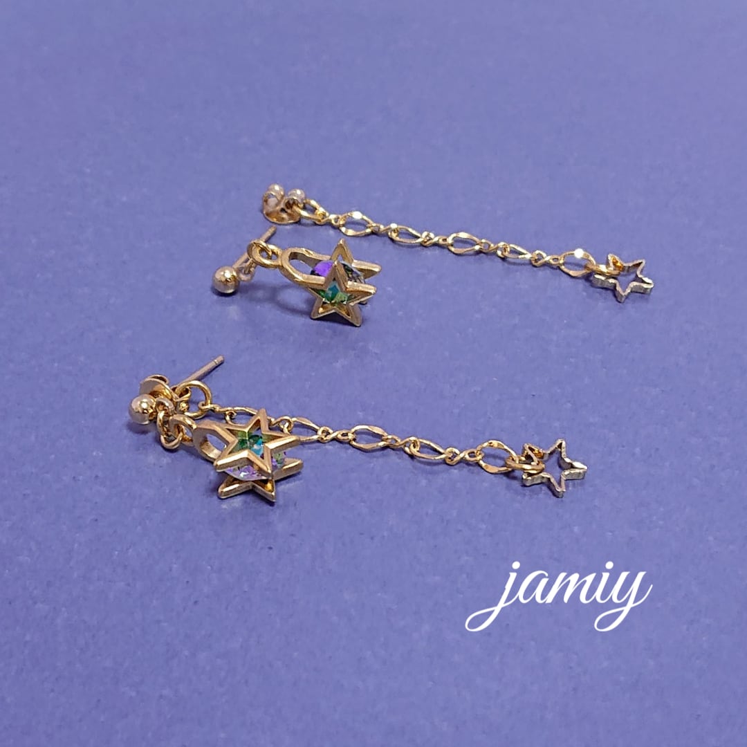 ピアスキャッチにチェーンと星をつけてあります✨ピアスキャッチはお手持ちのピアスにあわせていただくことも可能に✨自分でアレンジして楽しんでみてください♪