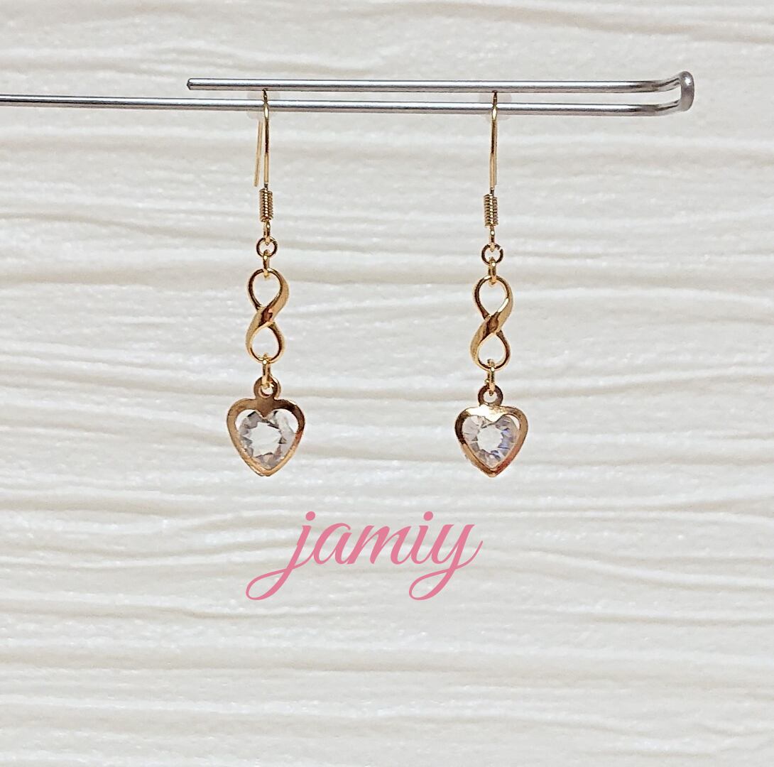 インフィニティパーツにハートの中にガラスの入ったパーツをあわせゆれるピアス✨