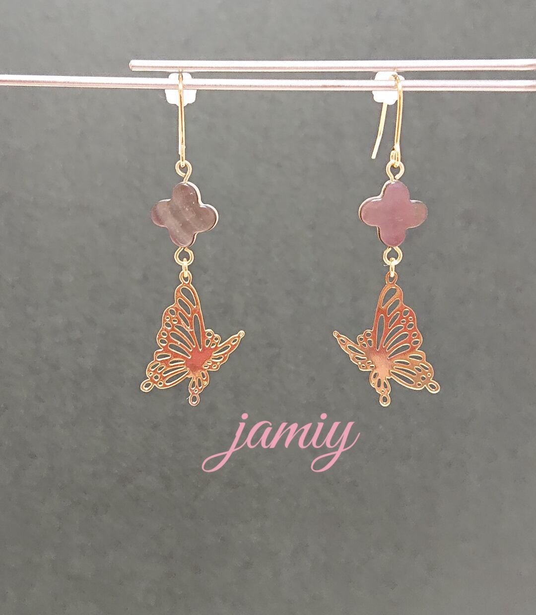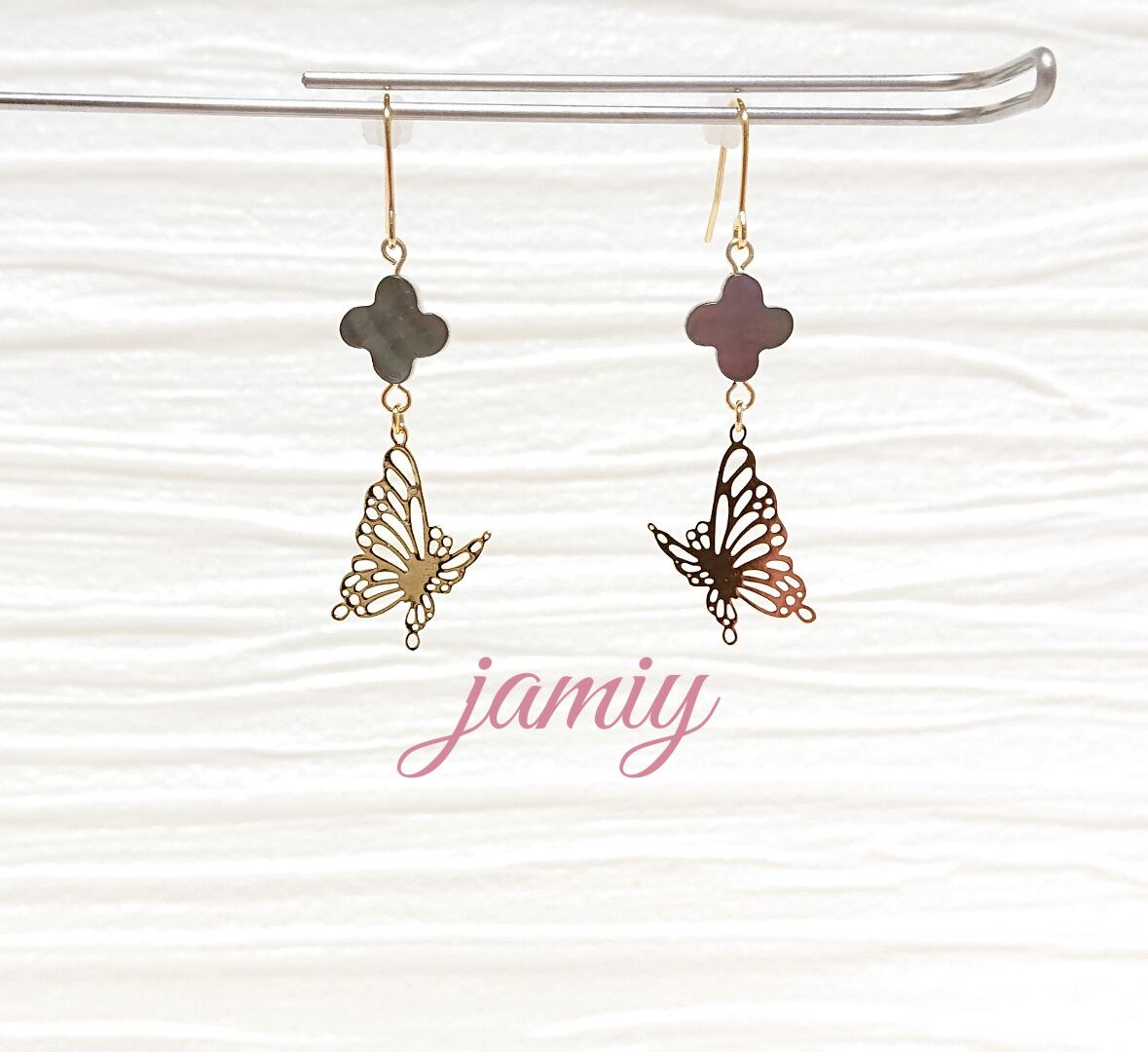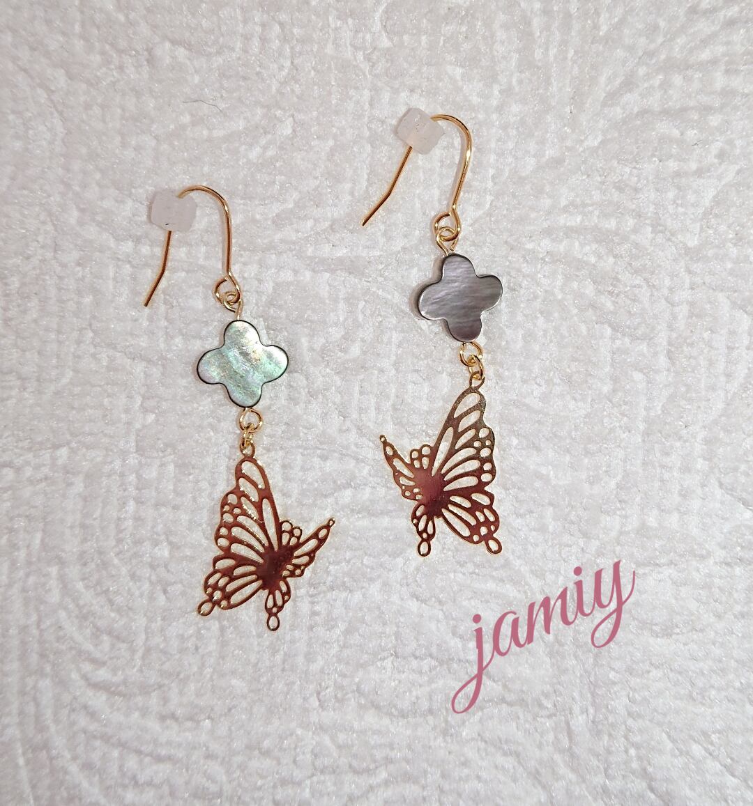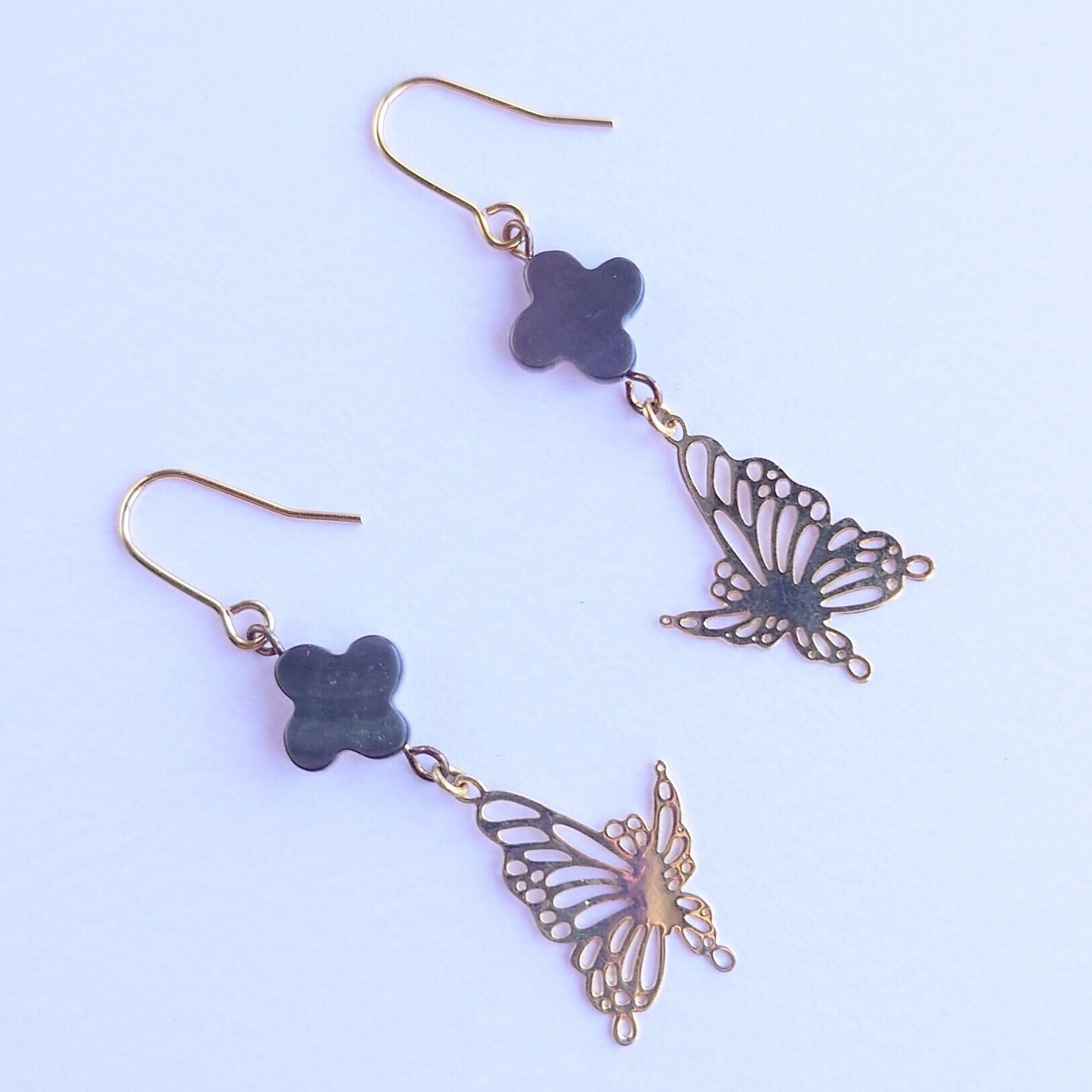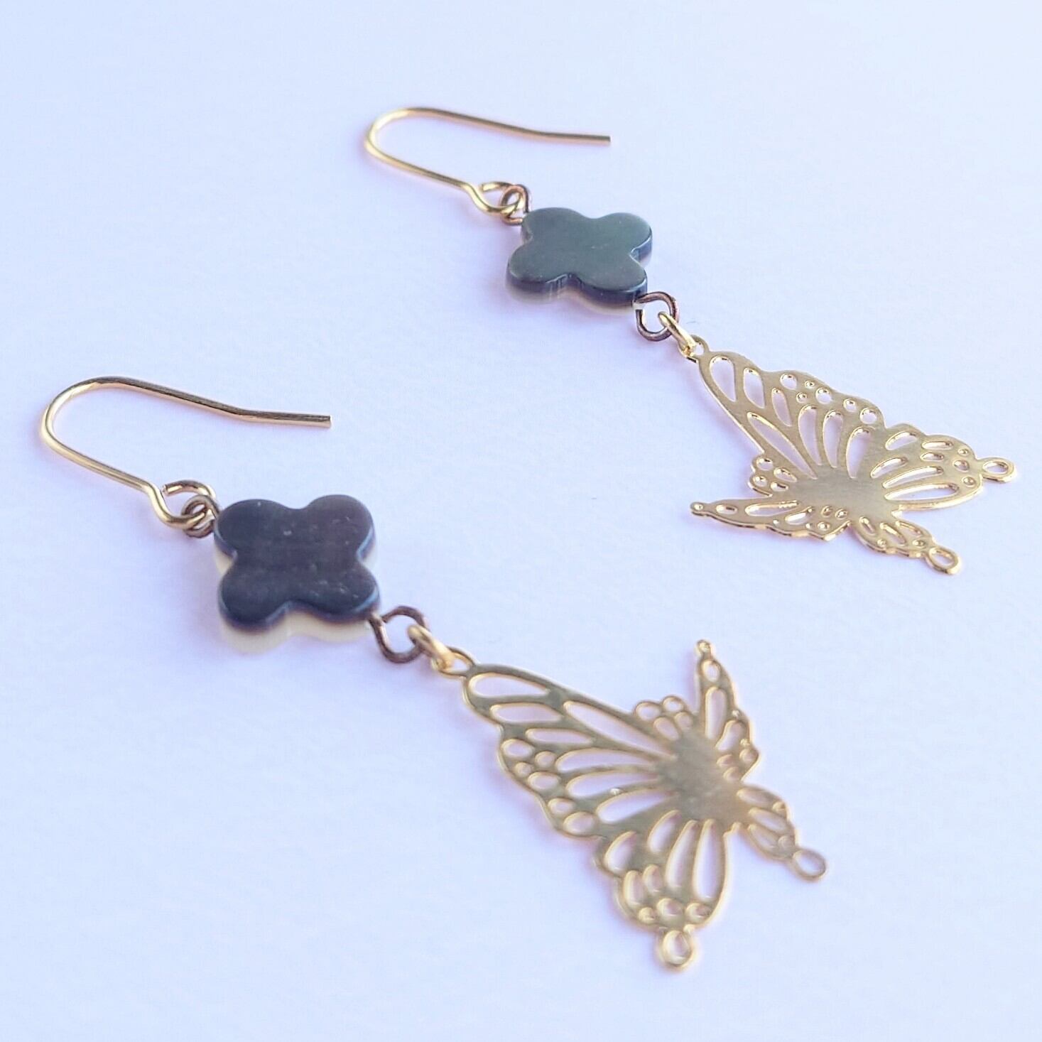 黒蝶貝のフラワーシェルパーツにすかし蝶をあわせゆれるピアス✨