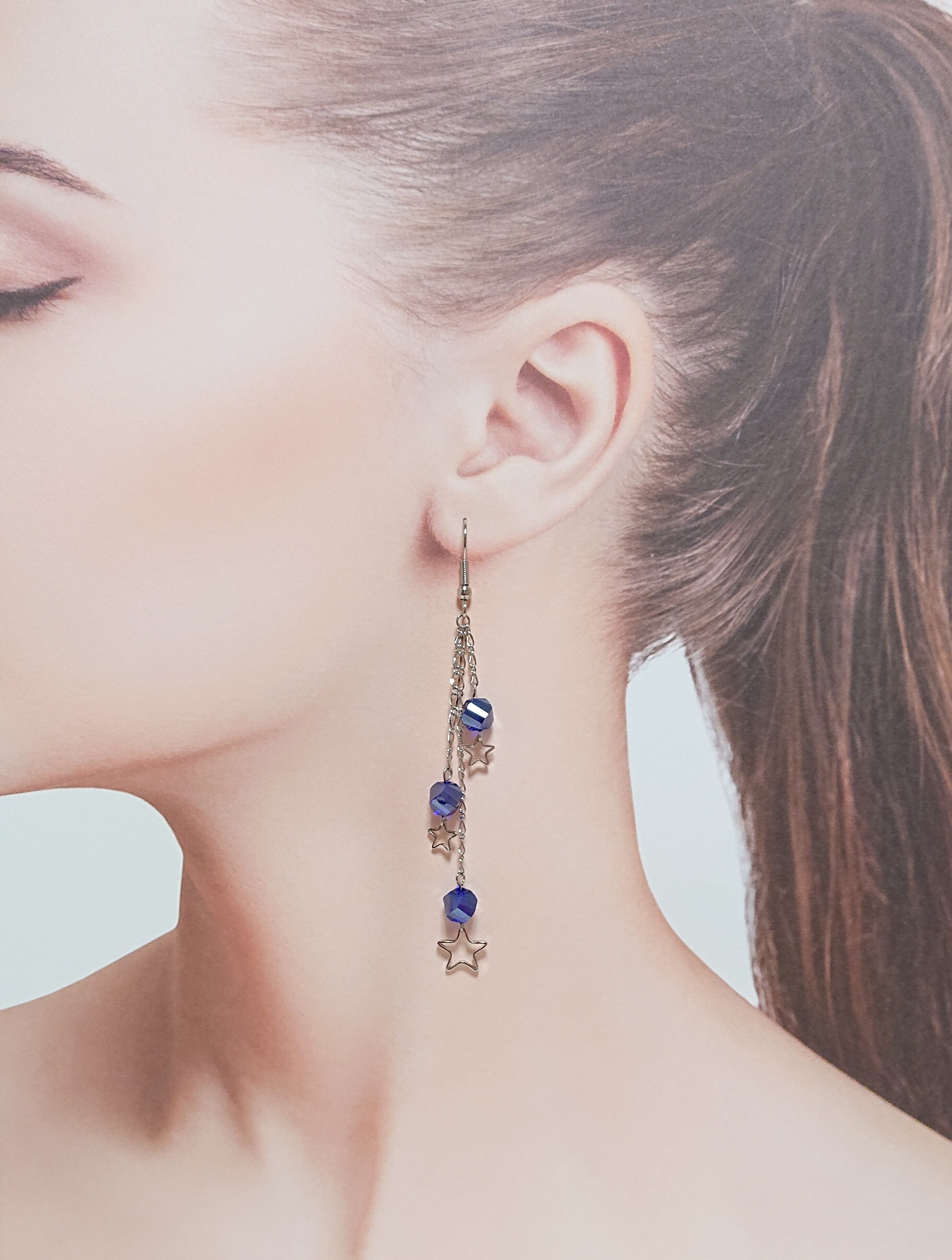 長さの違うチェーンにブルーのツイストガラスに星のチャームでゆれるピアス✨