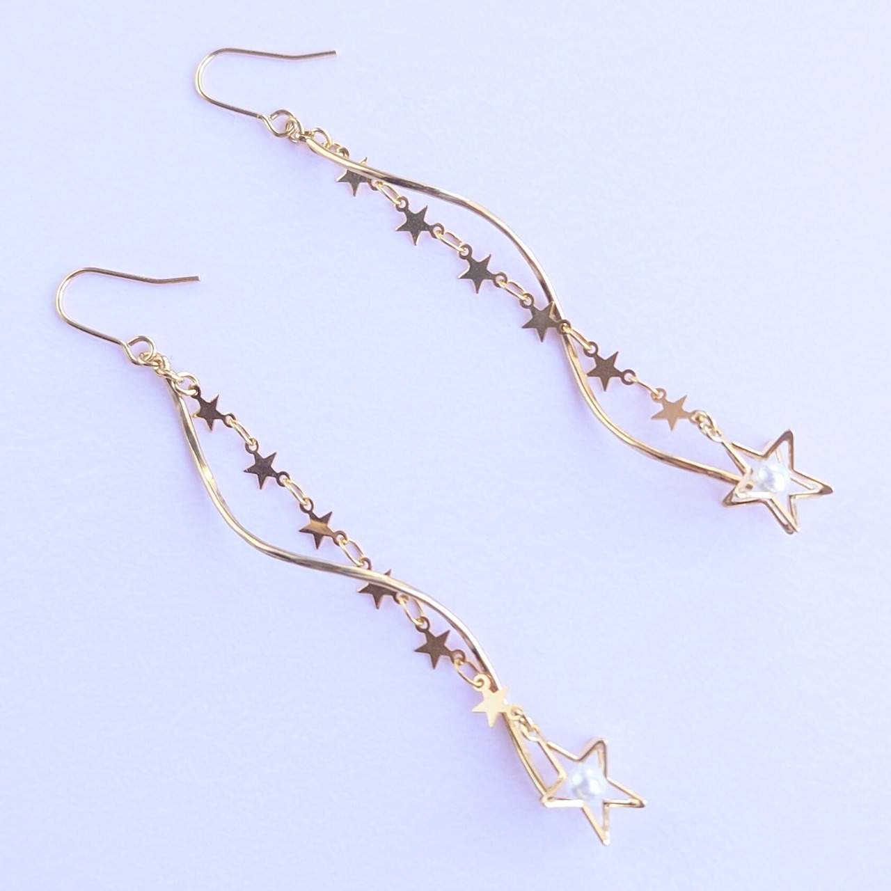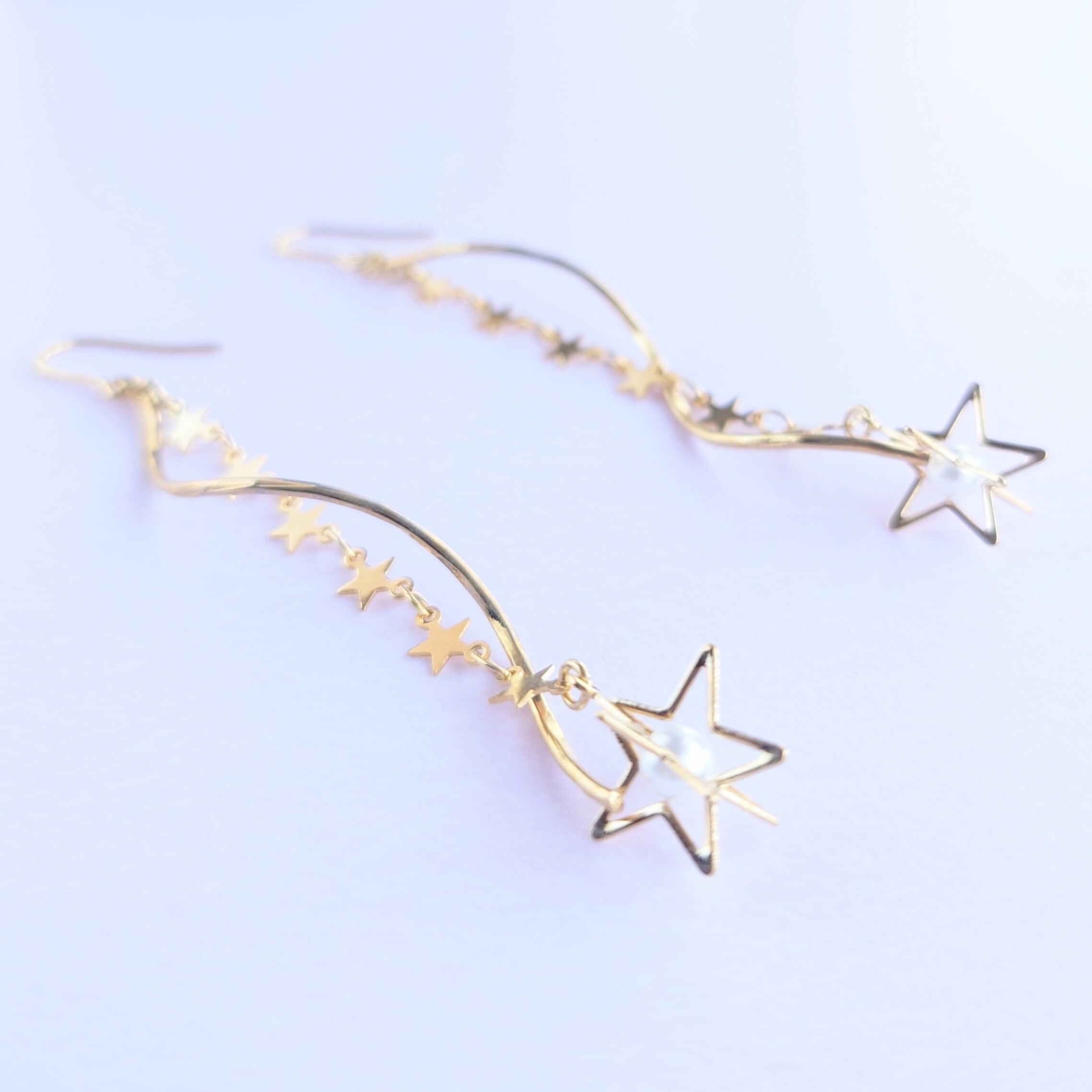 流れる曲線のウェーブパーツに星のチェーンにホワイトのパールが入った立体的な星のパーツをあわせて長さのあるゆれるピアス✨流れ星のようなイメージです✨