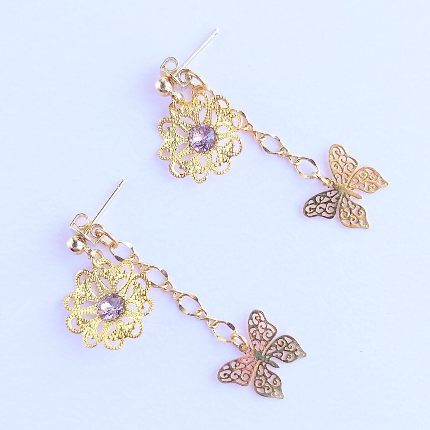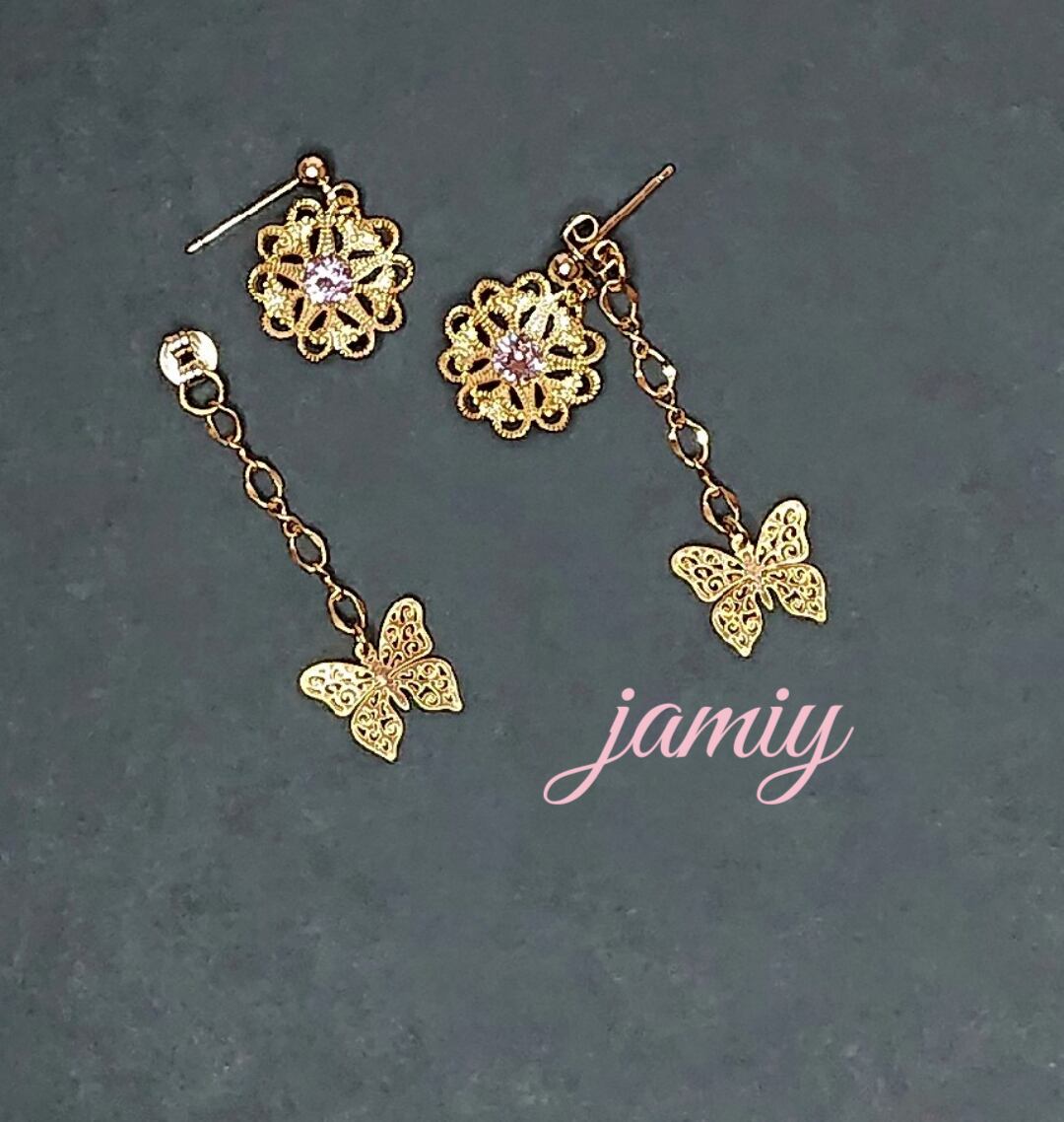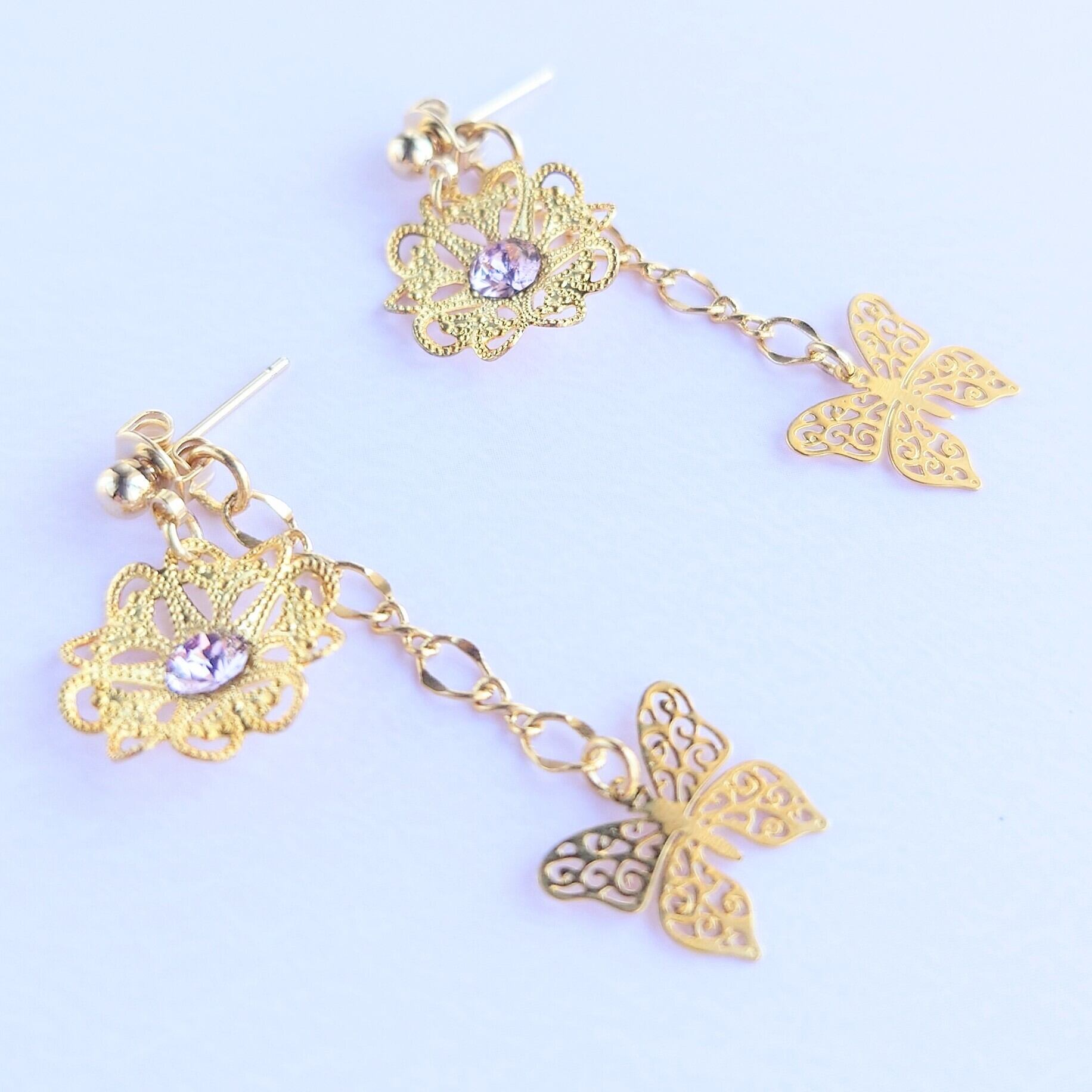 ピアスキャッチにスカシ蝶をチェーンで垂らしお花の後ろで華奢にゆれるピアスに✨
