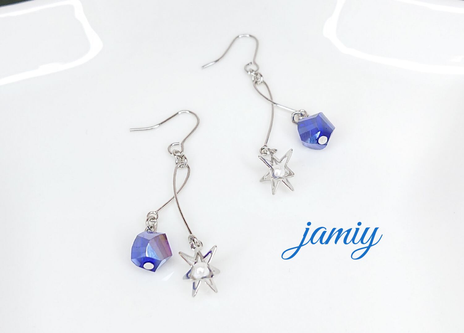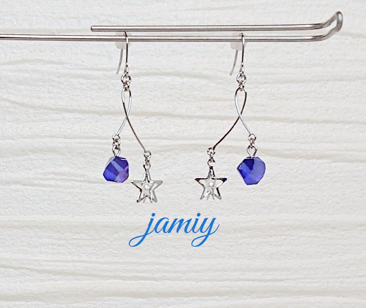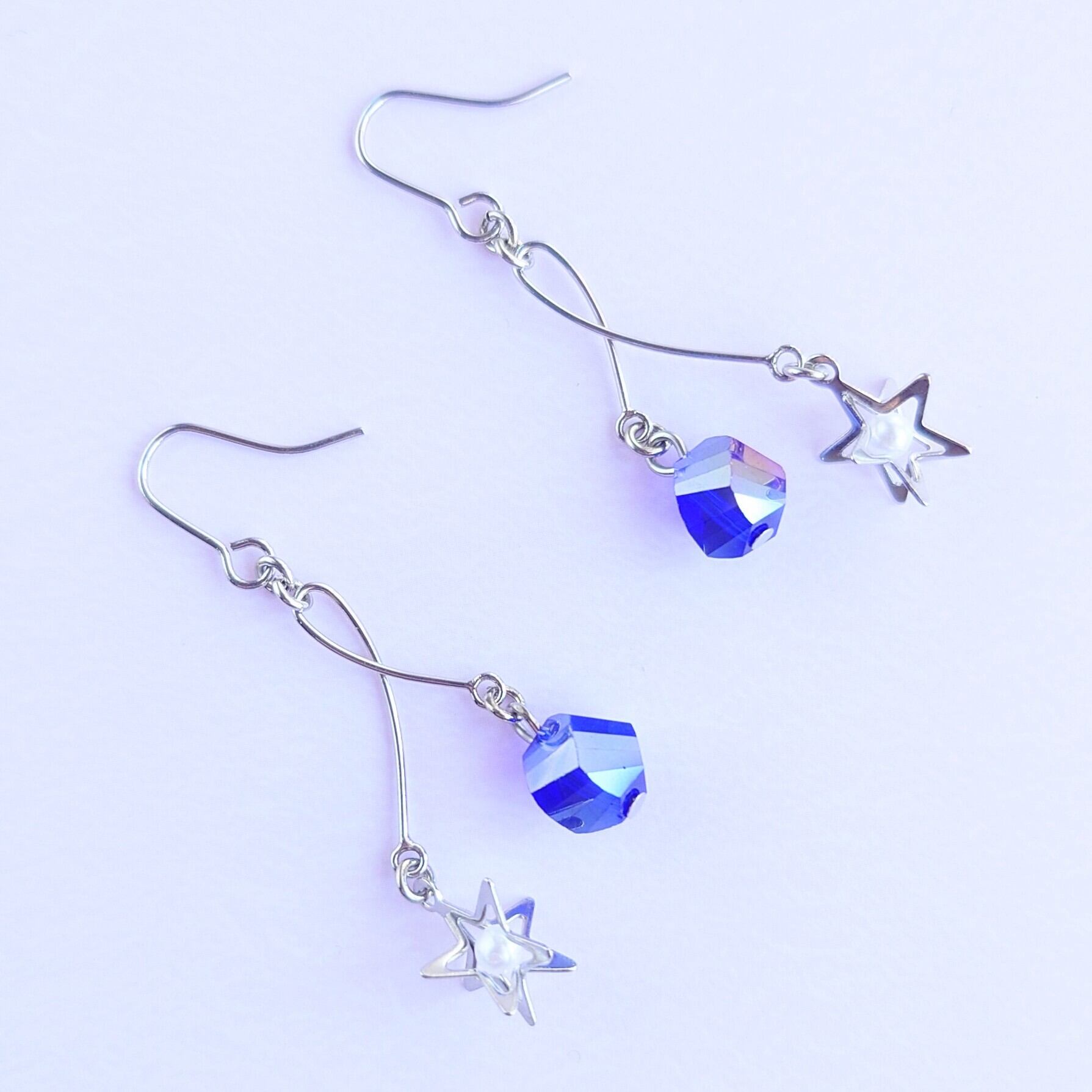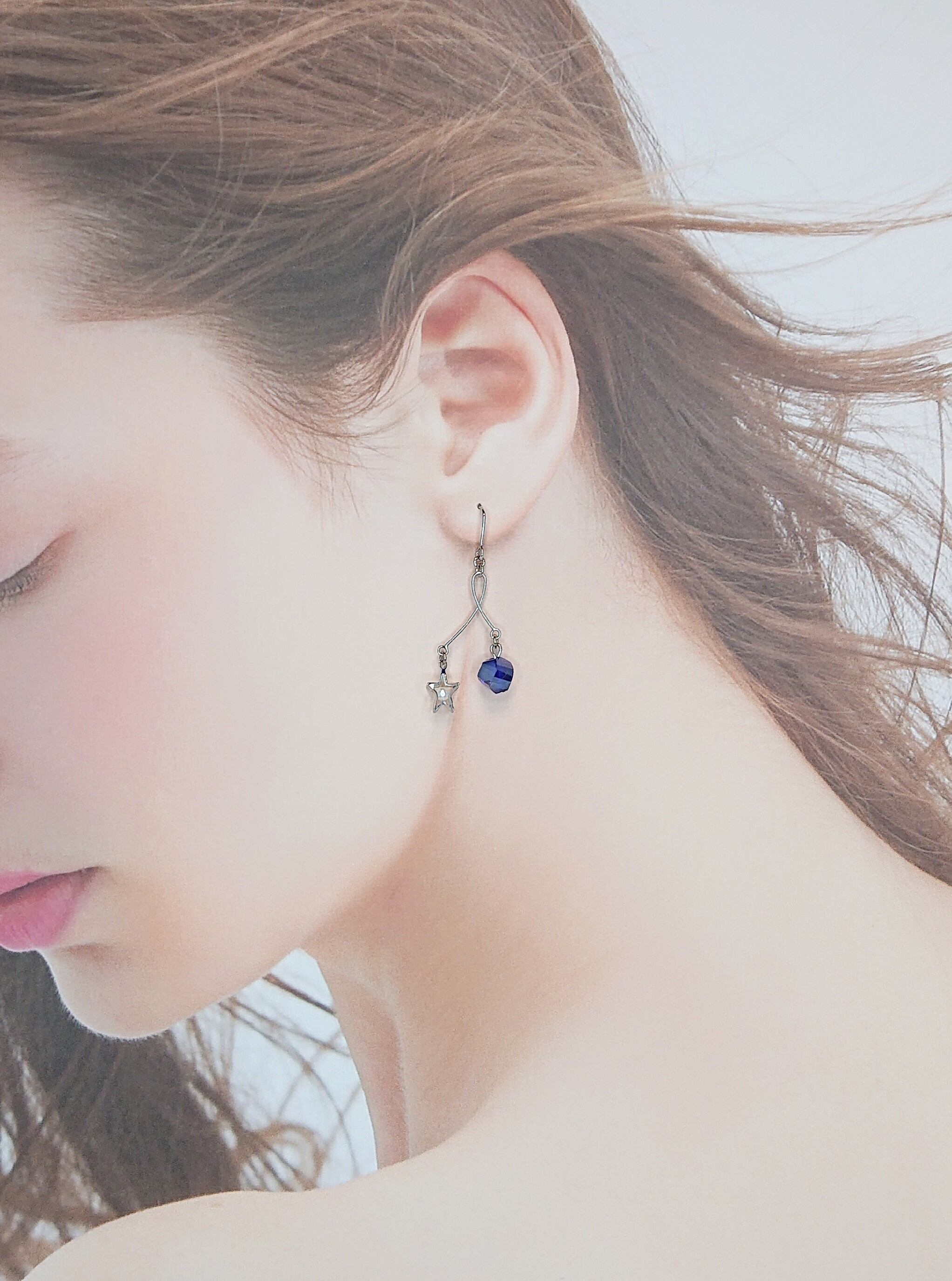 長さの違うスウィングパーツにホワイトのパールが入った立体的な星のパーツとキレイなブルーのツイストガラスで華奢な大人可愛いピアス✨