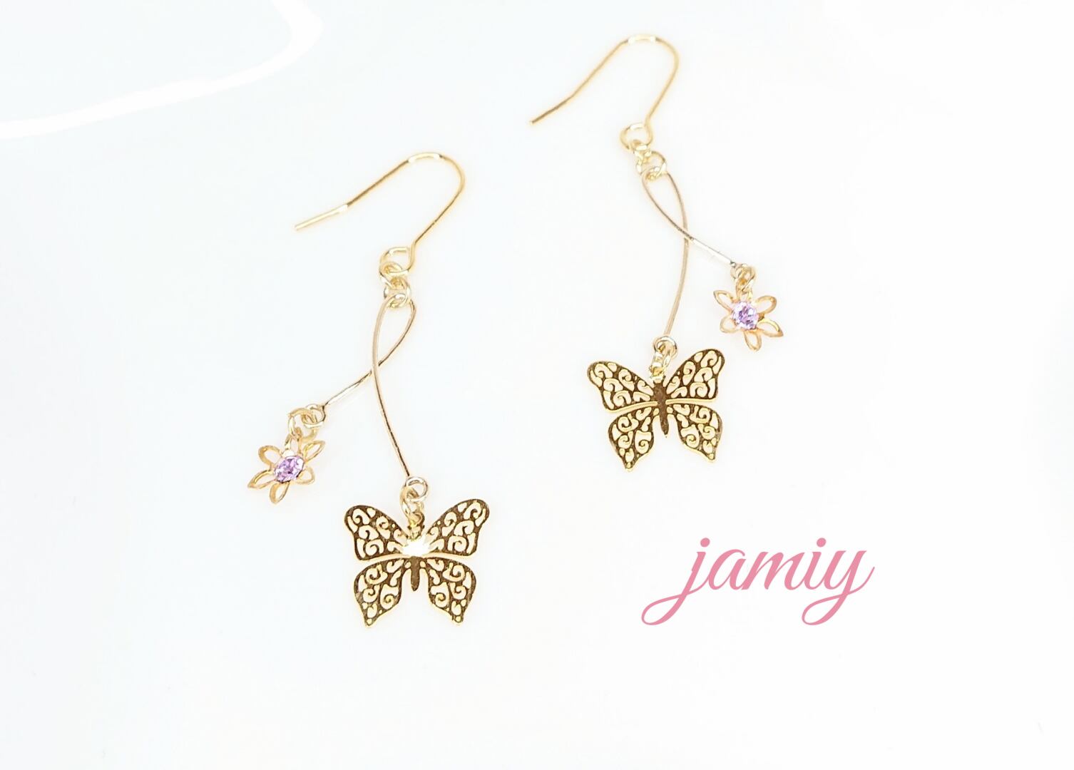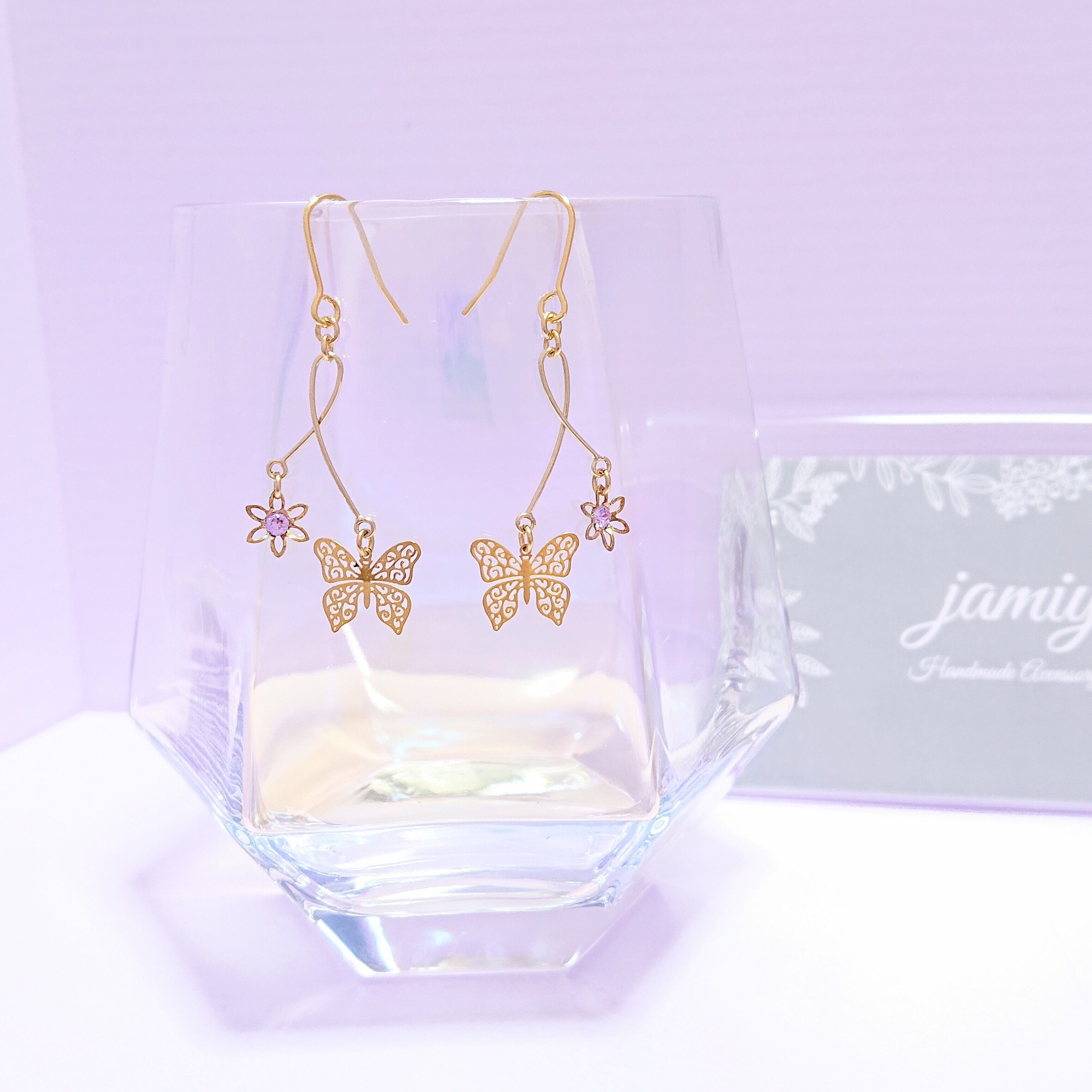 長さの違うスウィングパーツに蝶と小さなお花で華奢な大人可愛いピアス✨