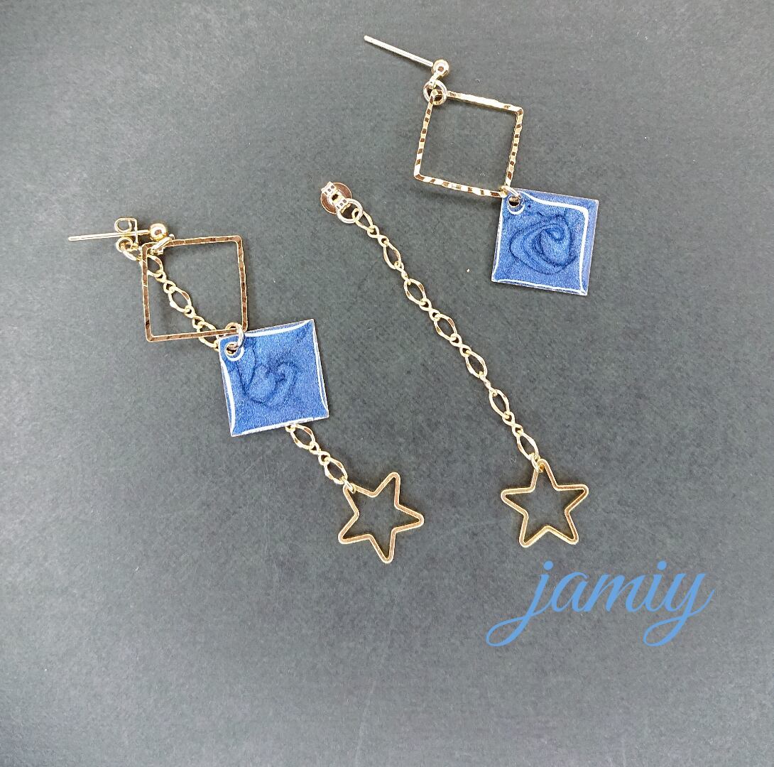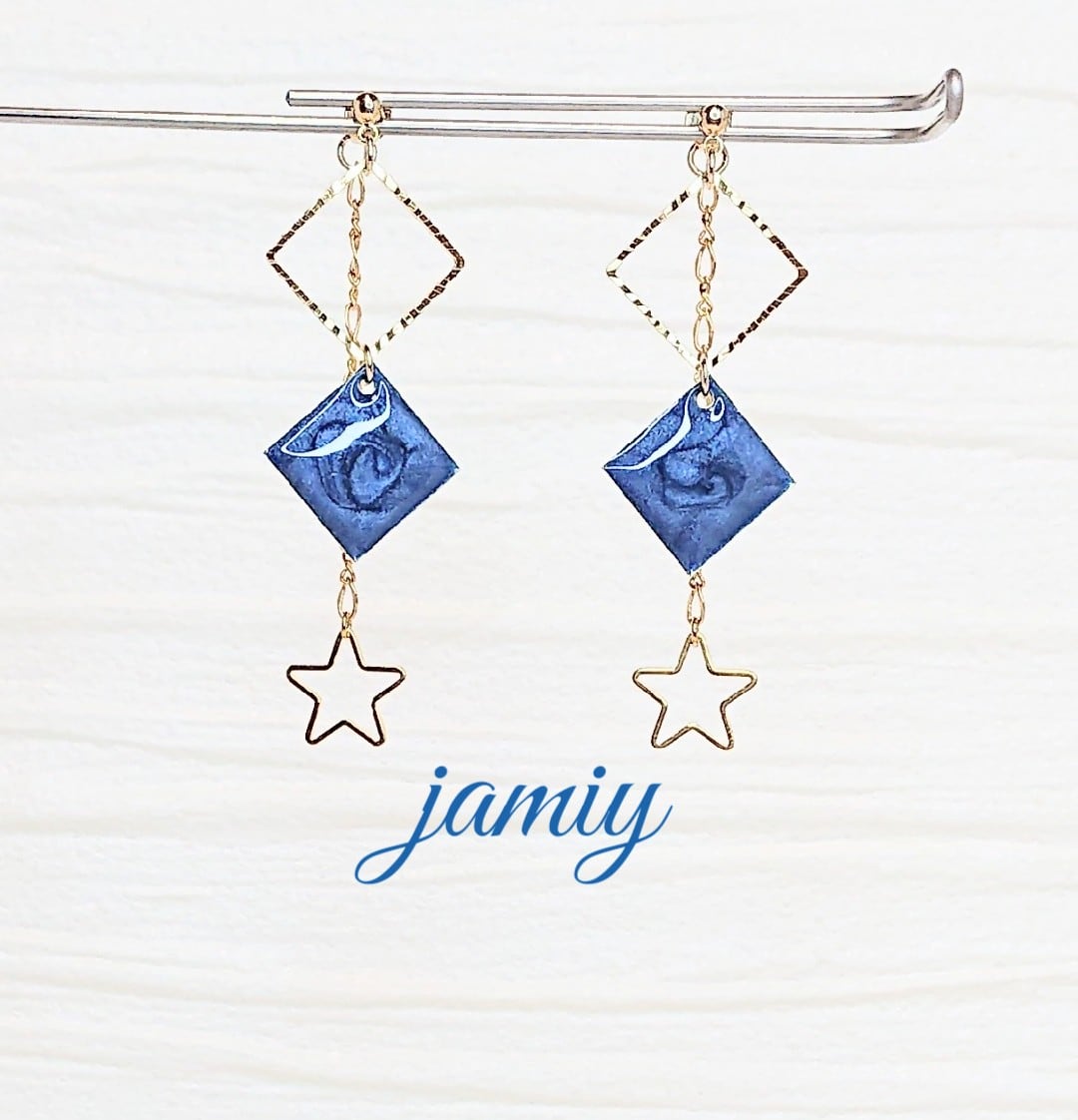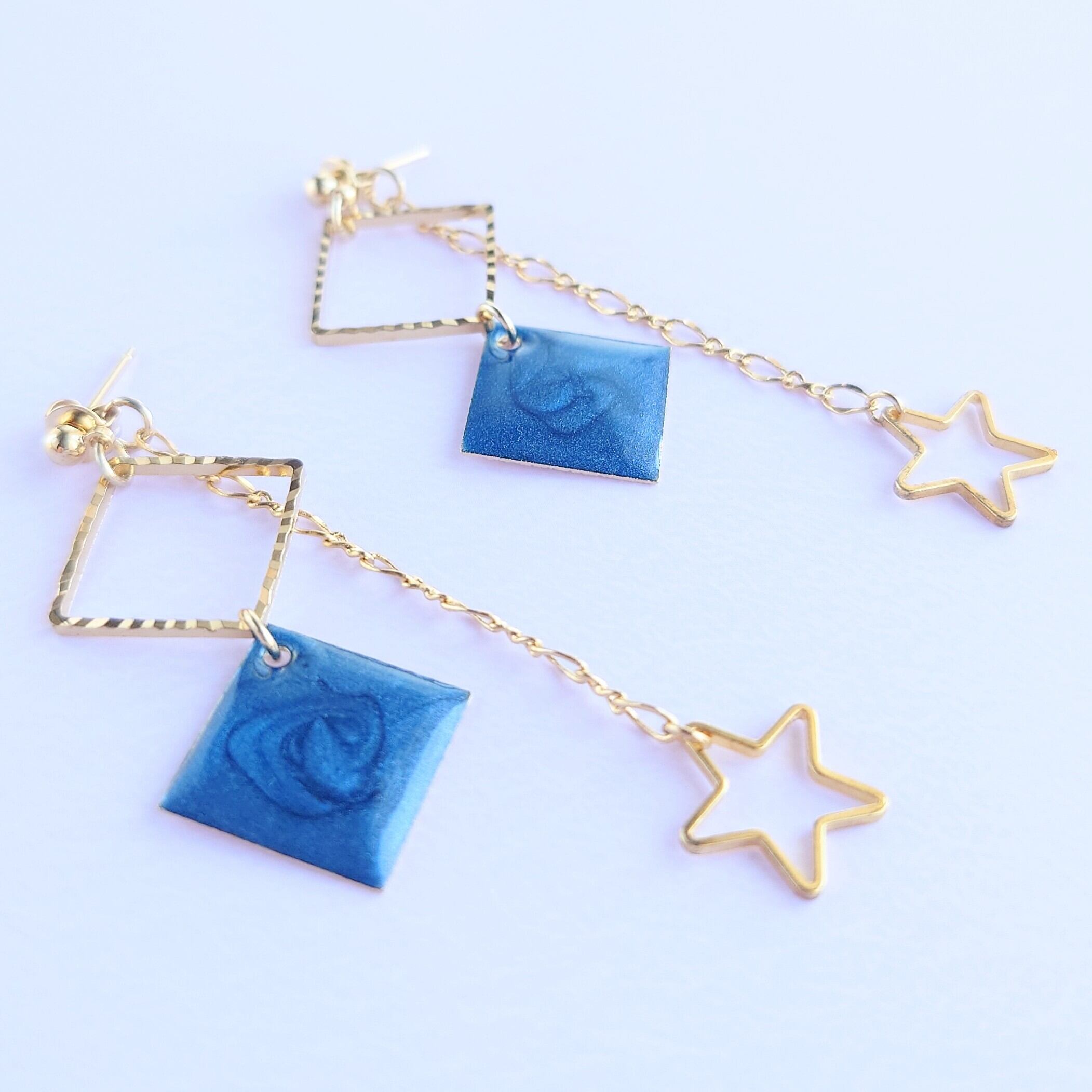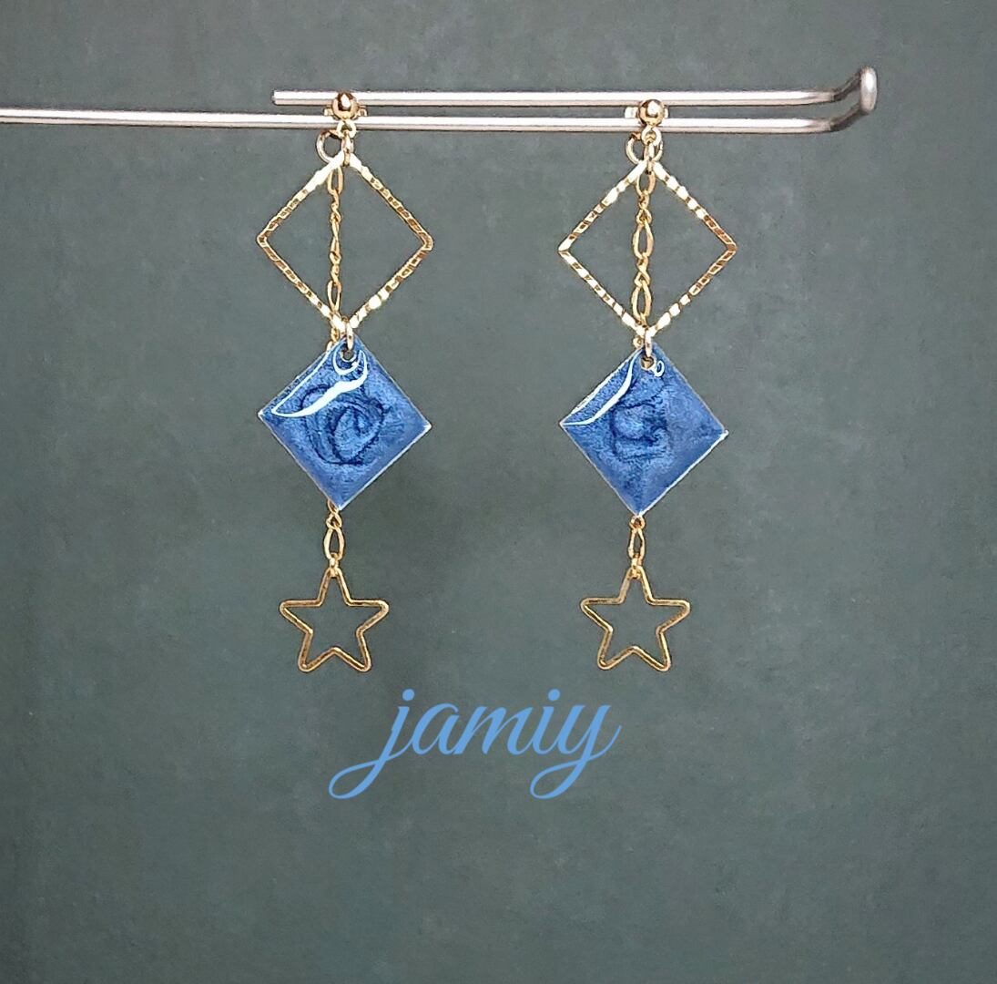 ひし形のメタルフープとひし形のネイビープレートにピアスキャッチにチェーンで星をつけてゆれるピアス✨