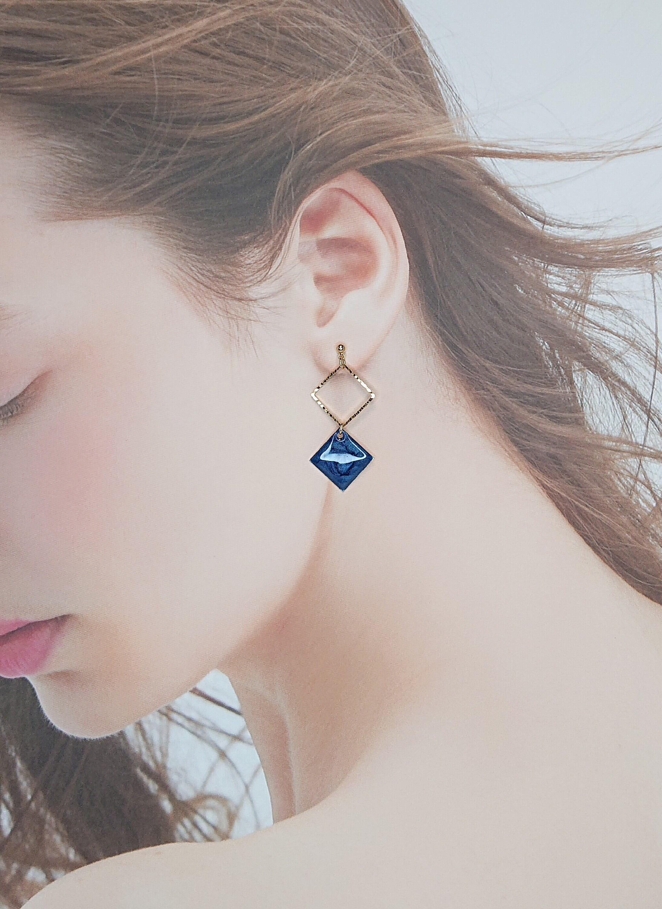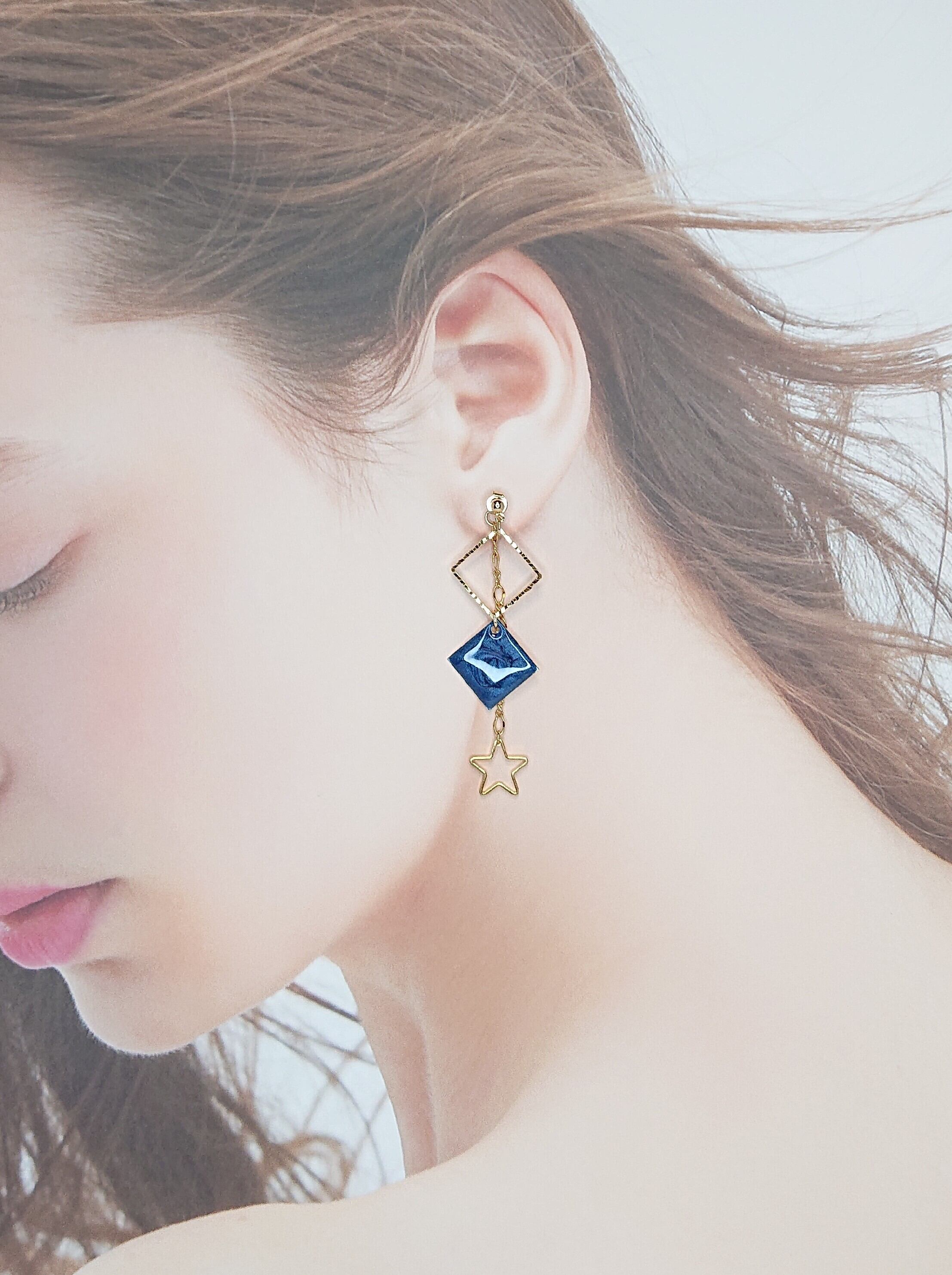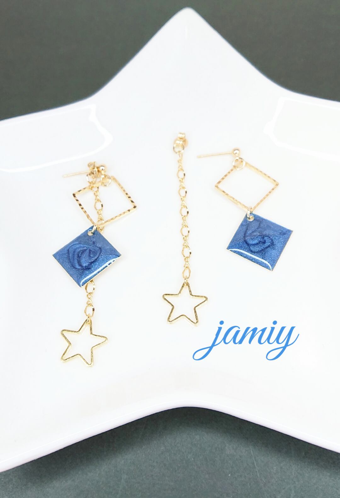 ひし形のメタルフープとひし形のネイビープレートにピアスキャッチにチェーンで星をつけてゆれるピアス✨