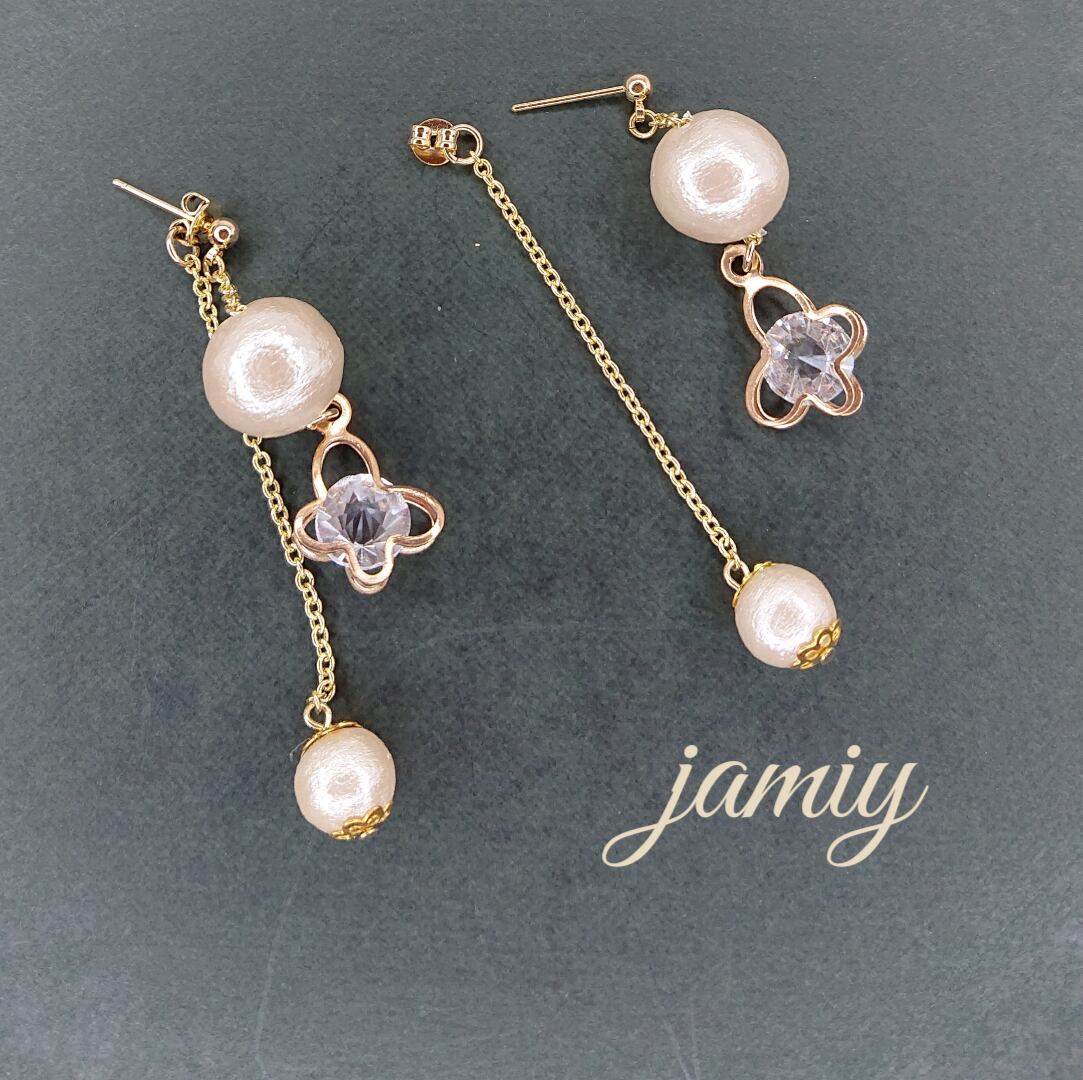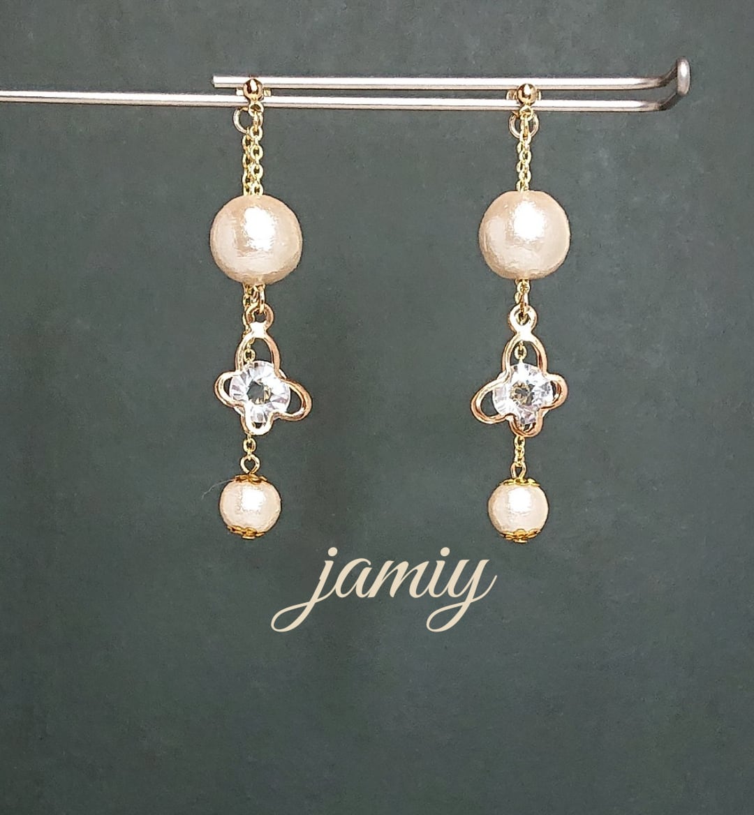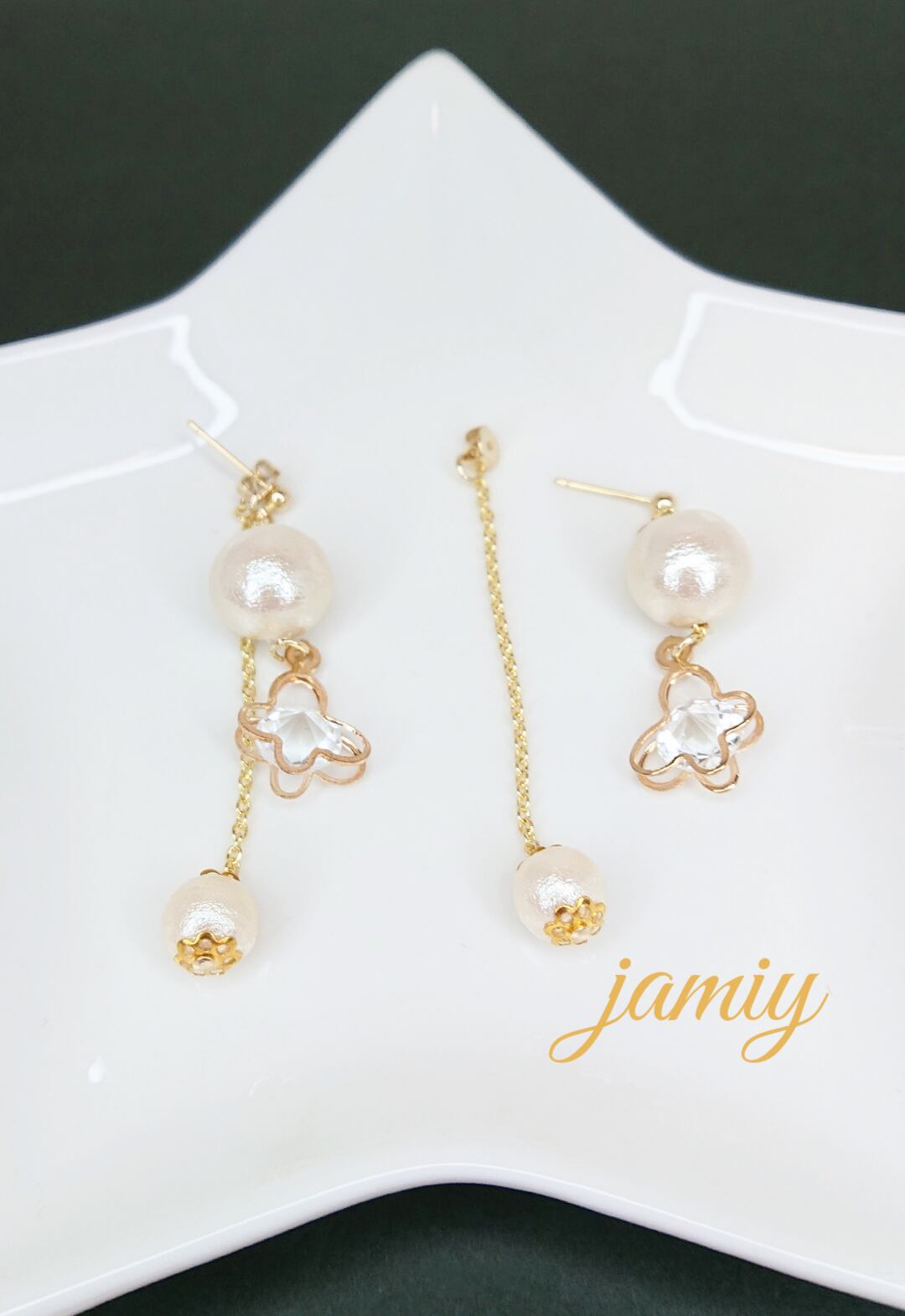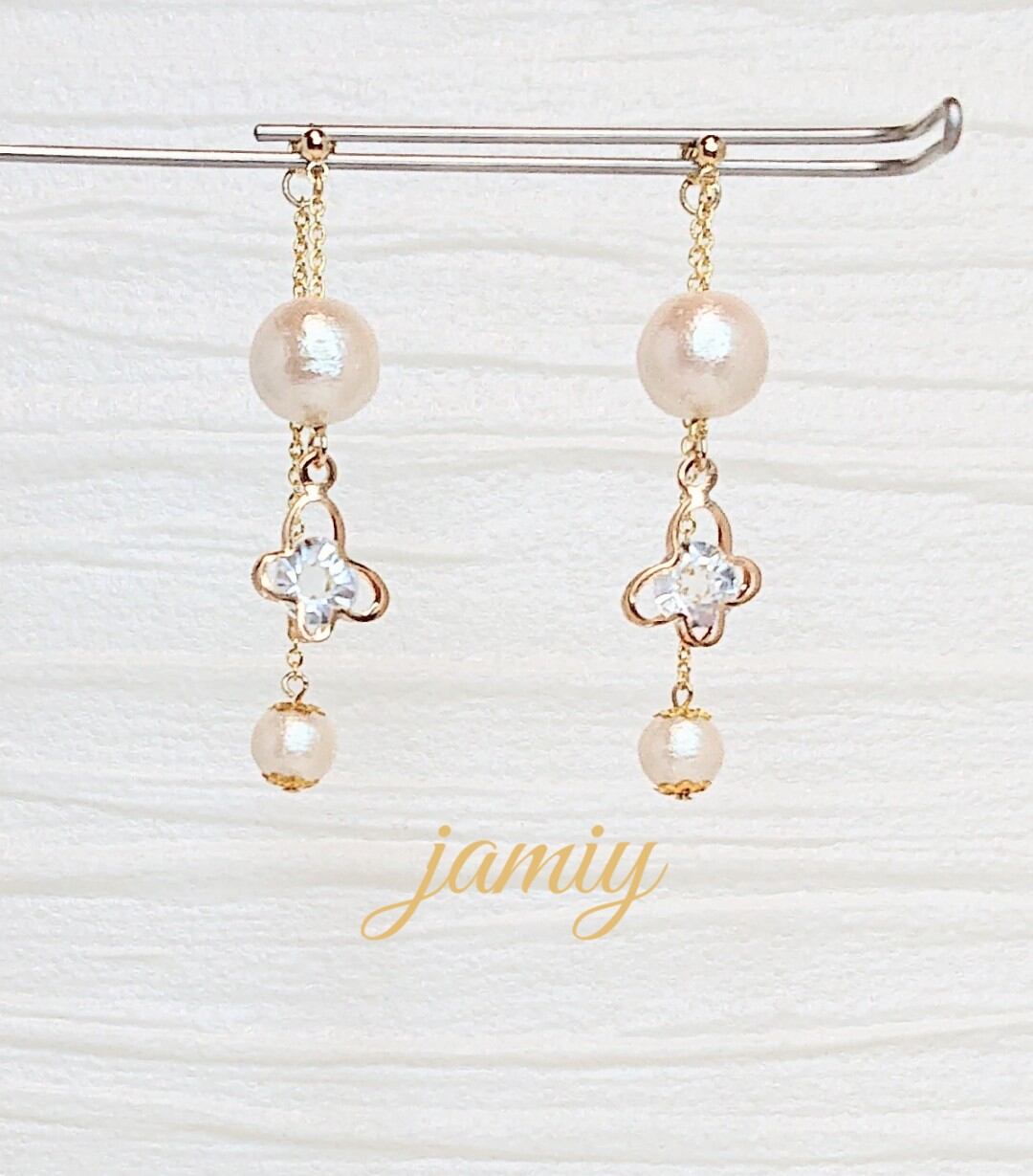12mmのコットンパールに蝶の中にガラスの入ったパーツをあわせ、ピアスキャッチにチェーンで8mmのコットンパールに花座をつけて大人かわいいゆれるピアス✨