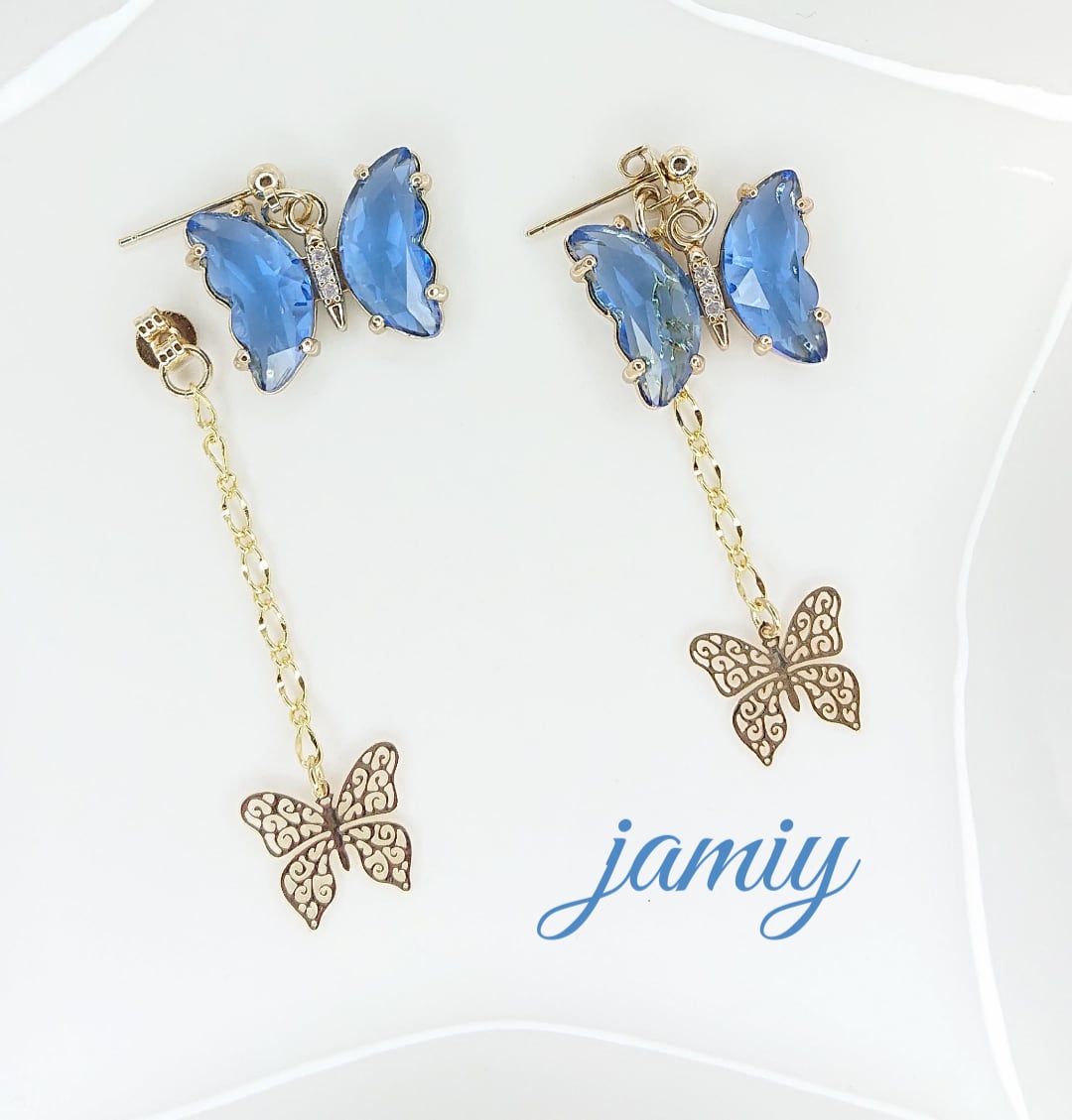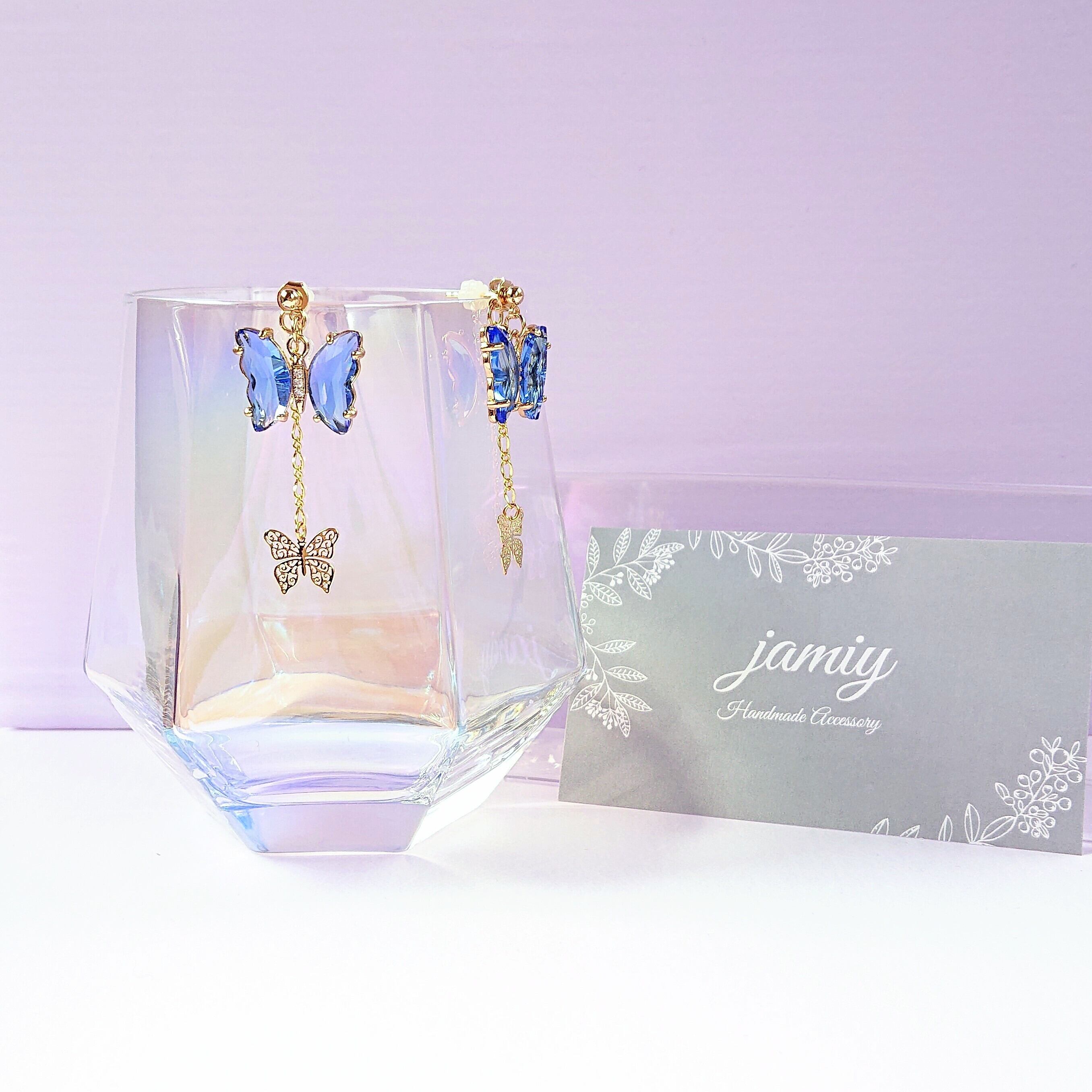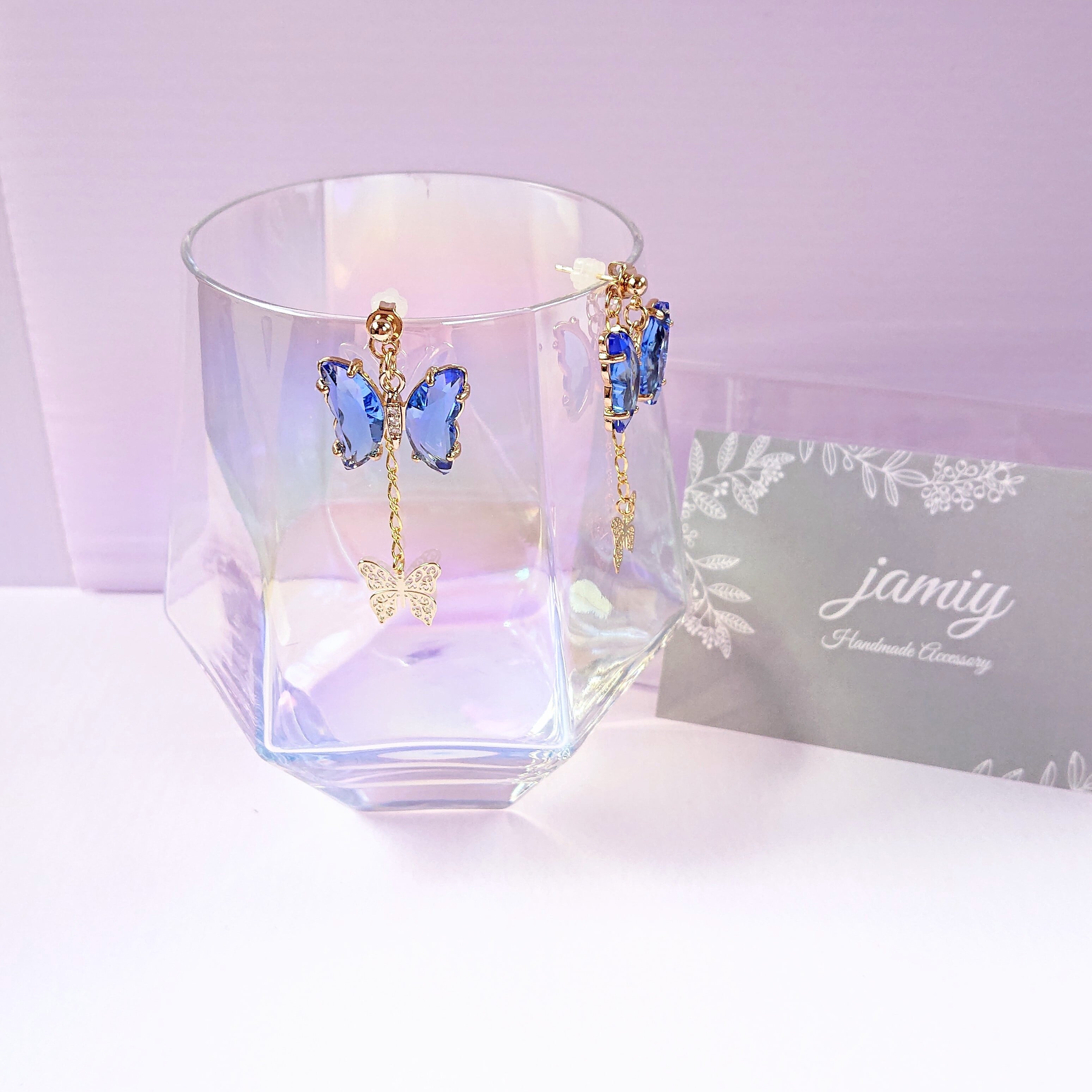 ブルーのガラス蝶チャームにピアスキャッチにチェーンで蝶をつけてゆれるピアス✨ピアスキャッチはお手持ちのピアスにあわせていただくことも可能に✨自分でアレンジして楽しんでみてください♪