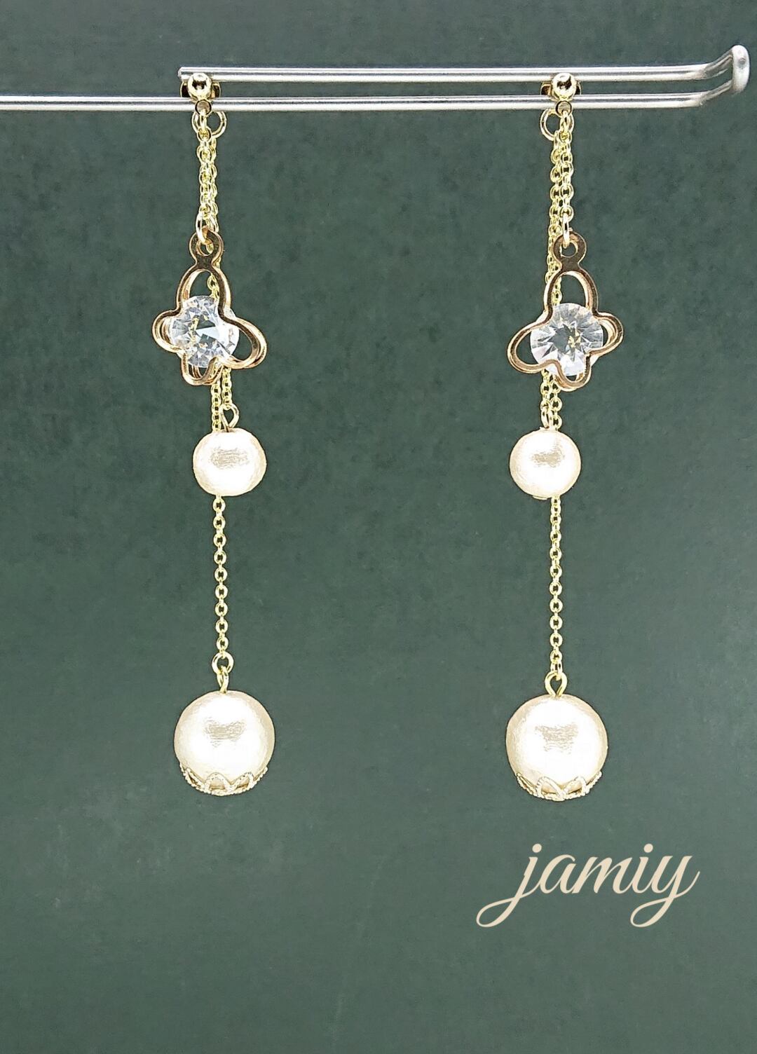 チェーンに蝶の中にガラスの入ったパーツと8mmのコットンパールあわせ、ピアスキャッチにチェーンで12mmのコットンパールに花座をつけて大人かわいいゆれるピアス✨