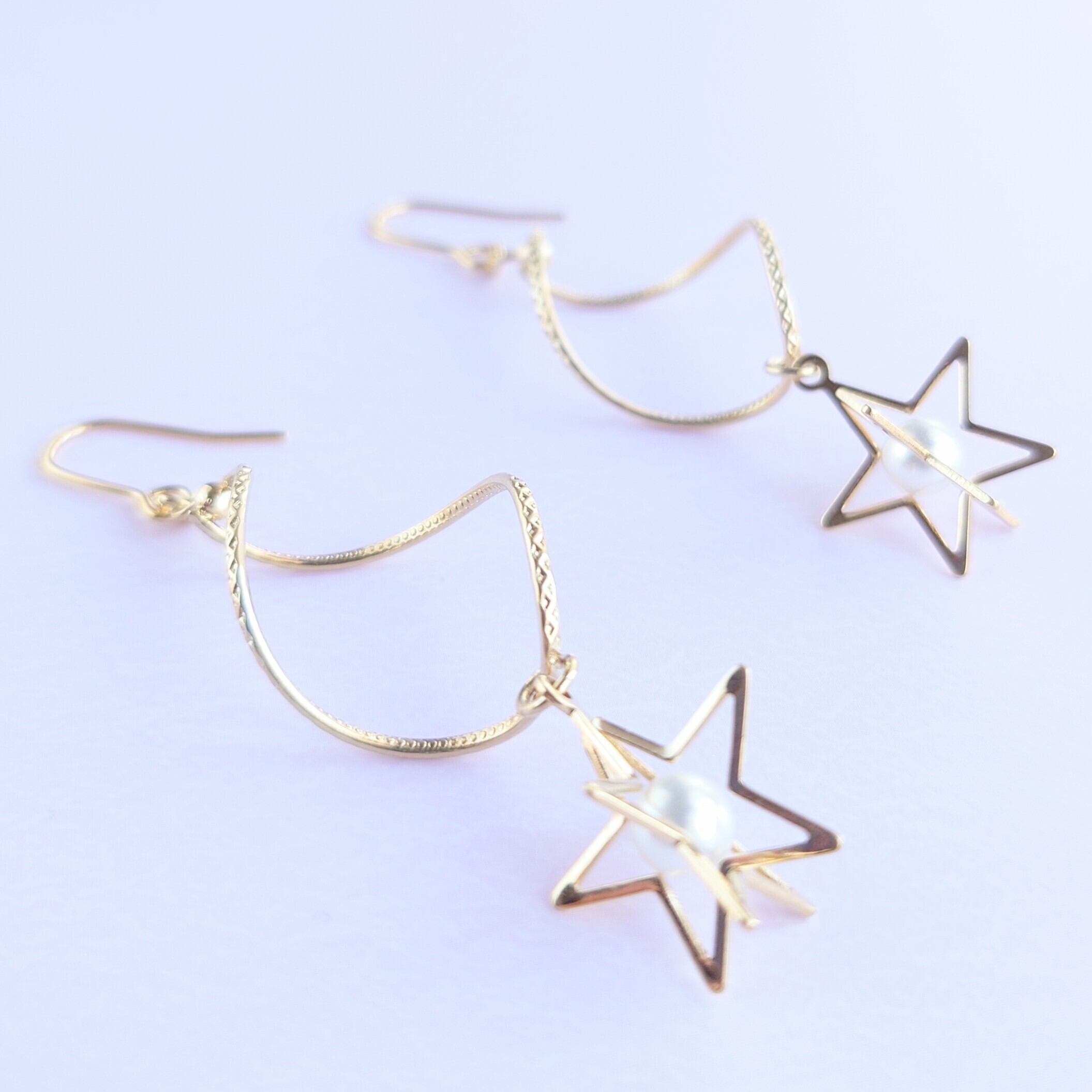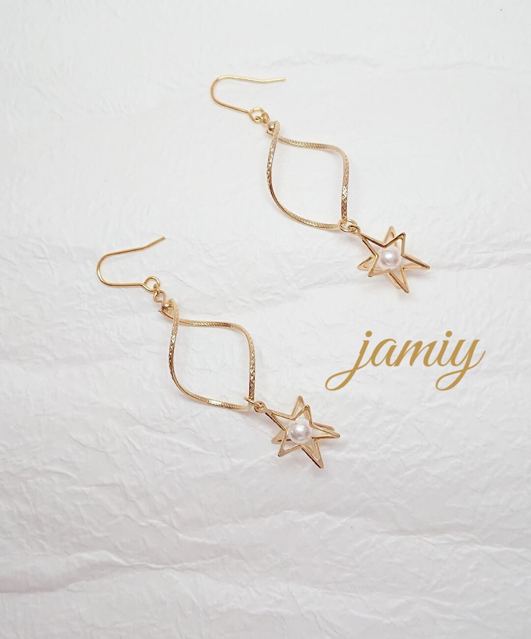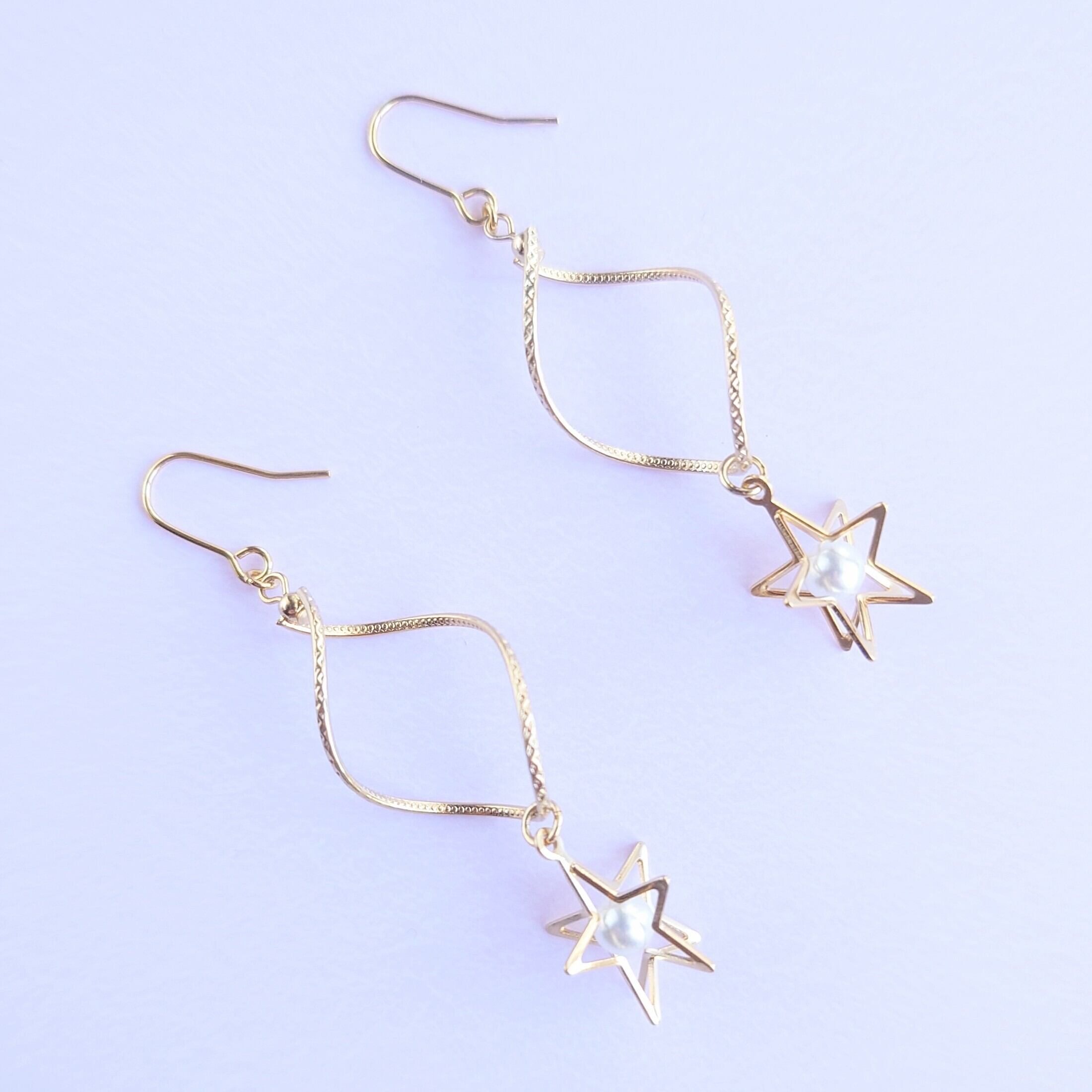 ツイストドロップにホワイトのパールが入った立体的な星のパーツをつけてゆれるピアスに✨大人っぽく上品な感じのピアスです✨