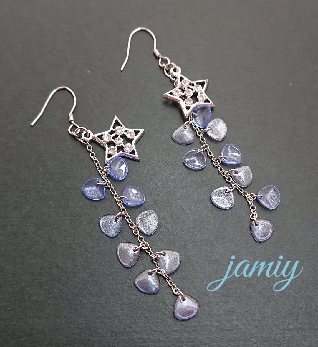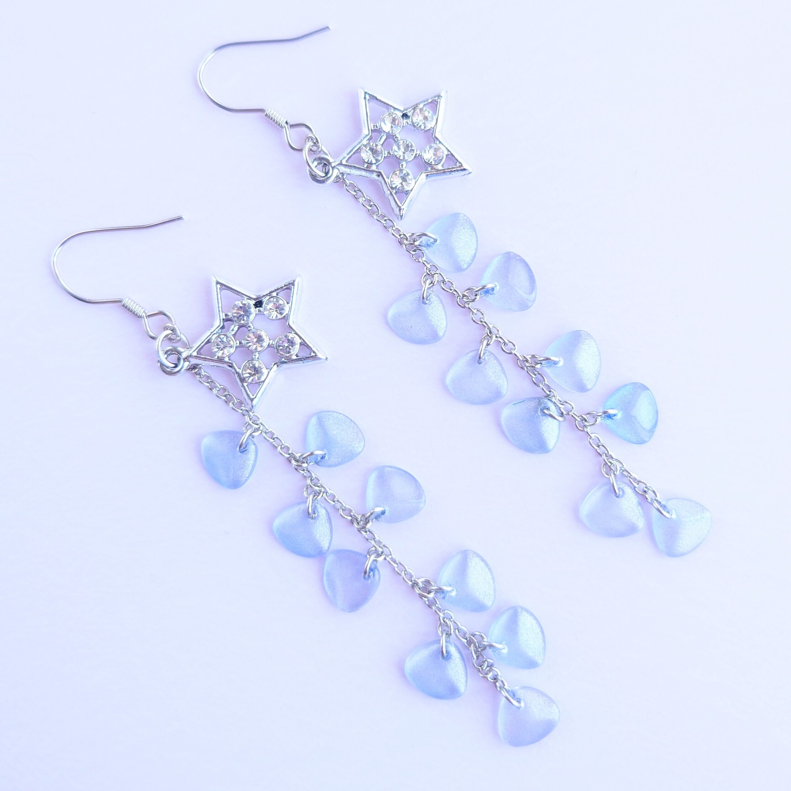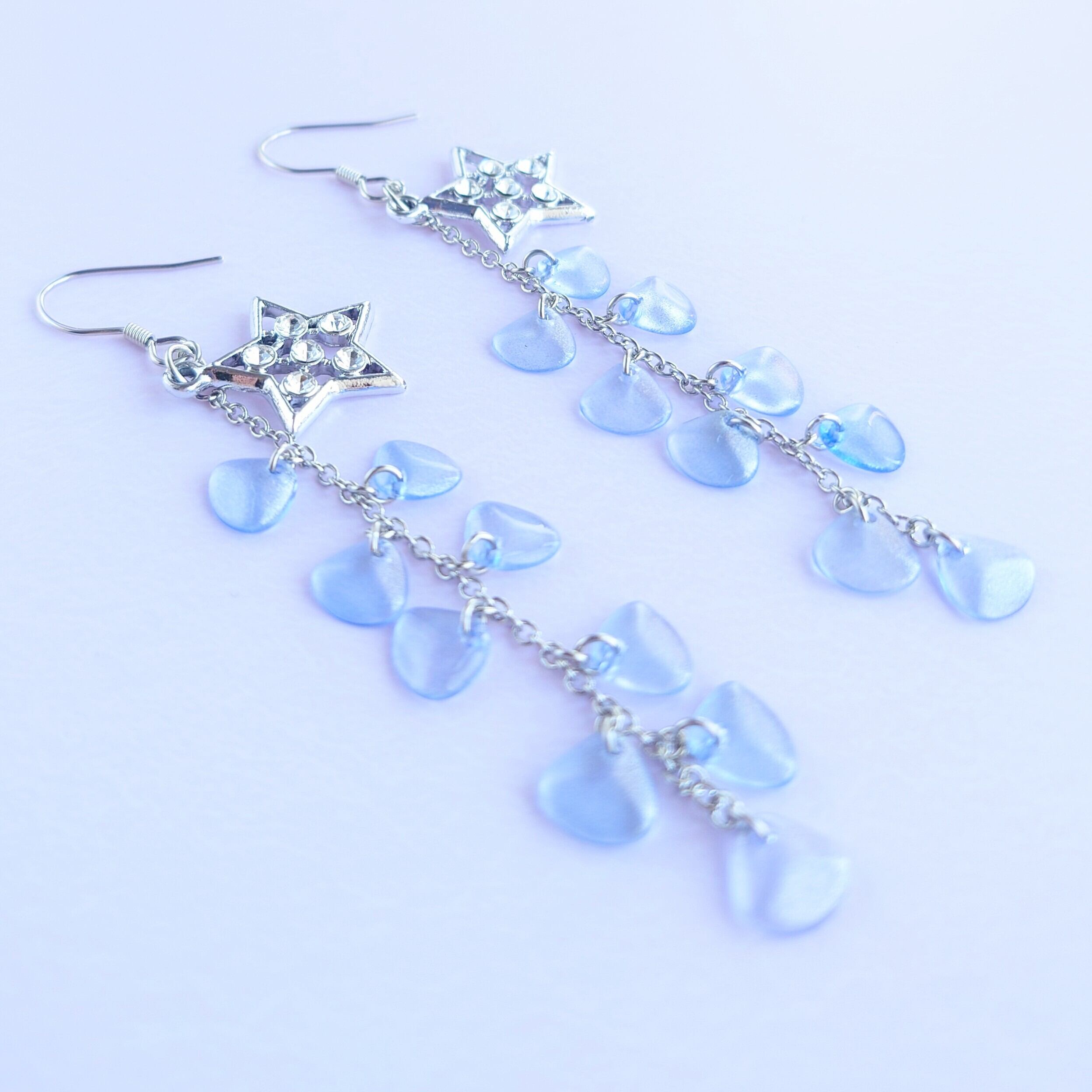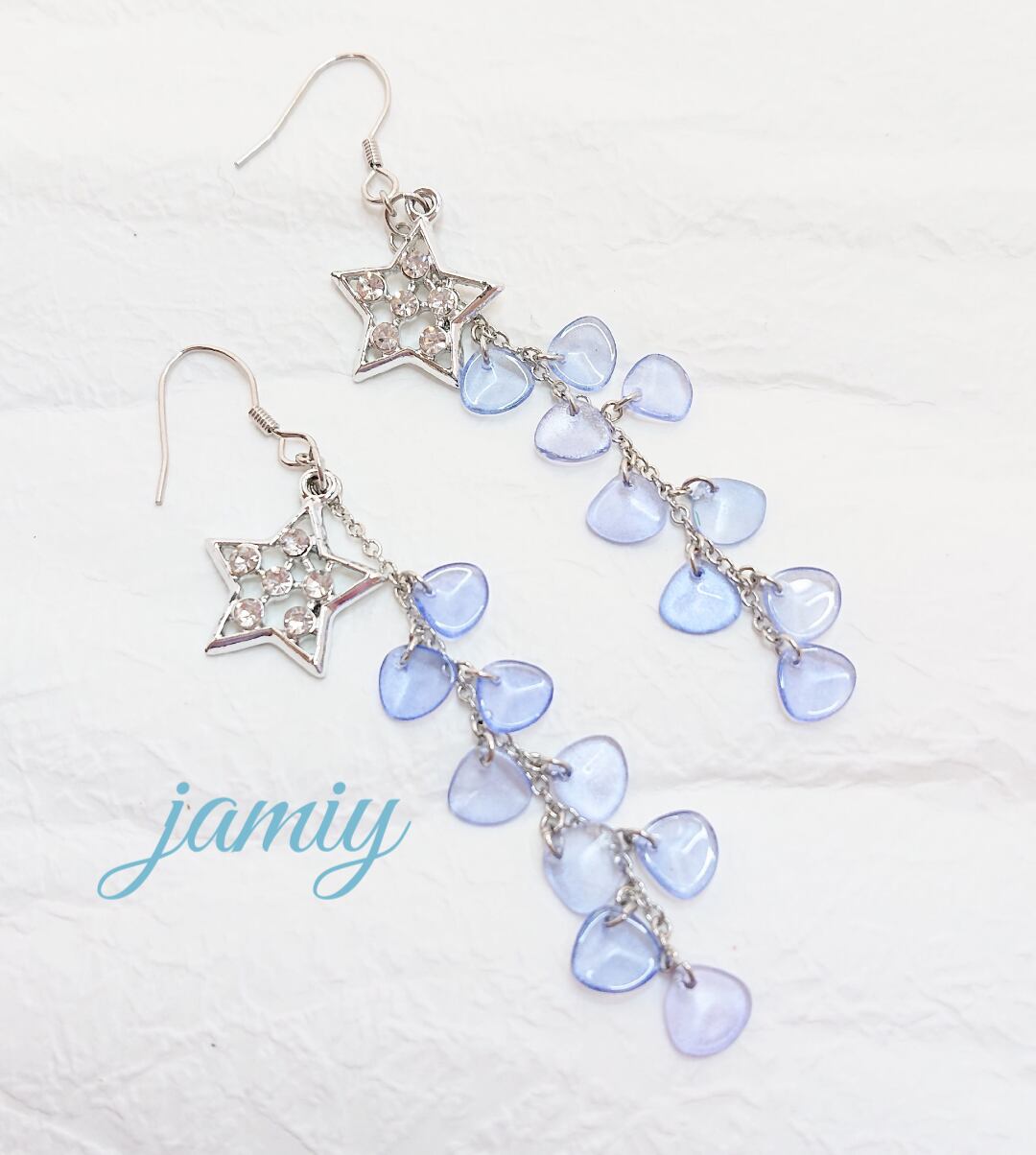 ストーンでキラキラの星のチャームにチェーンにブルーのガラスのチャームをたくさんつけてゆれるピアスに✨