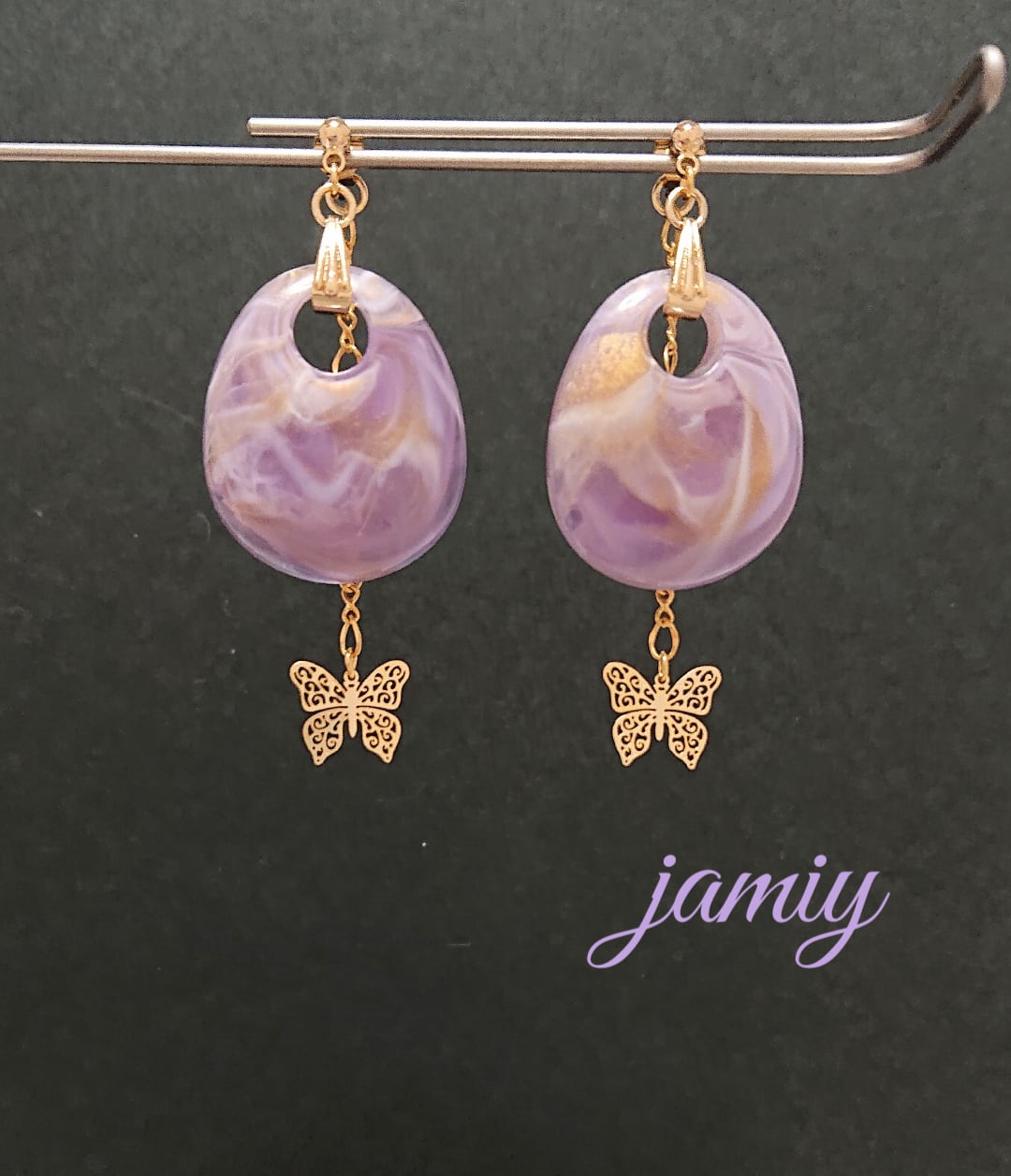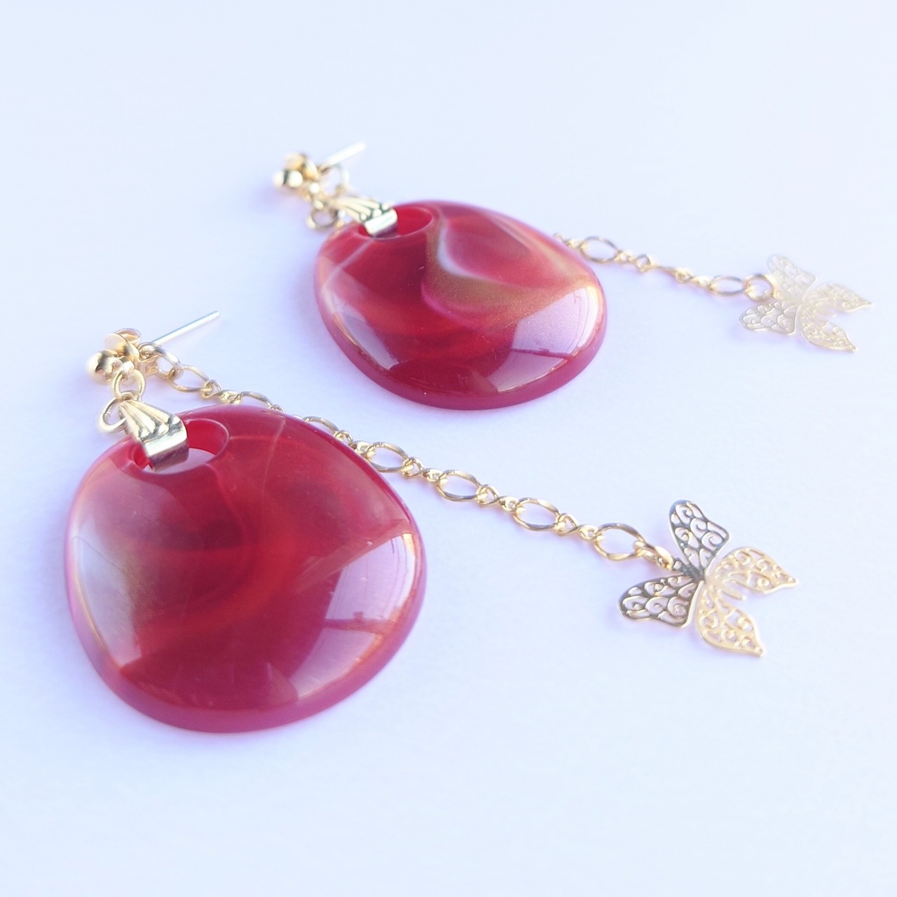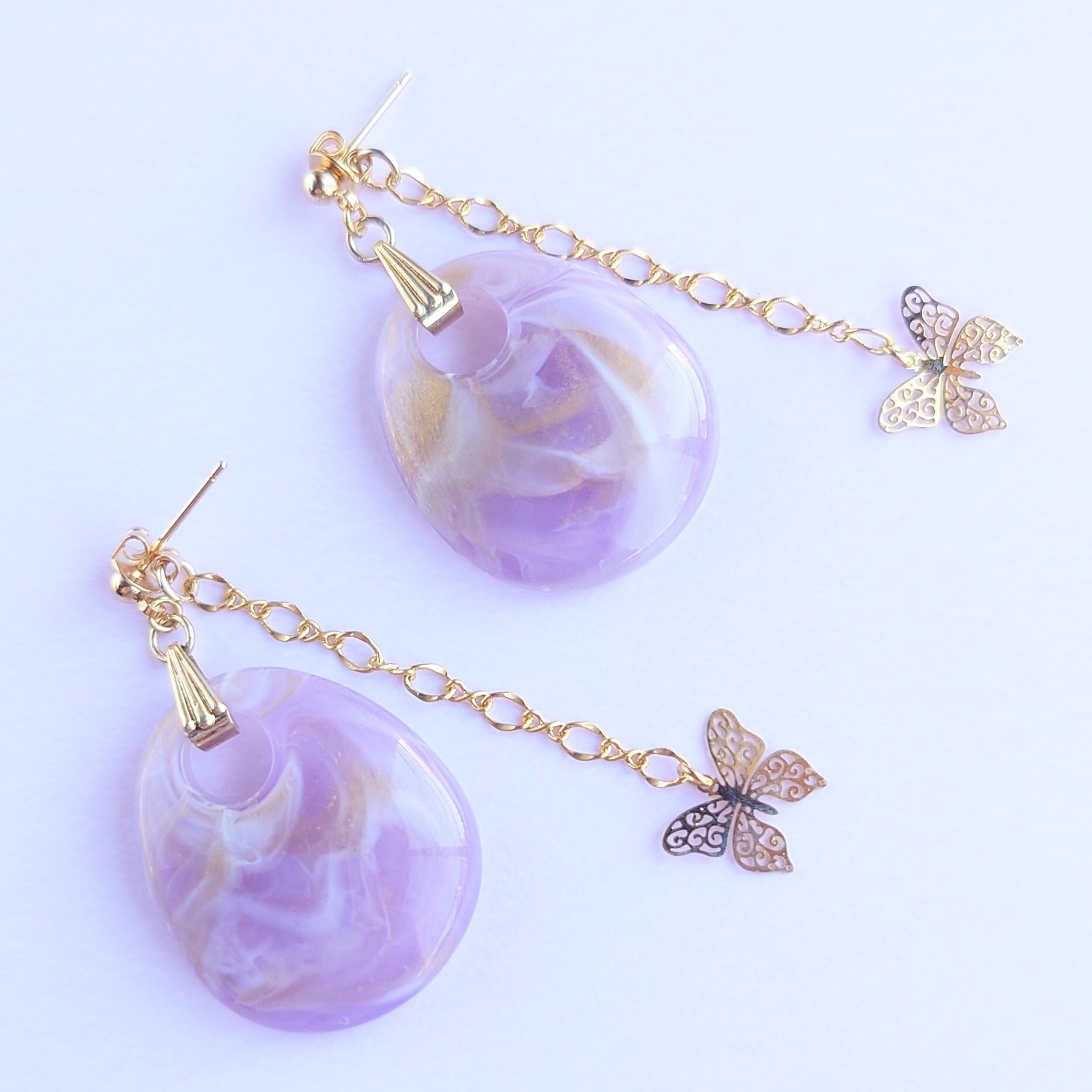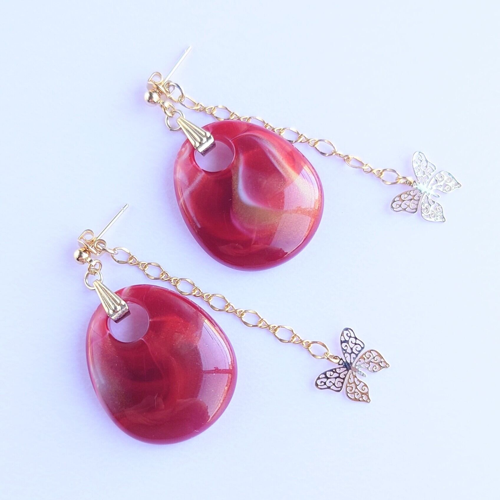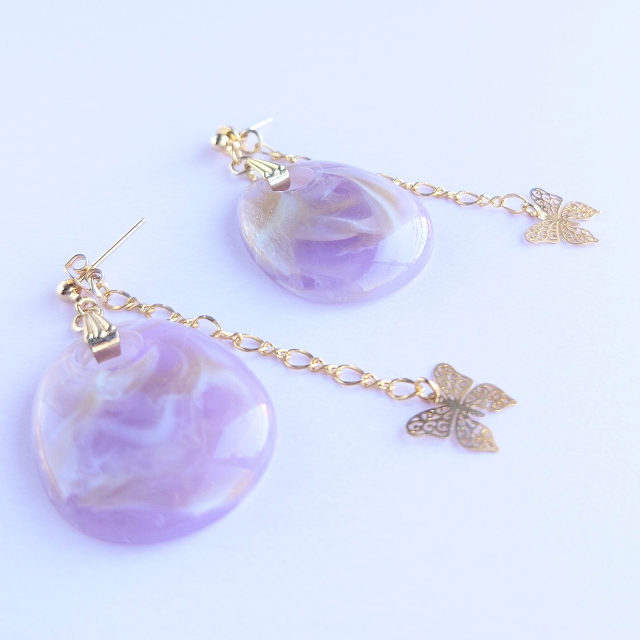ゴールドのマーブル入りのアクリルパーツに、ピアスキャッチにデザインチェーンですかし蝶のゆれるピアス✨