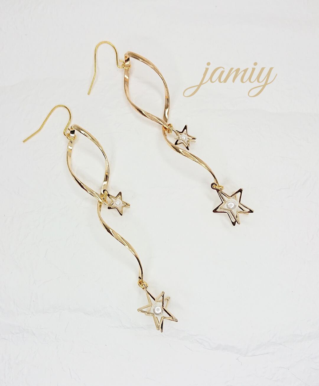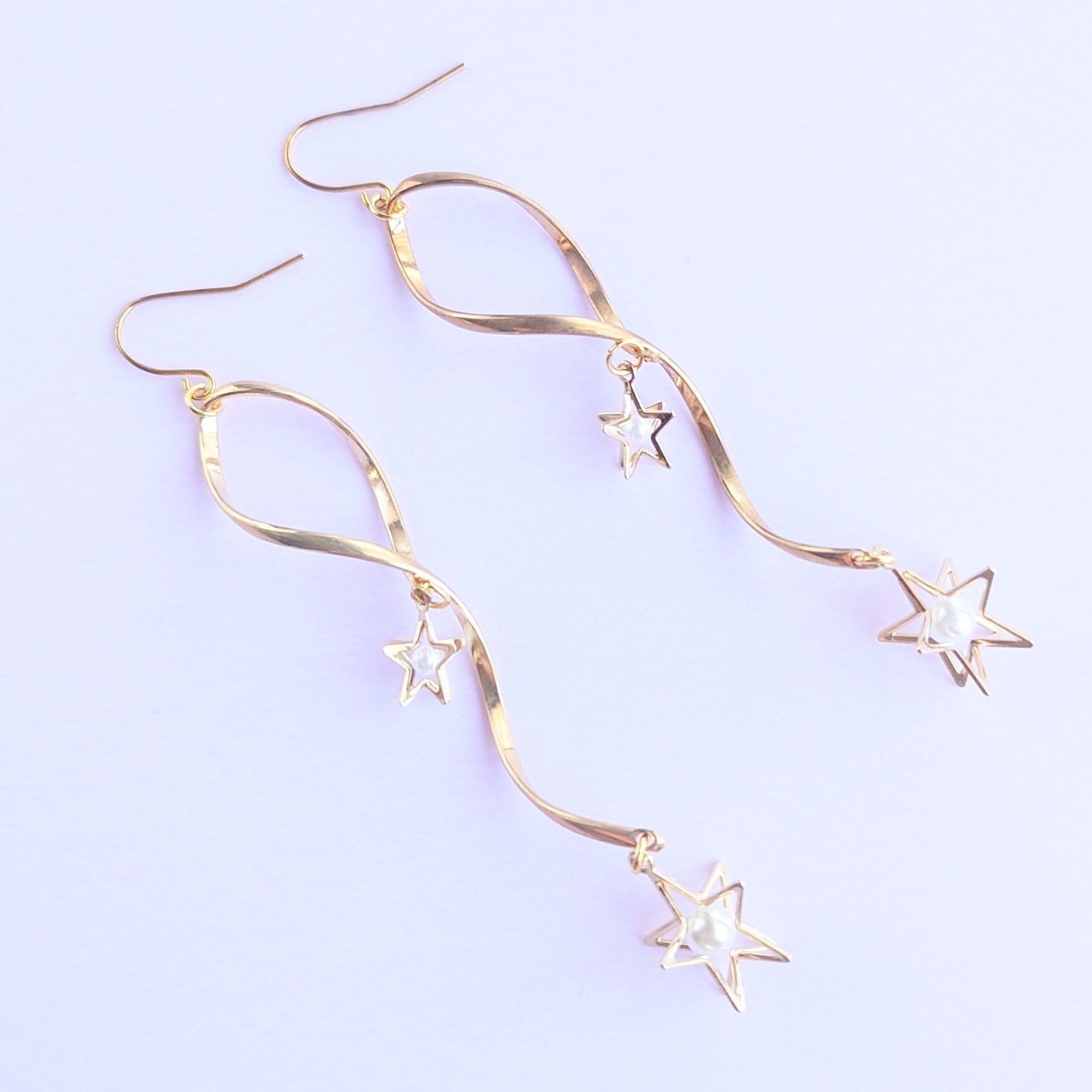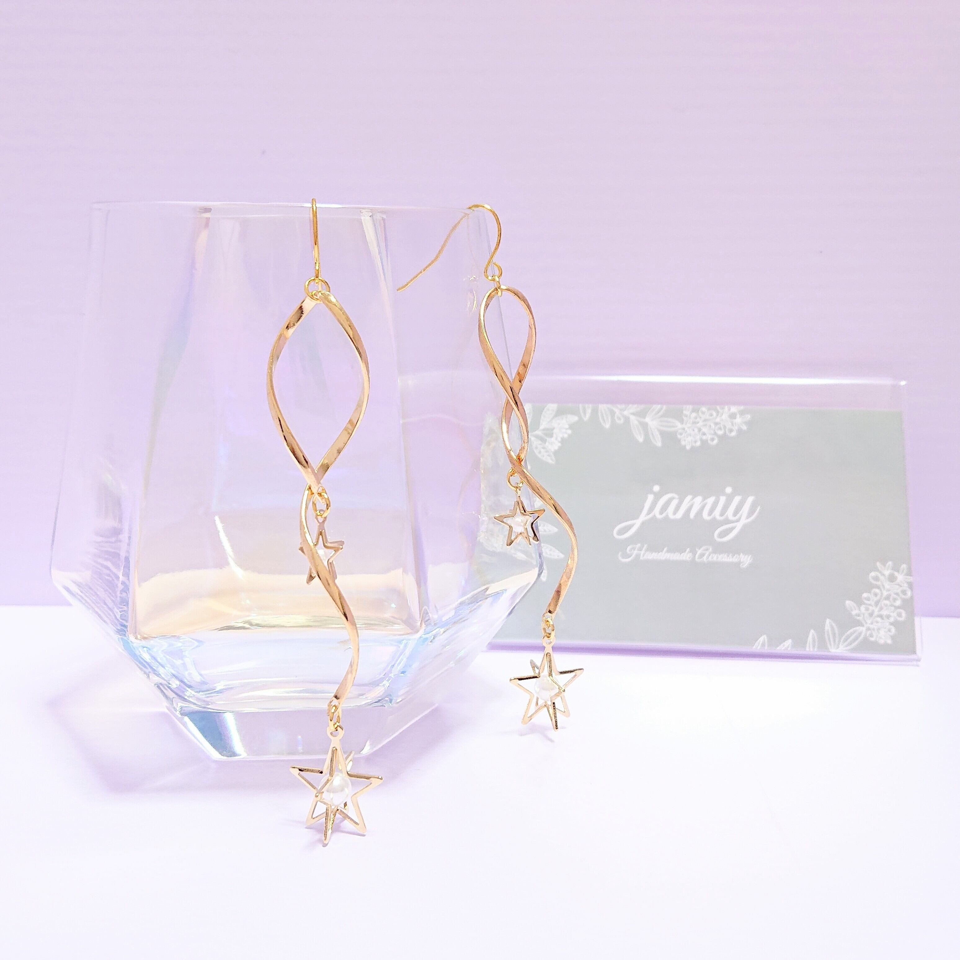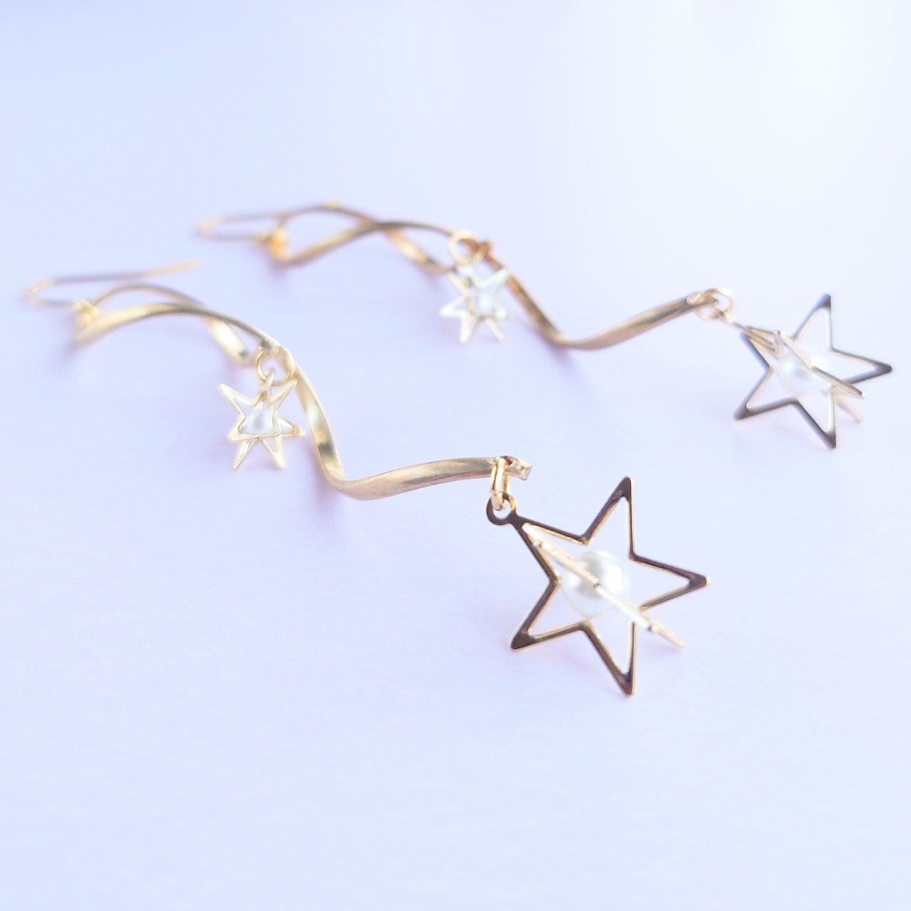 ホワイトパールが入った立体的な星のパーツをツイストループに大小つけて流れ星のイメージのゆれるピアスに✨