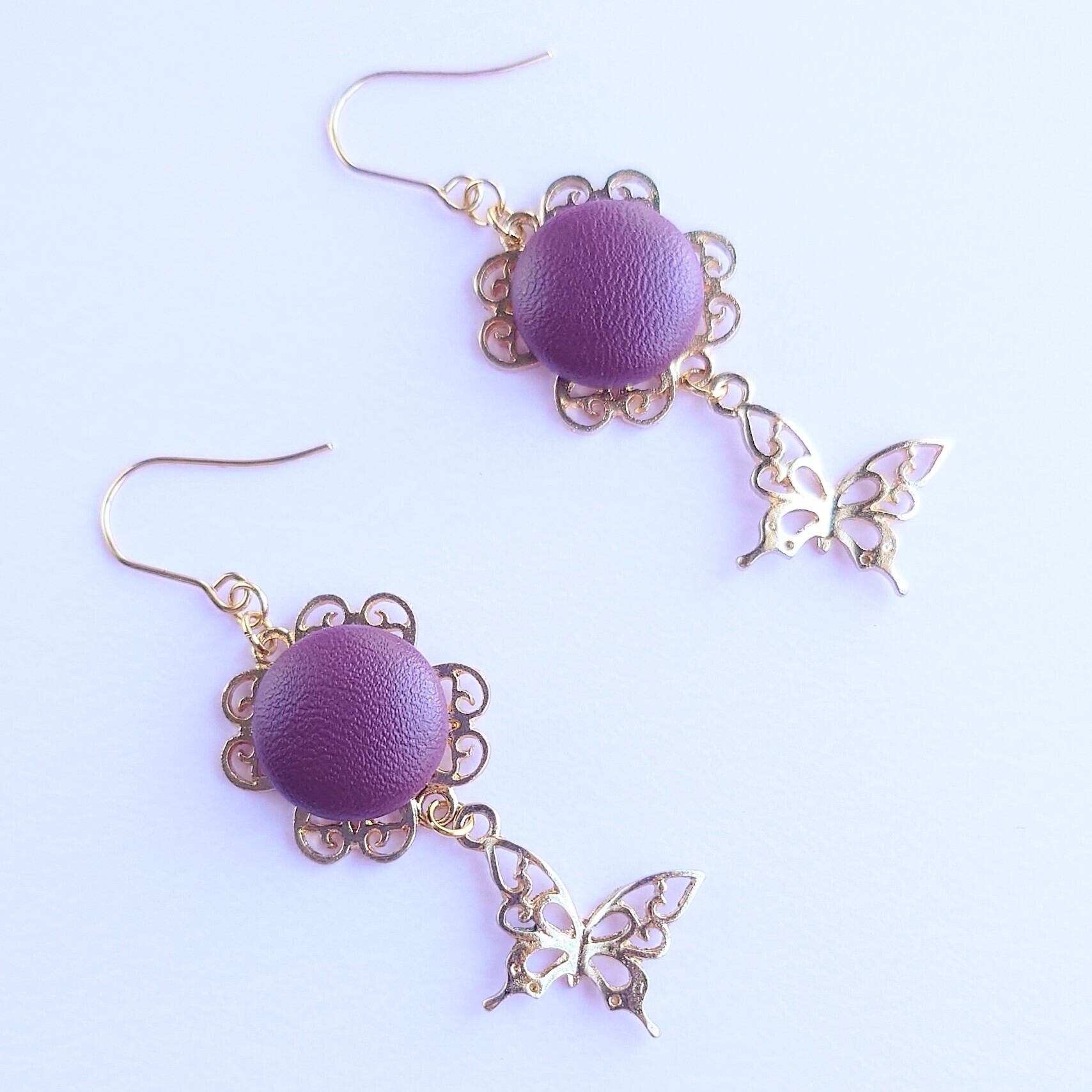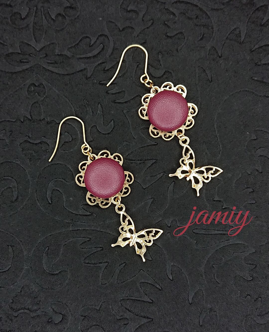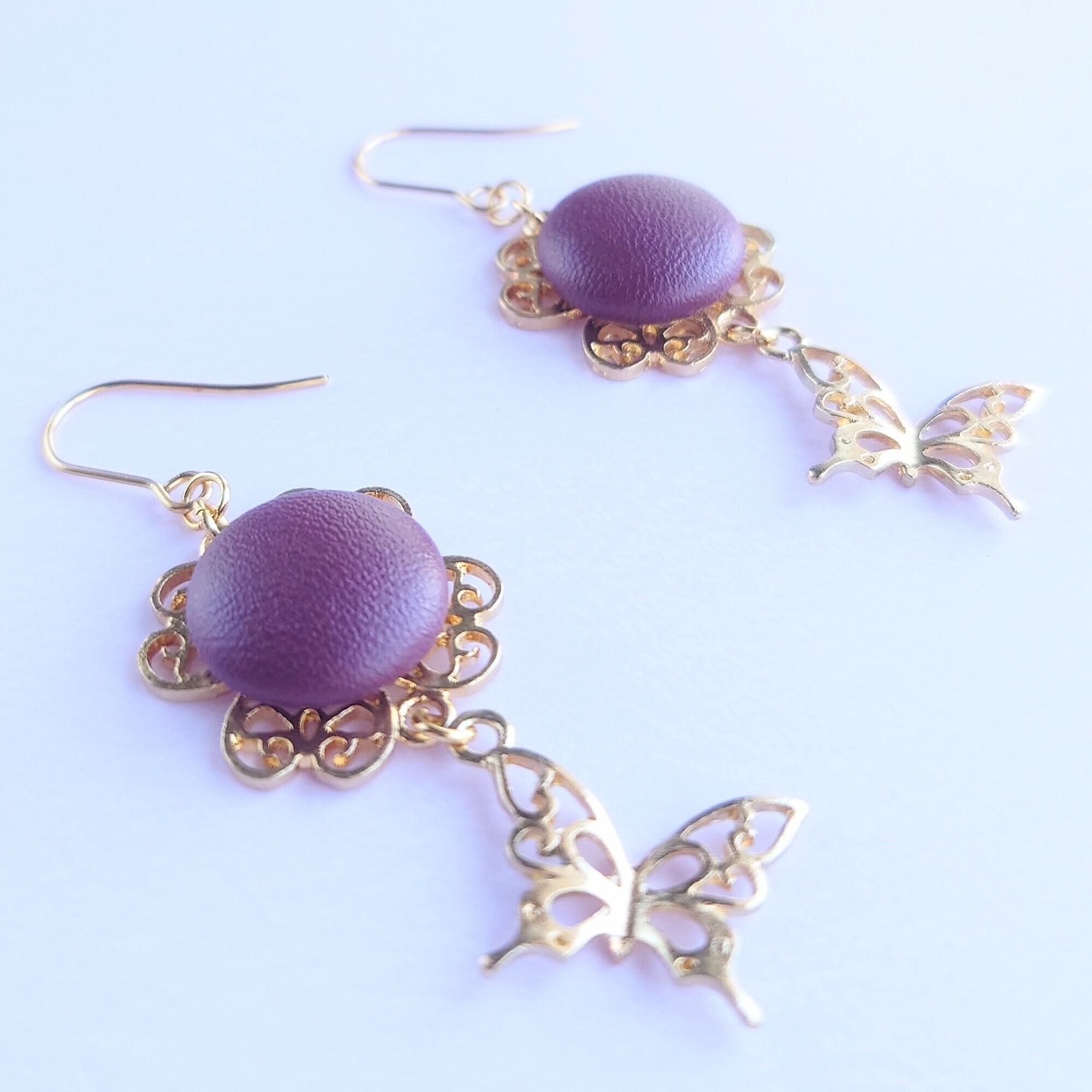 ハートクローバーのすかしパーツにボルドーのレザー調カボションをあわせ、すかし蝶のゆれるピアスに✨