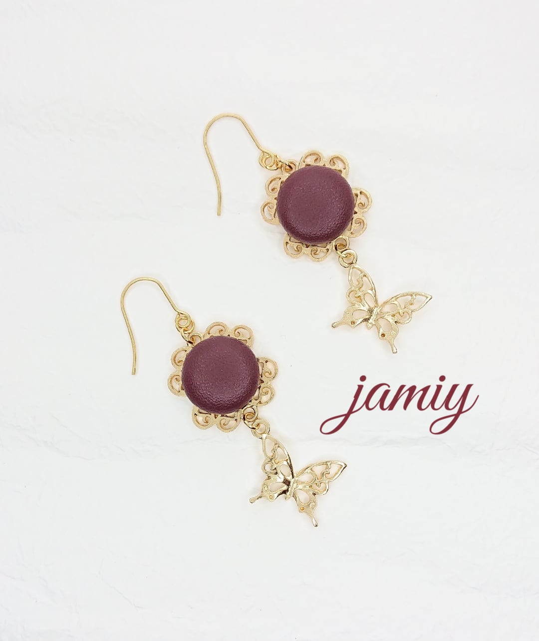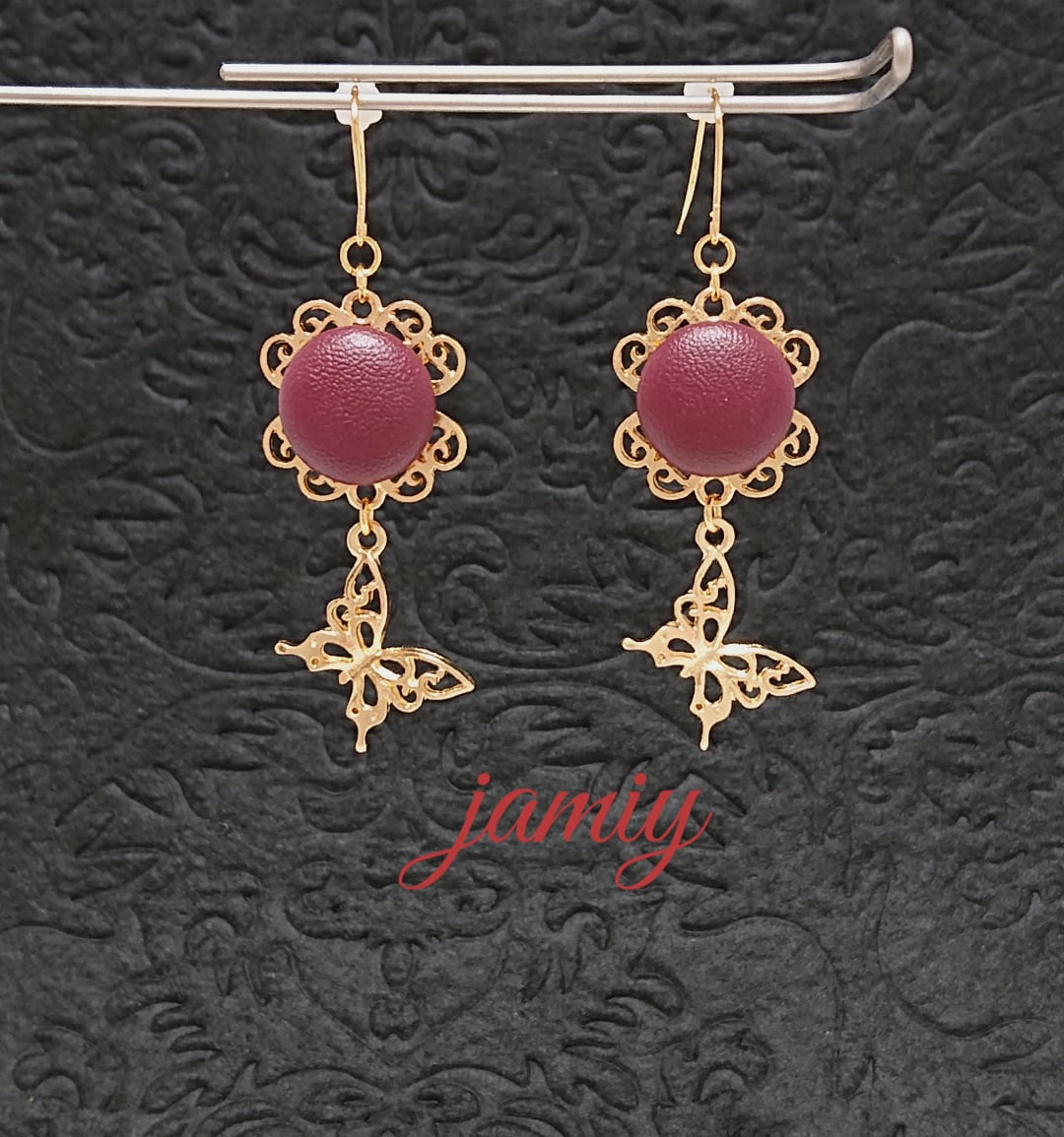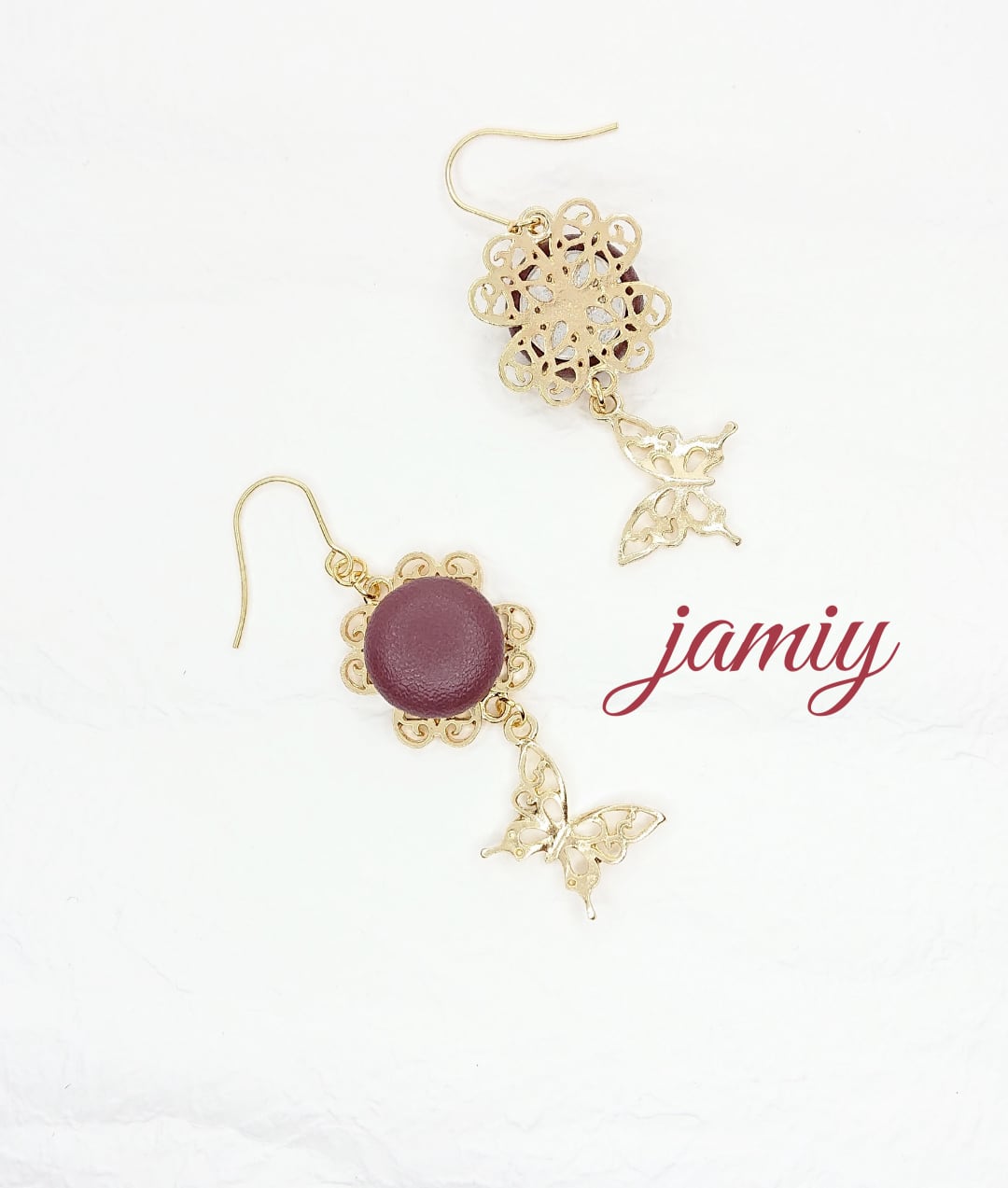ハートクローバーのすかしパーツにボルドーのレザー調カボションをあわせ、すかし蝶のゆれるピアスに✨
