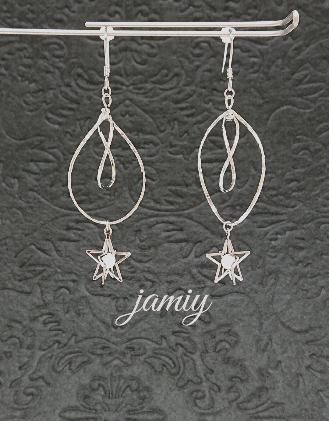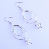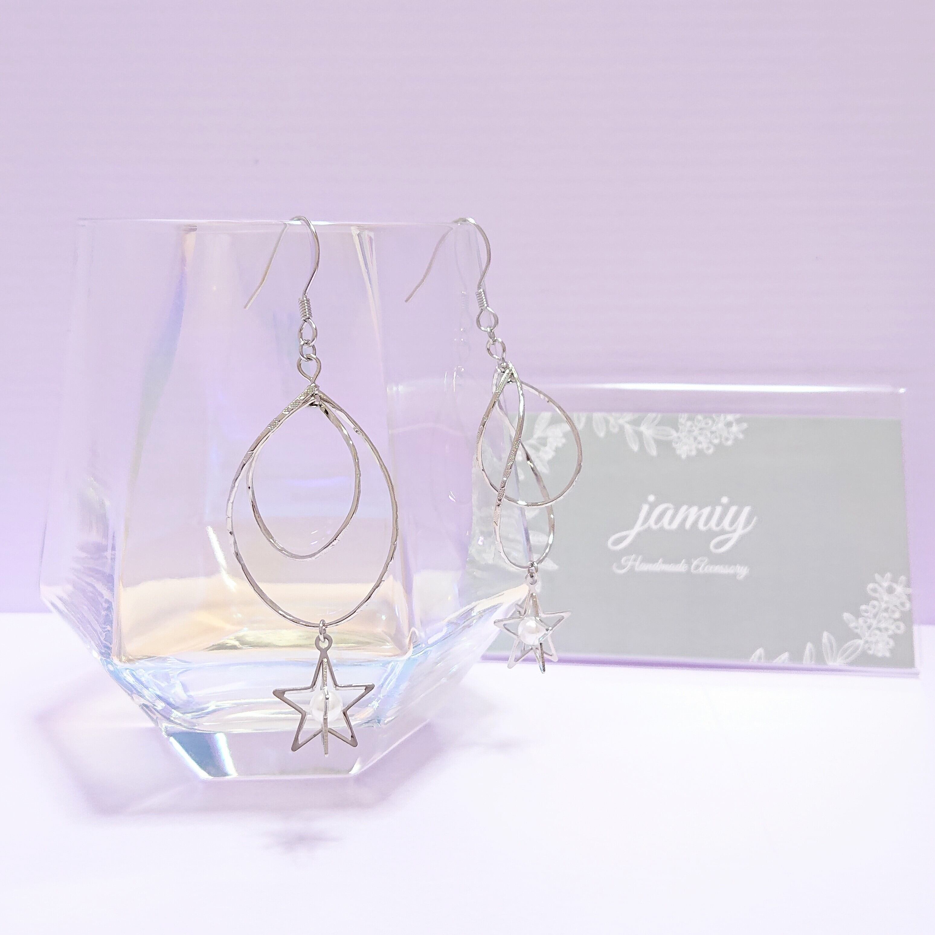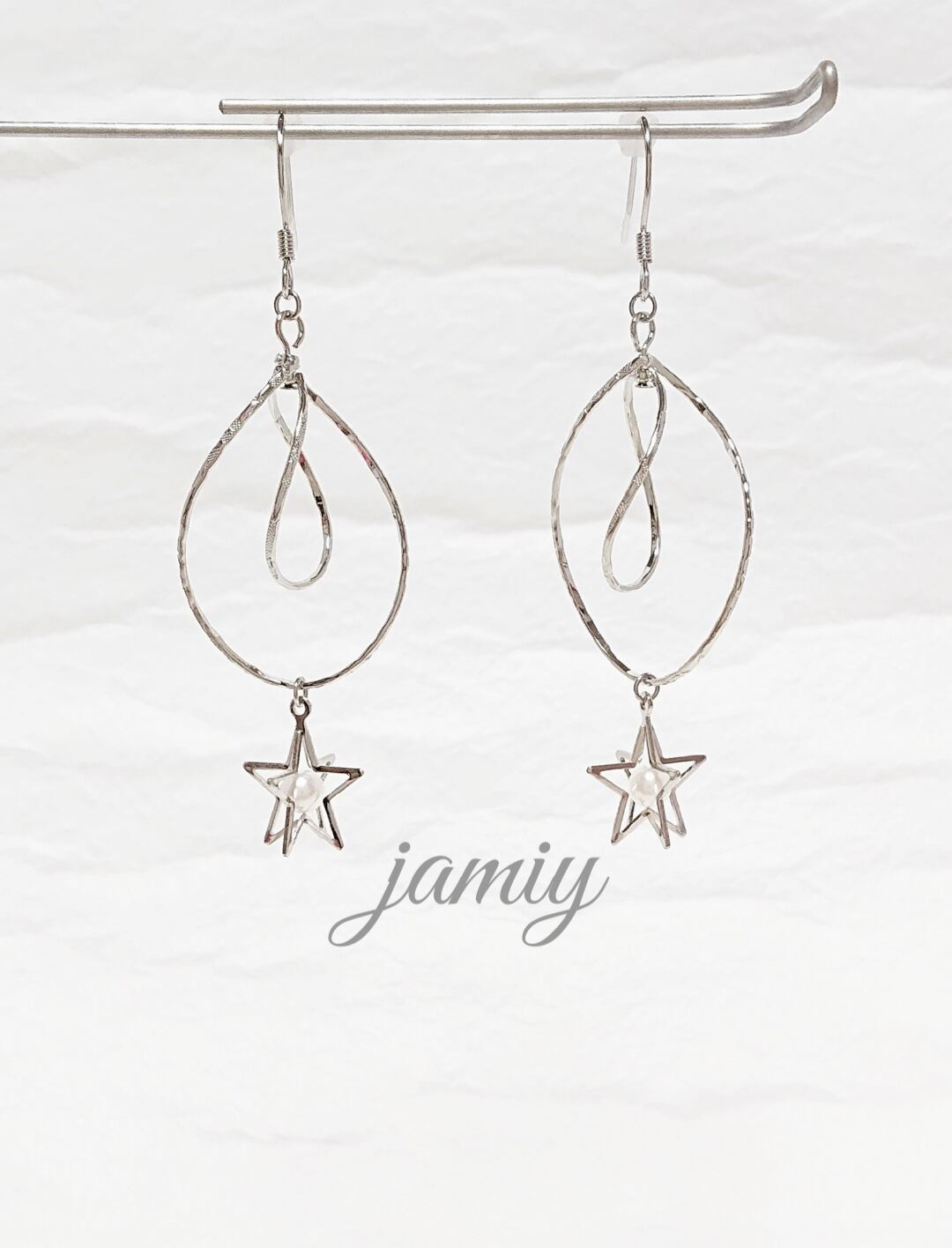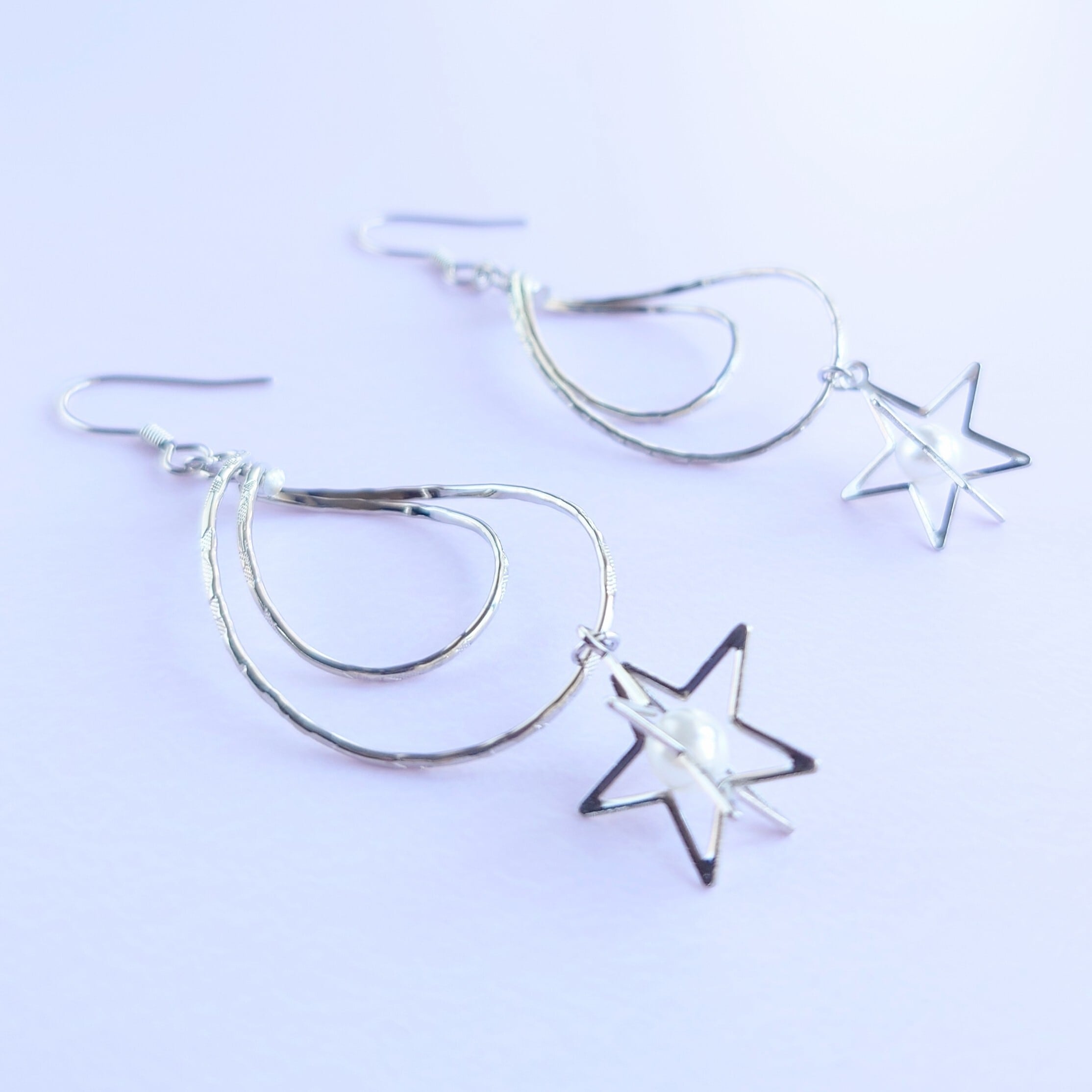 ダブルデザインフープにホワイトのパールが入った立体的な星のパーツをつけてゆれるピアスに✨ダブルフープでゆれるたびに動きのある大人っぽく上品な感じのピアスです✨