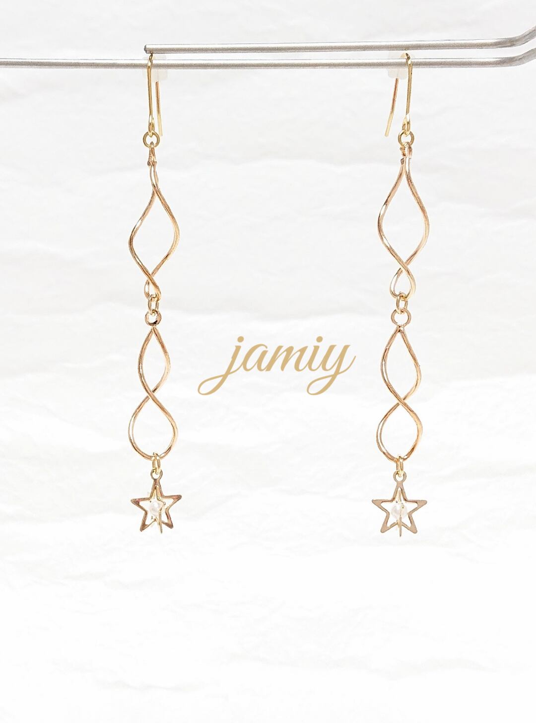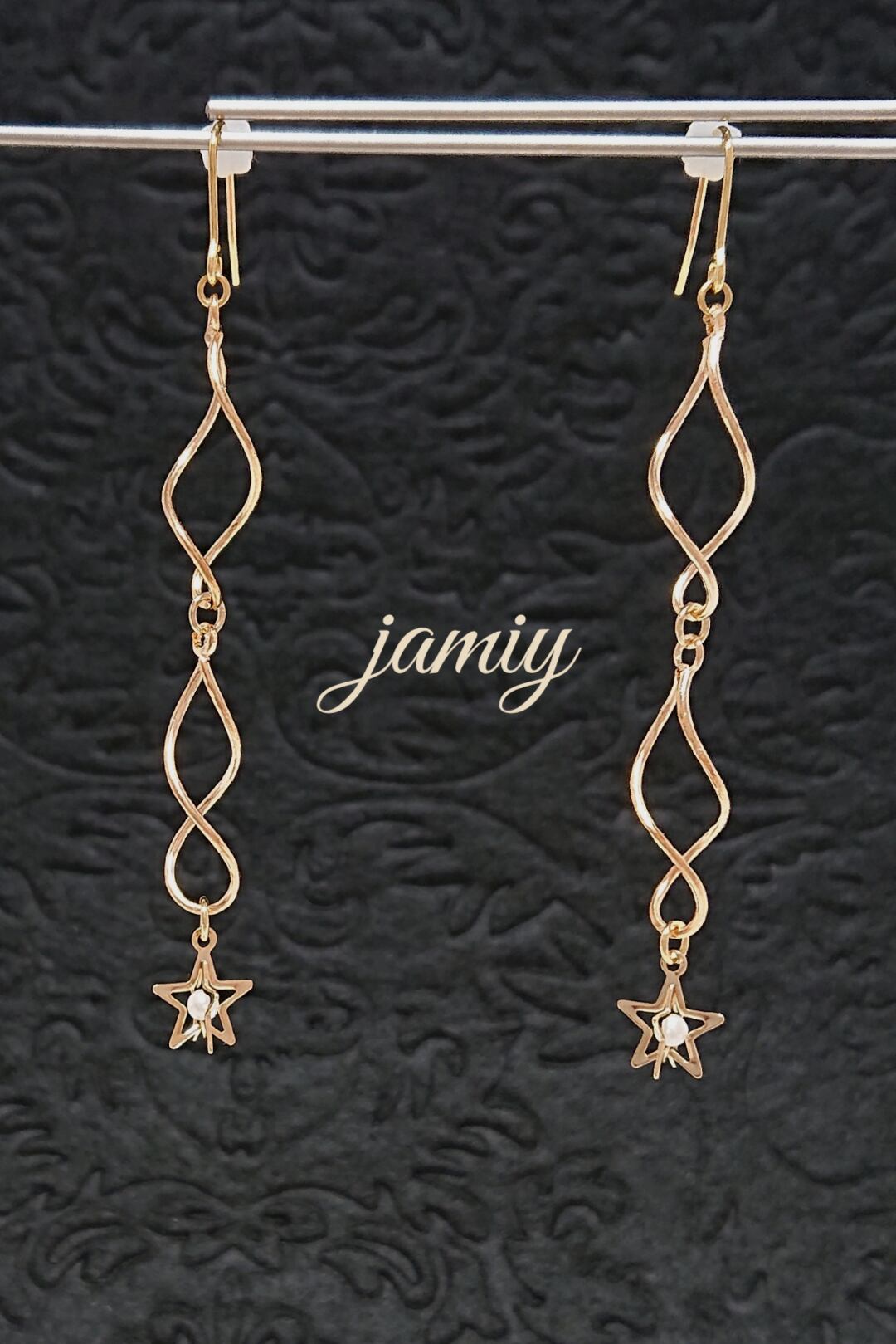 ダブルツイストループにホワイトのパールが入った立体的な星のパーツをつけてゆれるピアスに✨大人っぽく上品な感じのピアスです✨