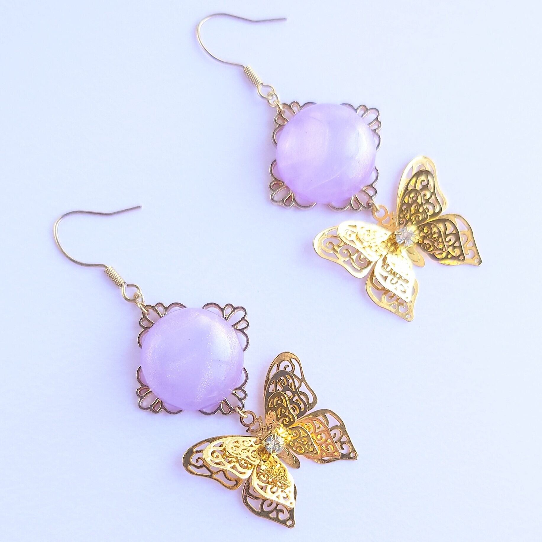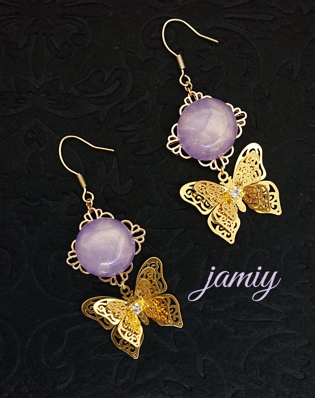 スカシパーツにパープルラメカボションをあわせ3枚の羽が重なった立体的な蝶のゆれるピアス✨