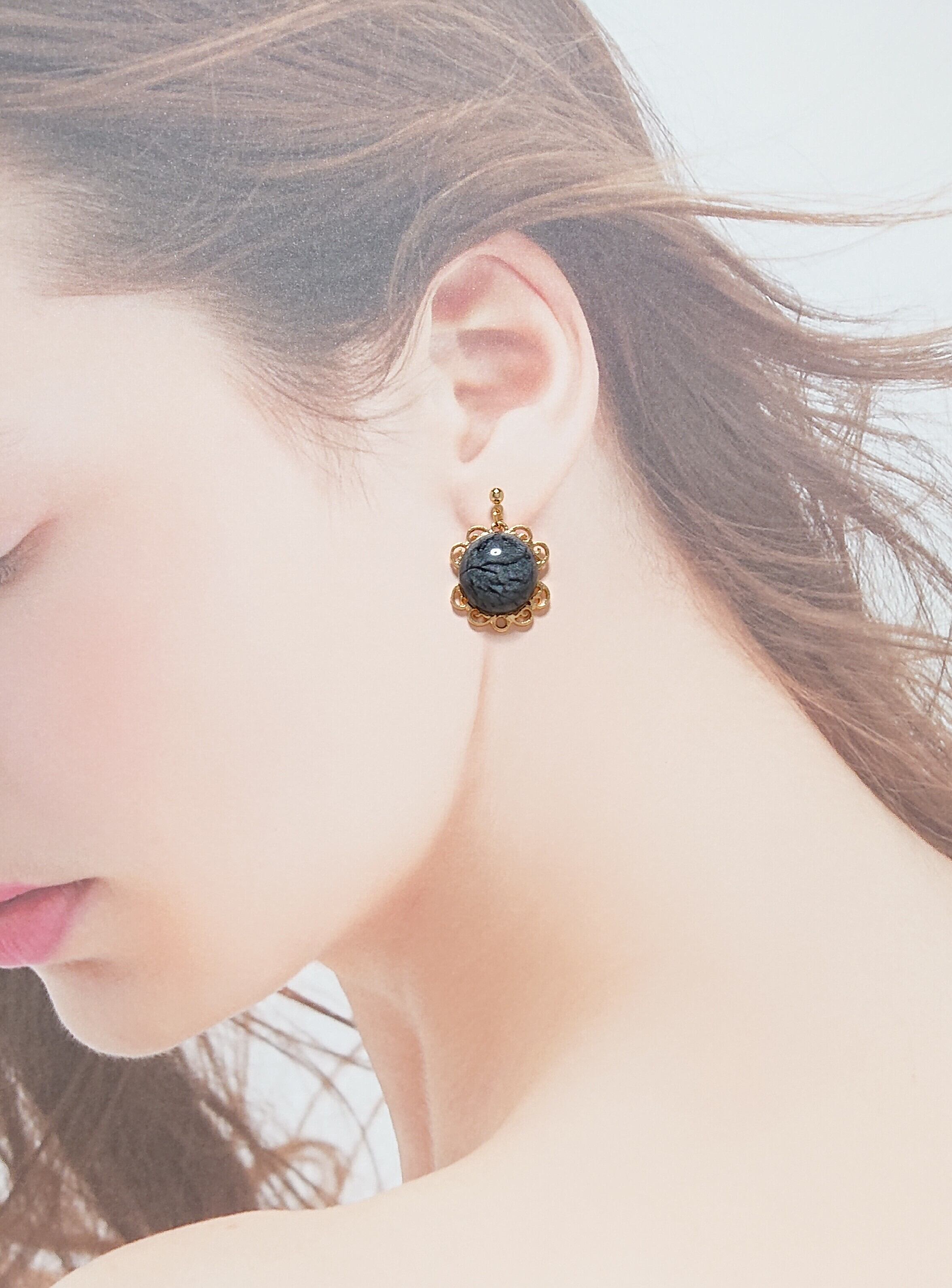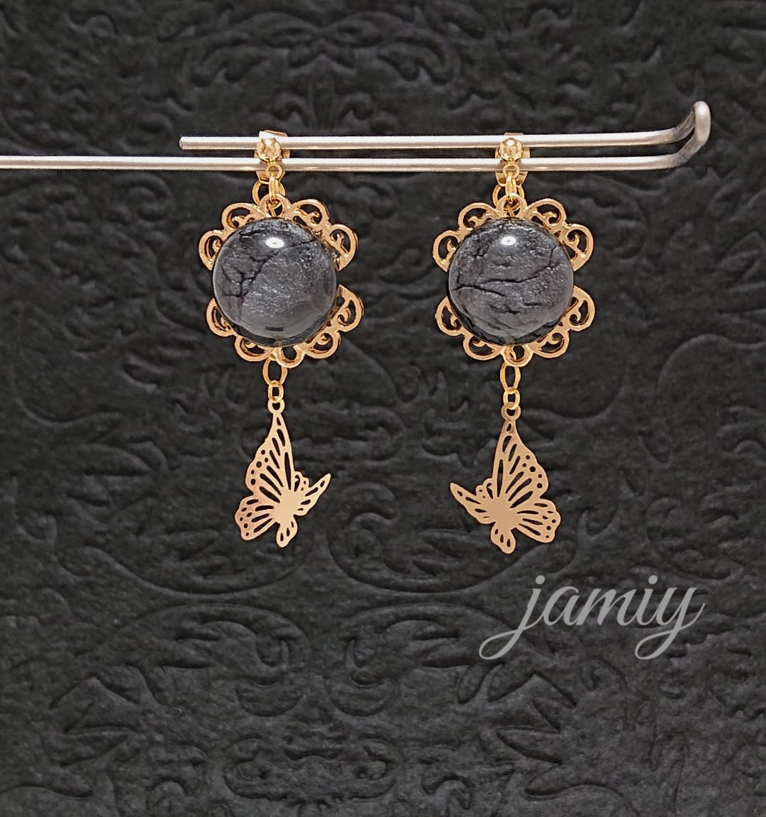 ハートクローバーのすかしパーツにダークグレーのカボションをあわせ、すかし蝶のゆれるピアス✨