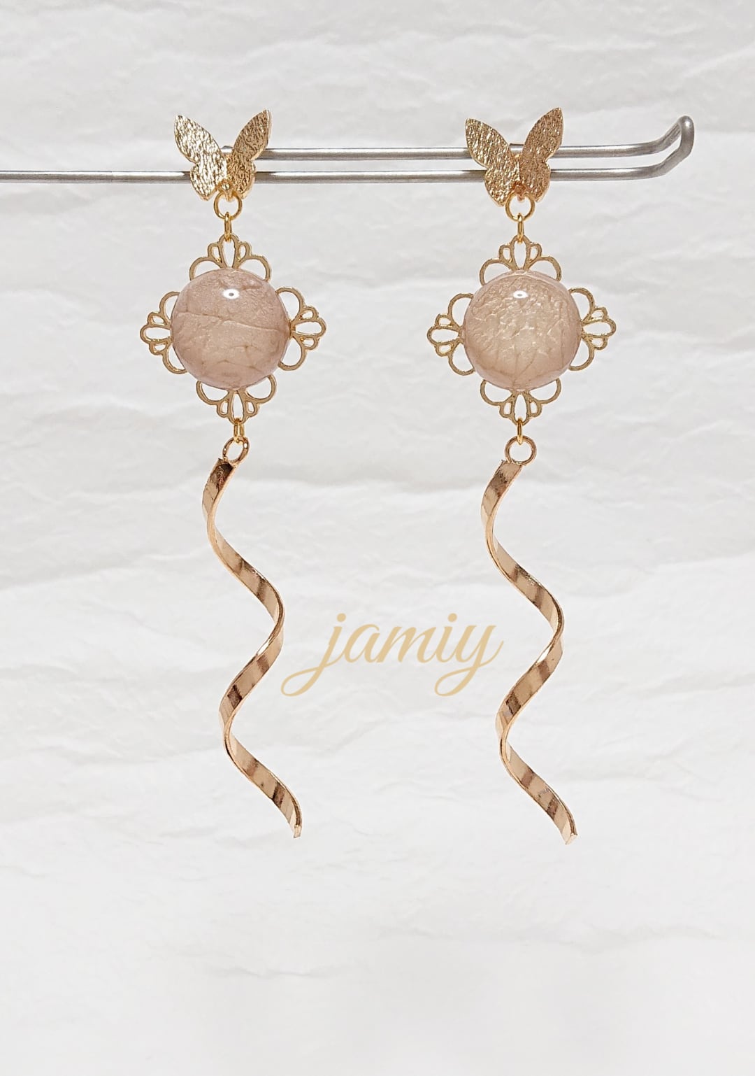 蝶ピアスにスカシパーツにベージュのカボションをあわせウェーブバーで蝶が羽ばたいているようなイメージのゆれるピアス✨
