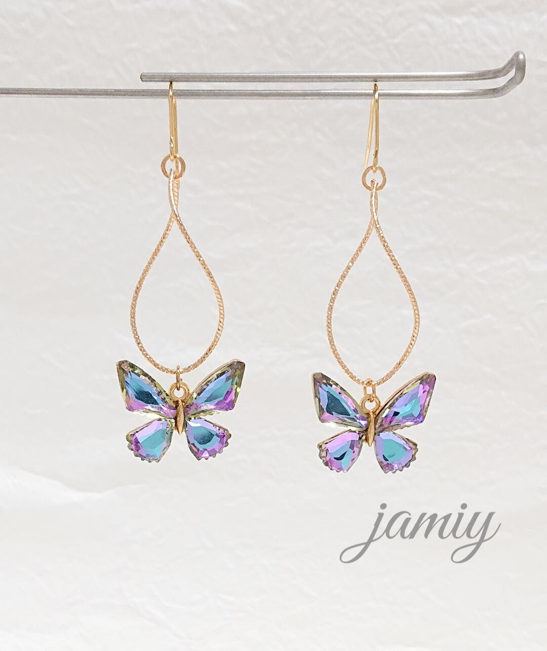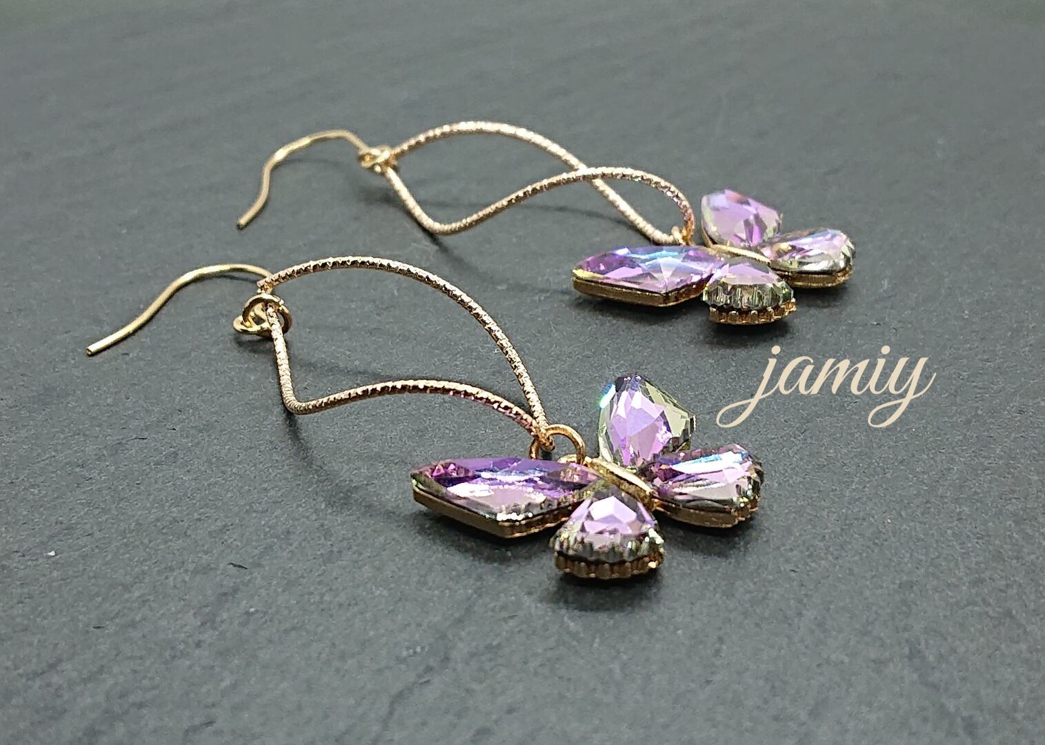 ツイストループにオーロラパープルのガラスストーンがついた蝶のチャームでキラキラゆれるピアス♡