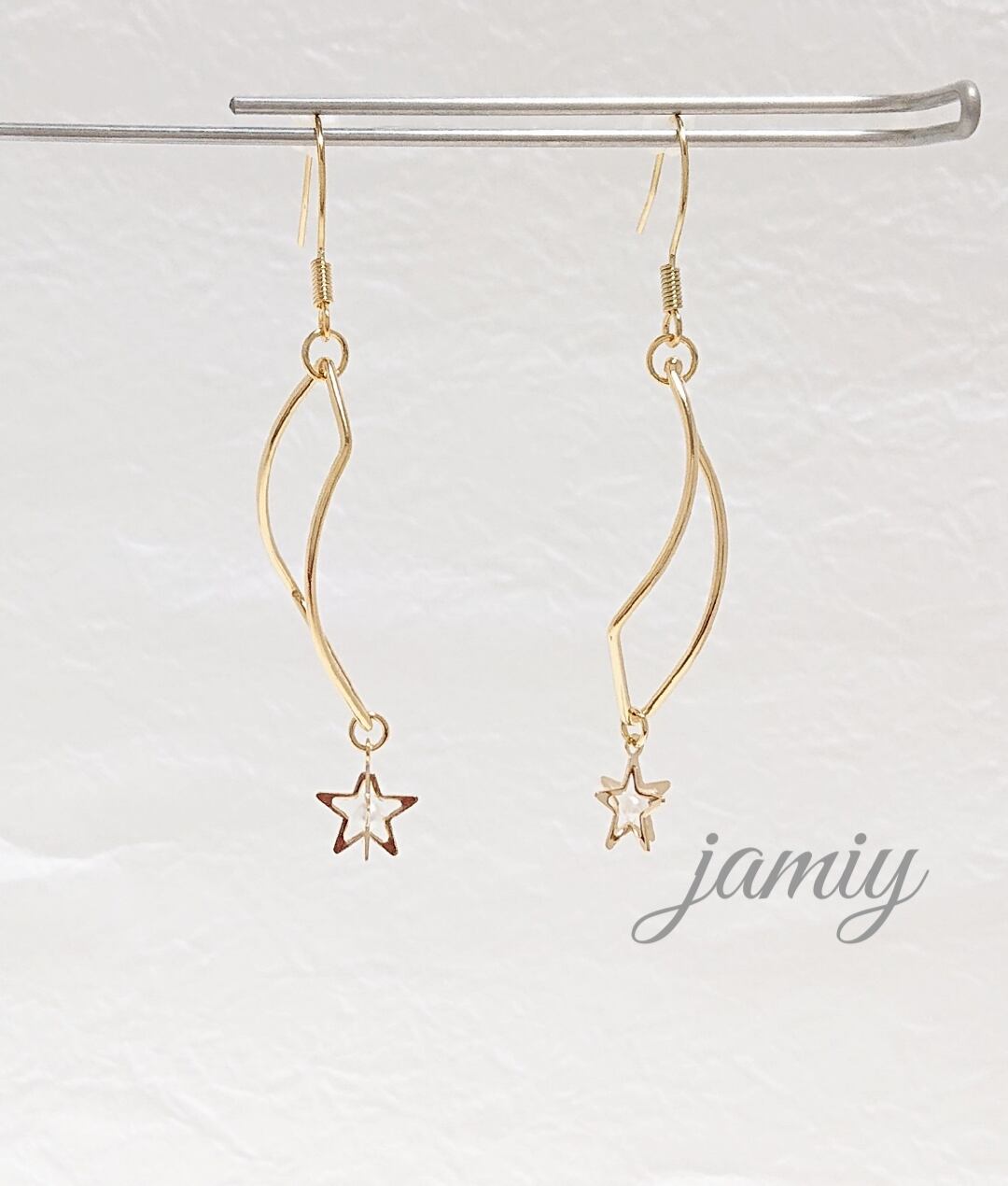 変形ツイストループにホワイトのパールが入った立体的な星のパーツをつけてゆれるピアスに✨大人っぽく上品な感じのピアスです✨