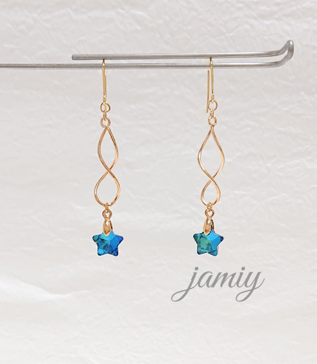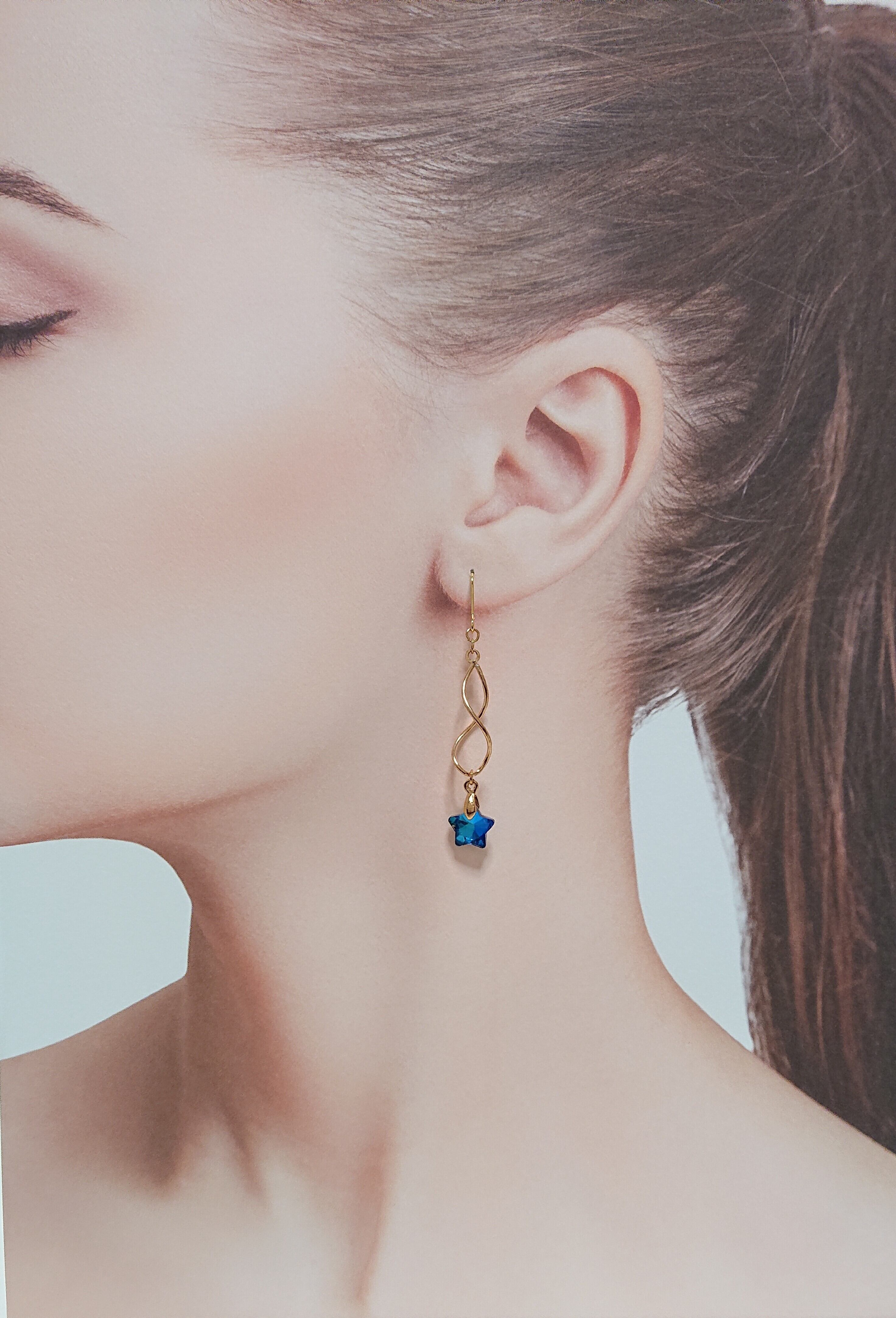 ツイストループにブルースターのゆれるピアス✨スターは角度によって色味が変化するサファイア&アクアマリンでキレイな色です。