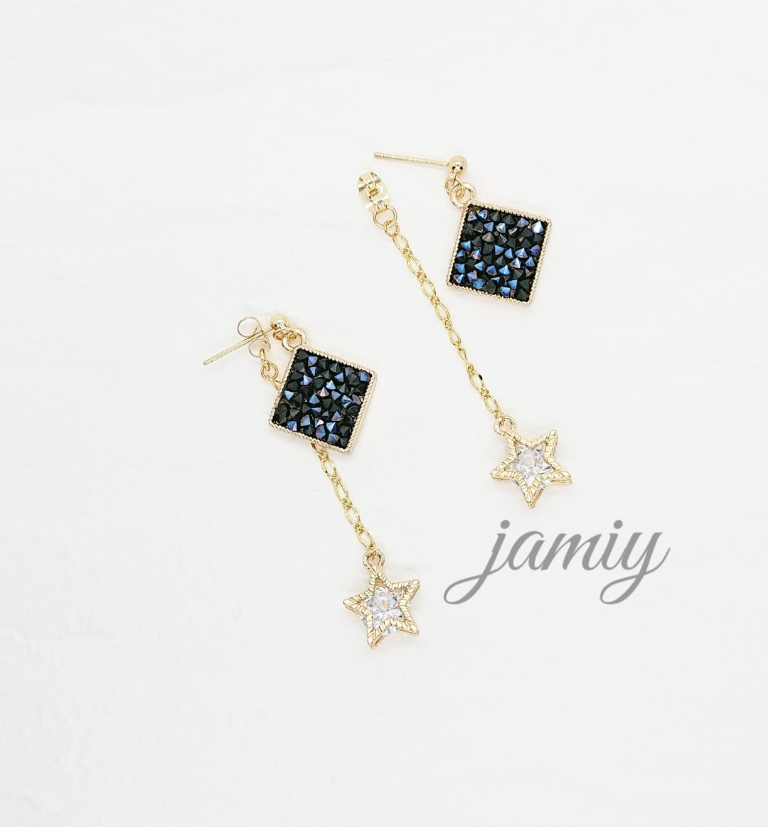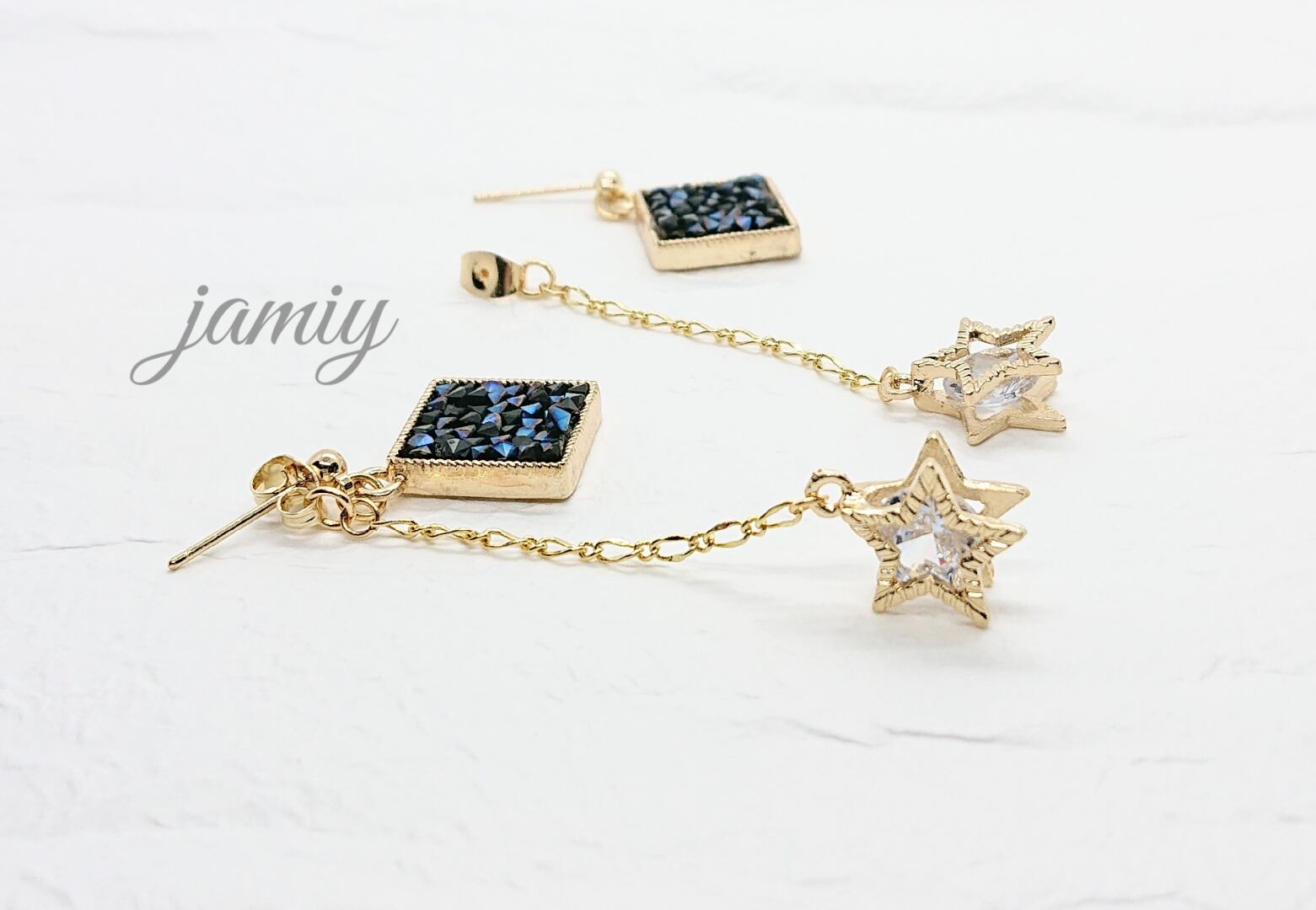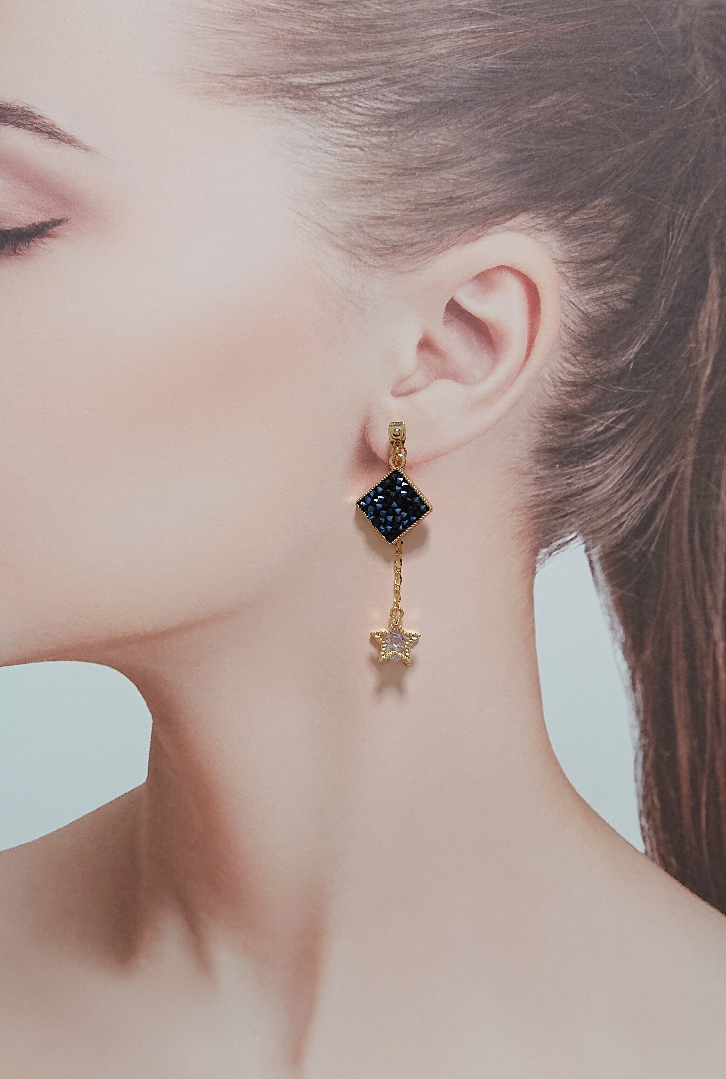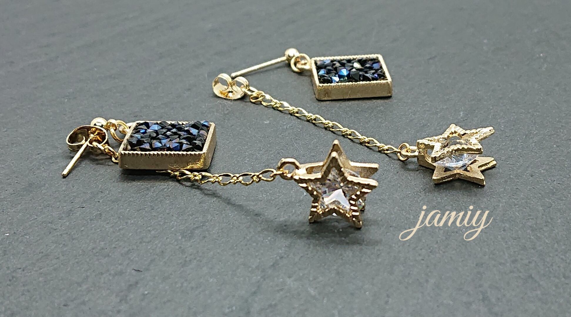 モンタナ色のVカットガラスストーンの入ったひし形のチャームに、ピアスキャッチにデザインチェーンで星の中にガラスの入ったパーツをあわせゆれる星ピアス☆