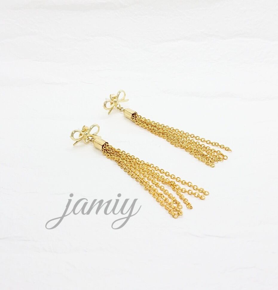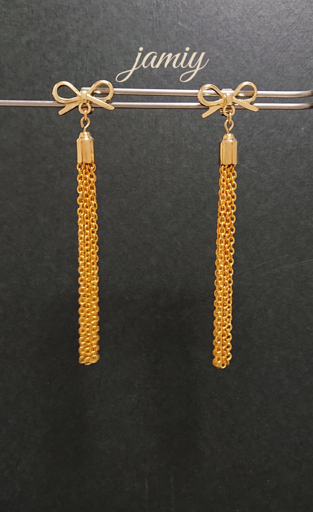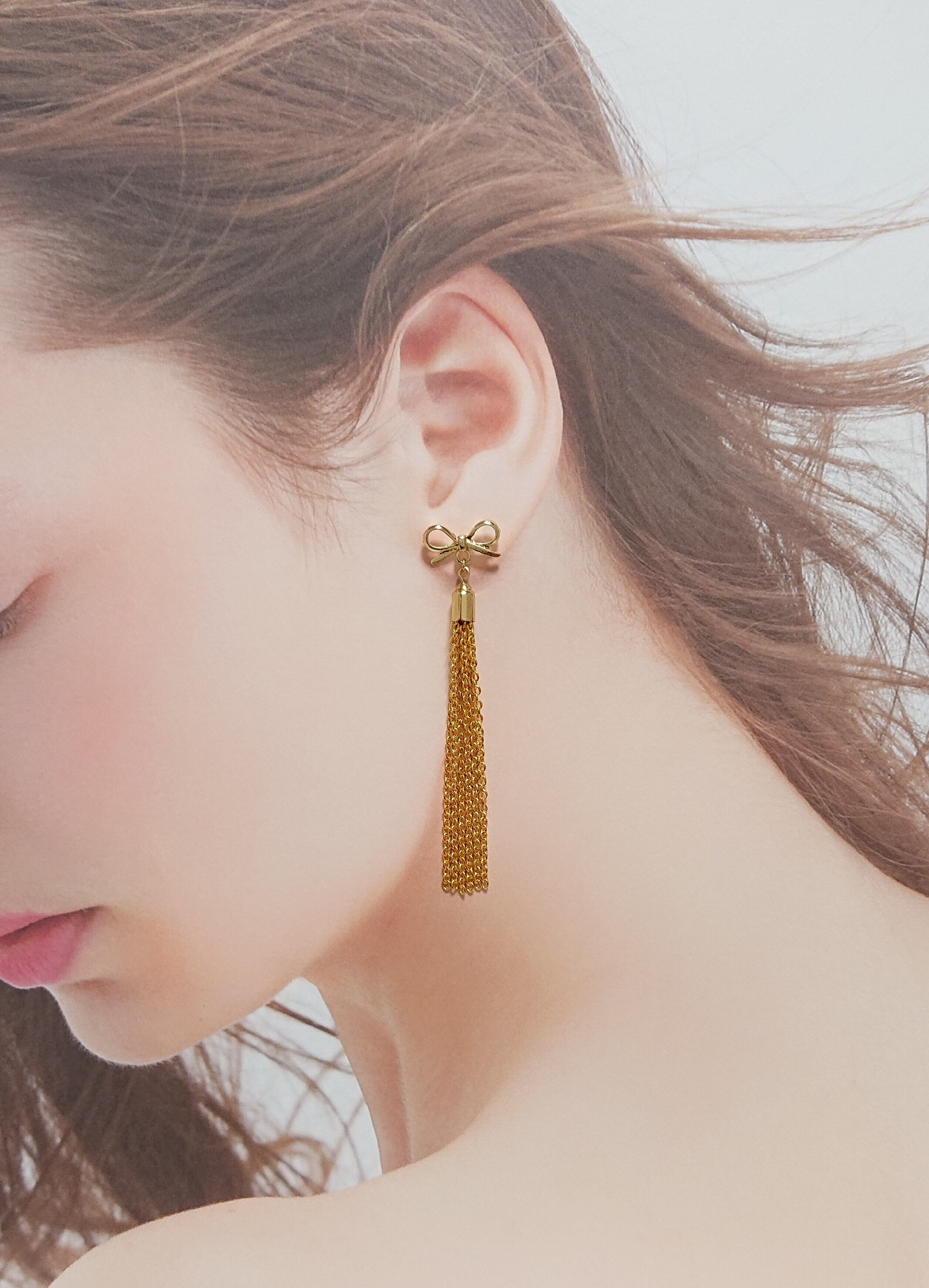 リボンのピアスにチェーンのタッセルで耳にゆれる長さのあるピアスです。