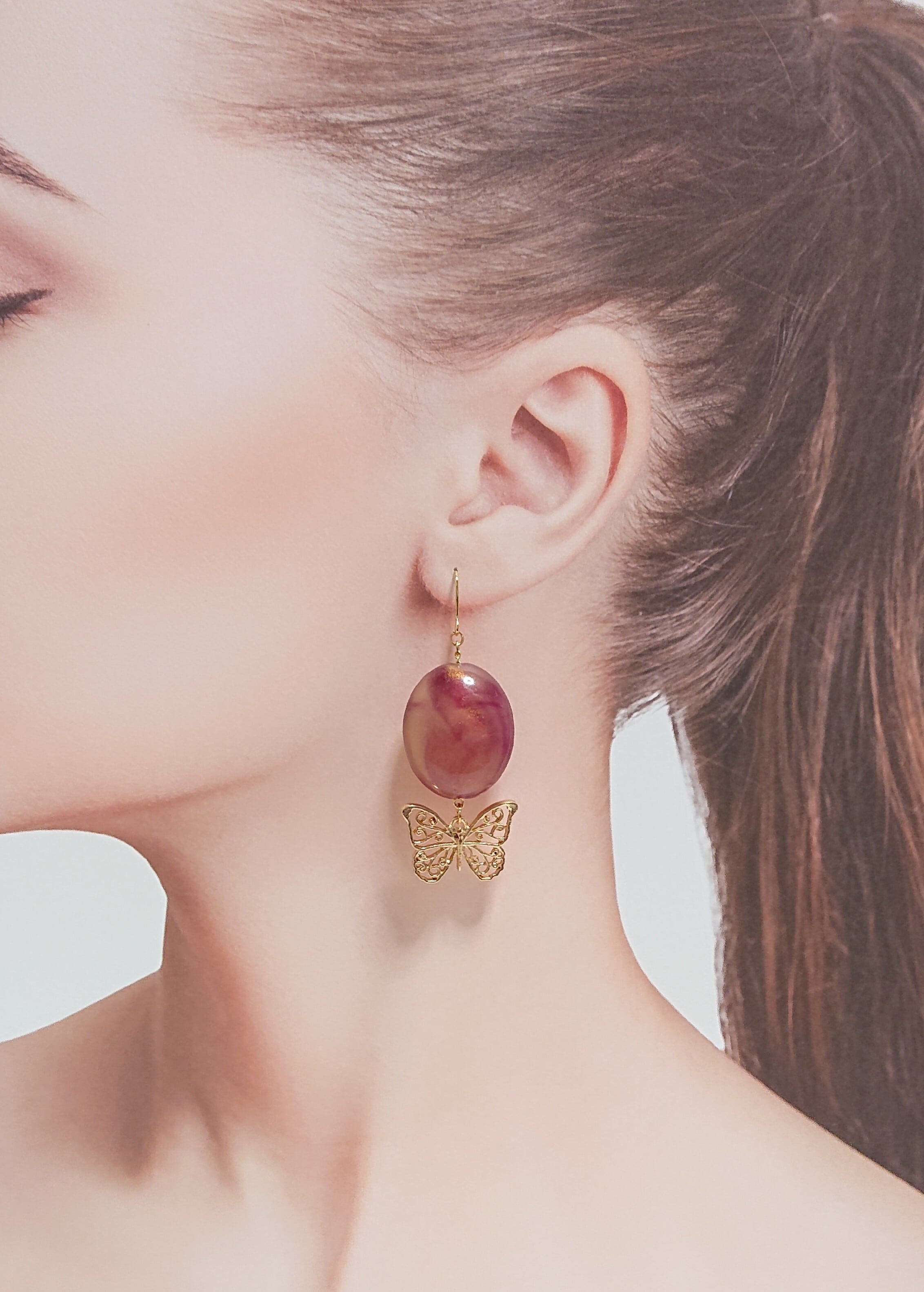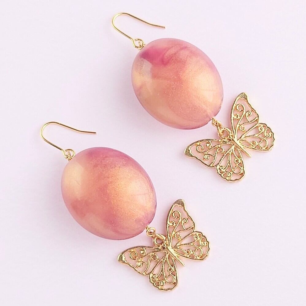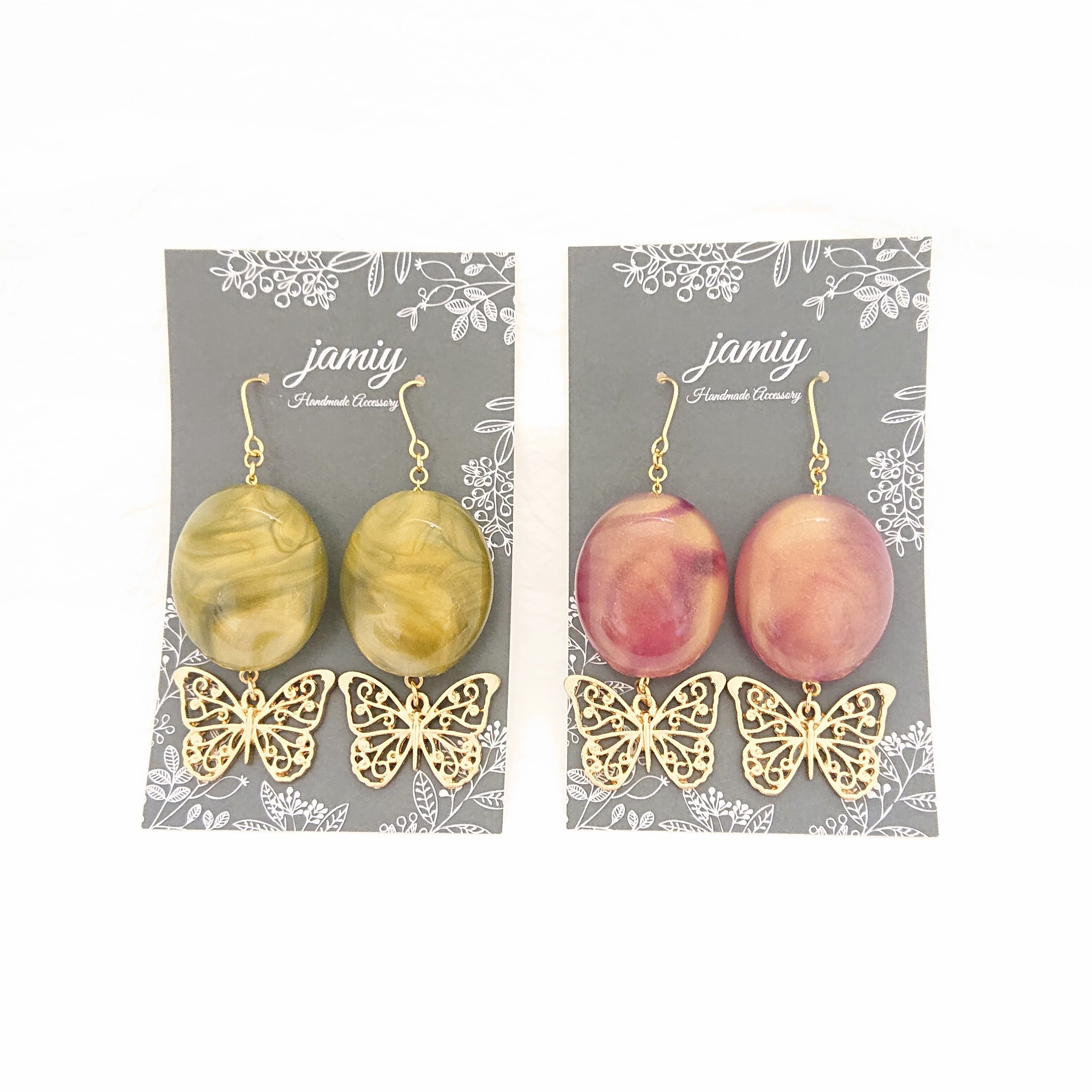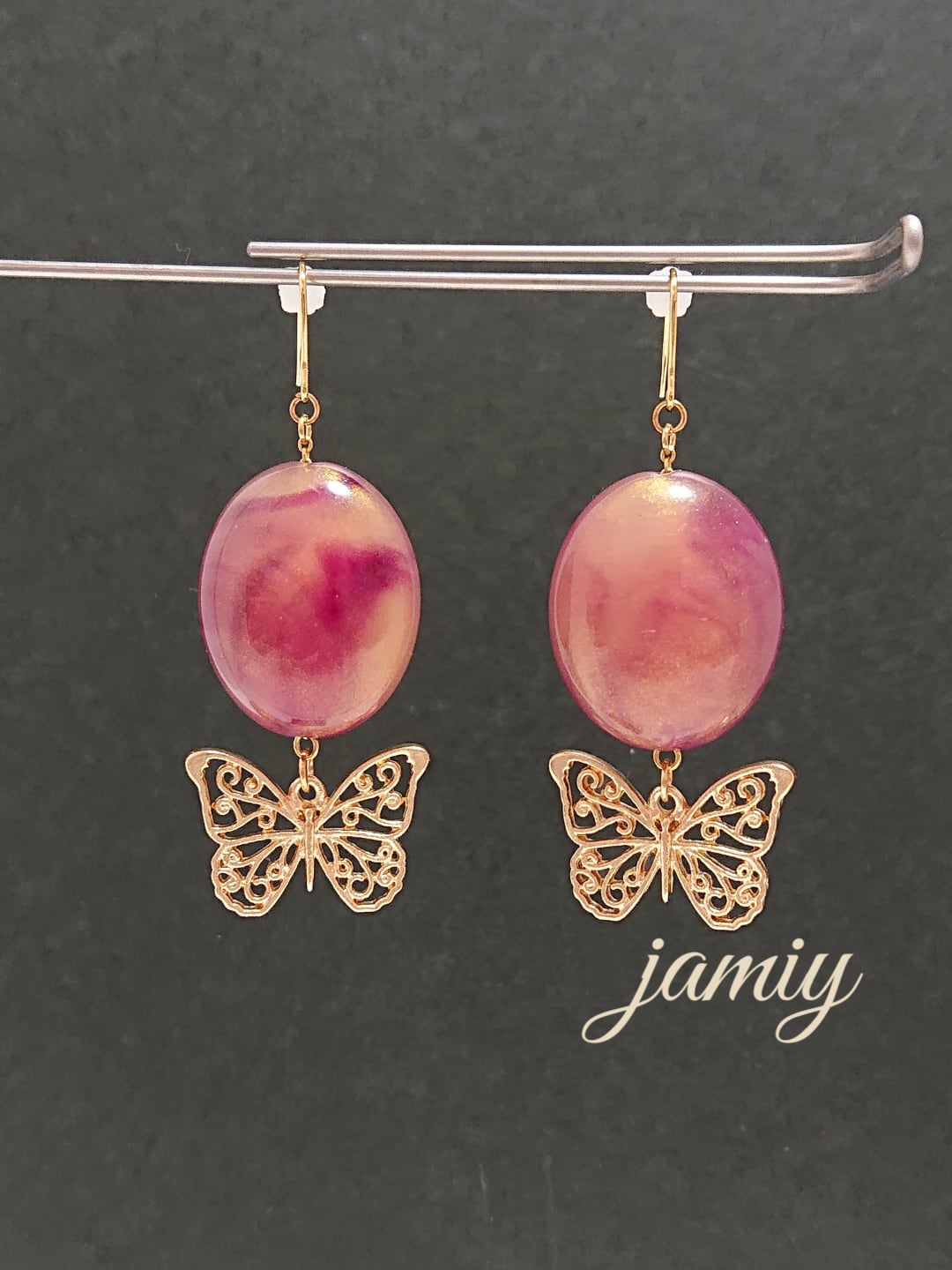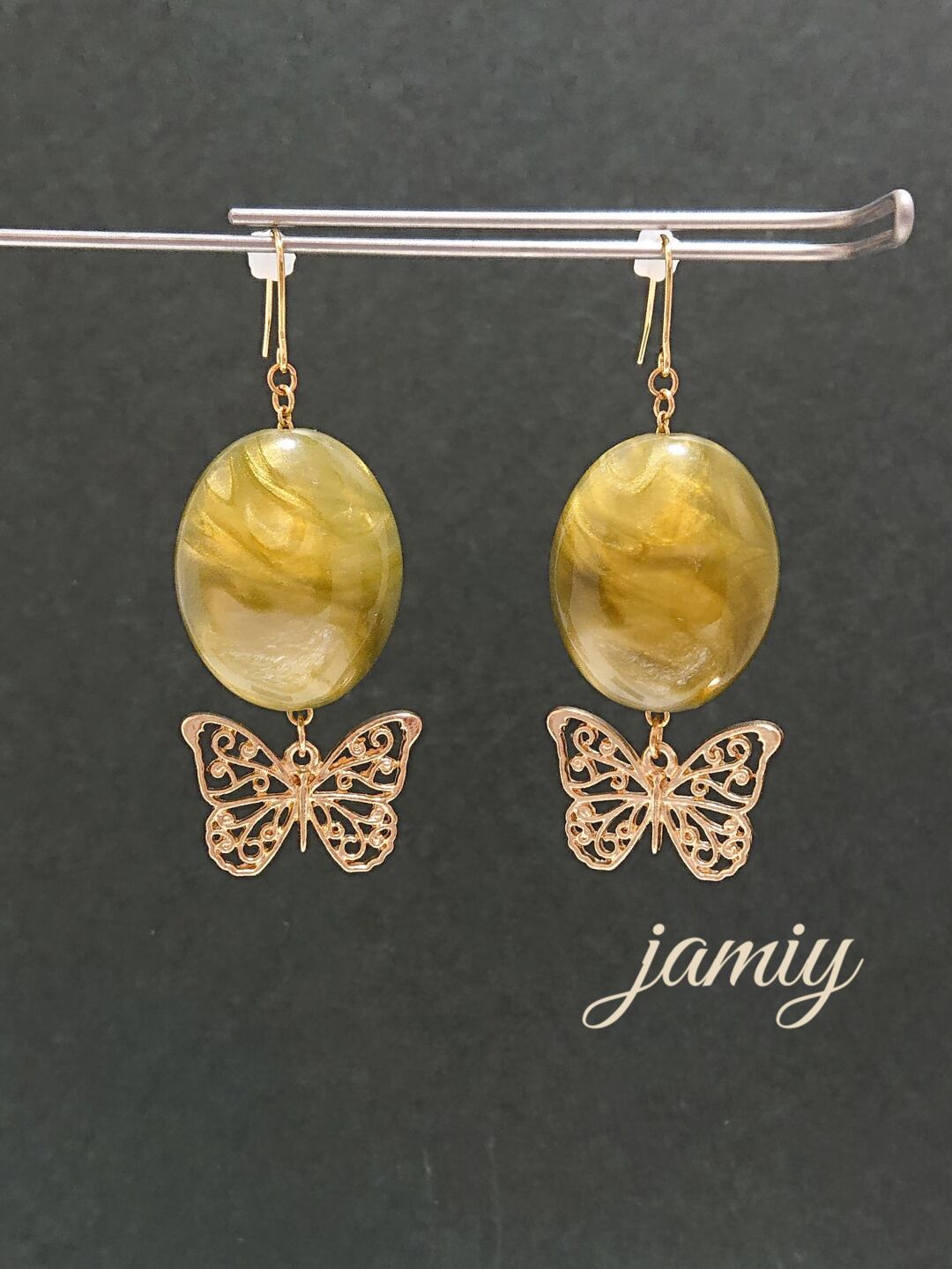 ゴールドのマーブル入りのアクリルビーズに、すかし蝶のゆれるピアス✨