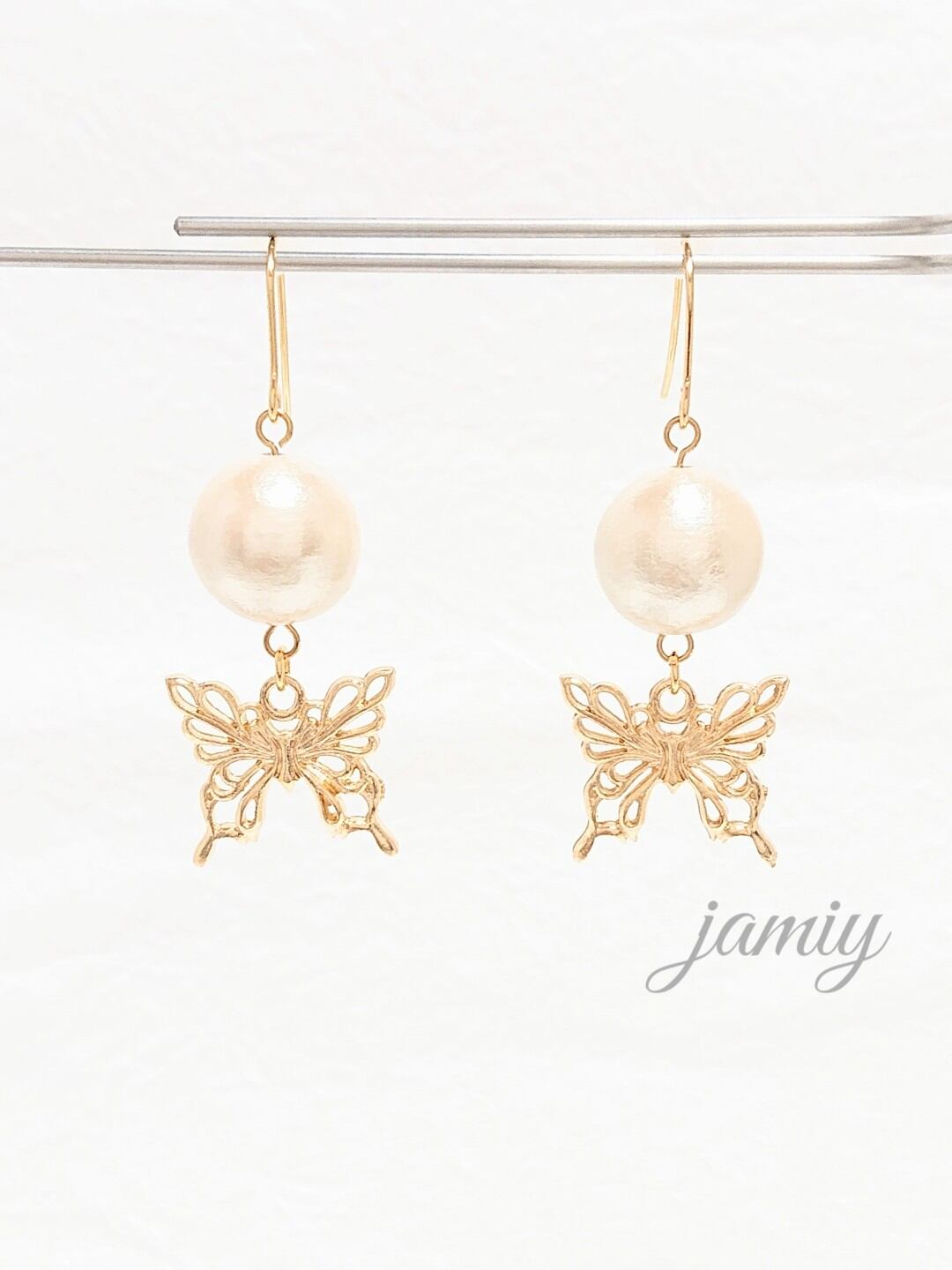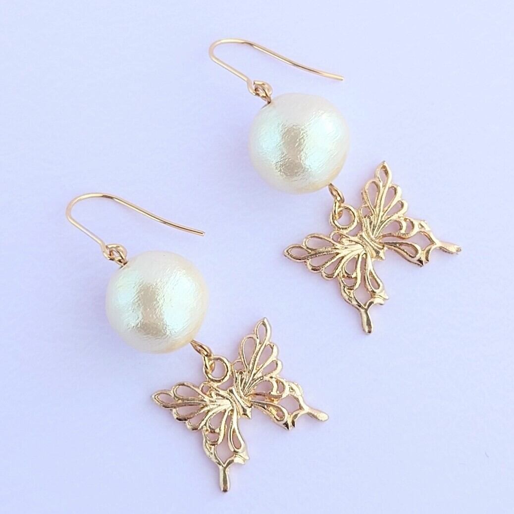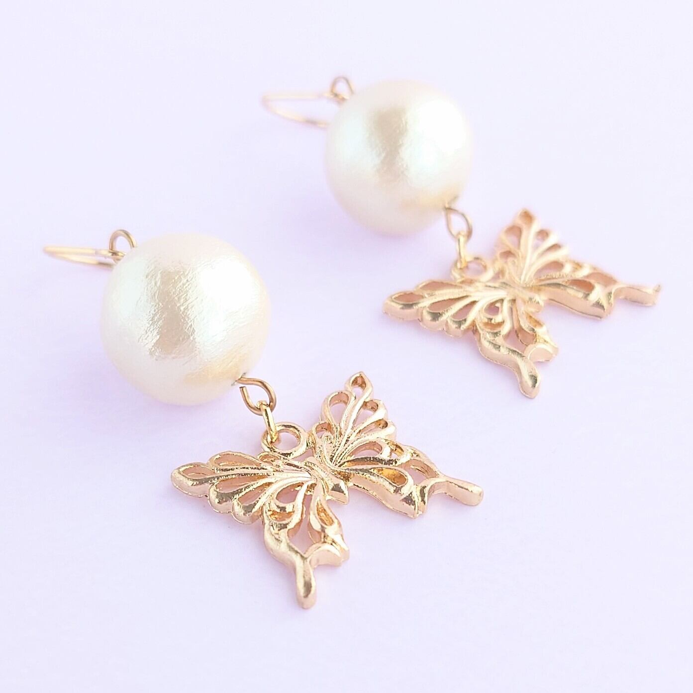 14mmのコットンパールに蝶がゆれるピアス✨