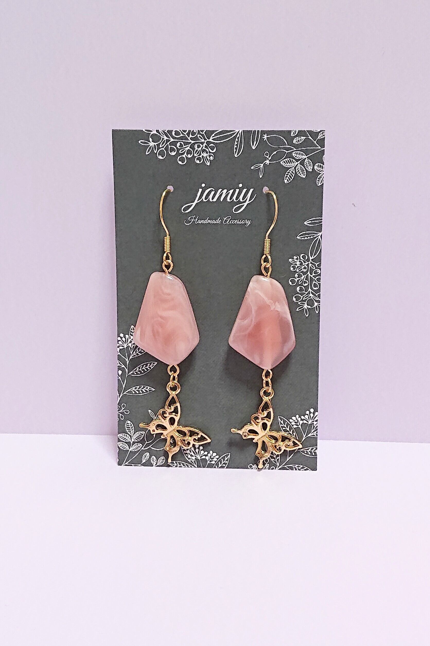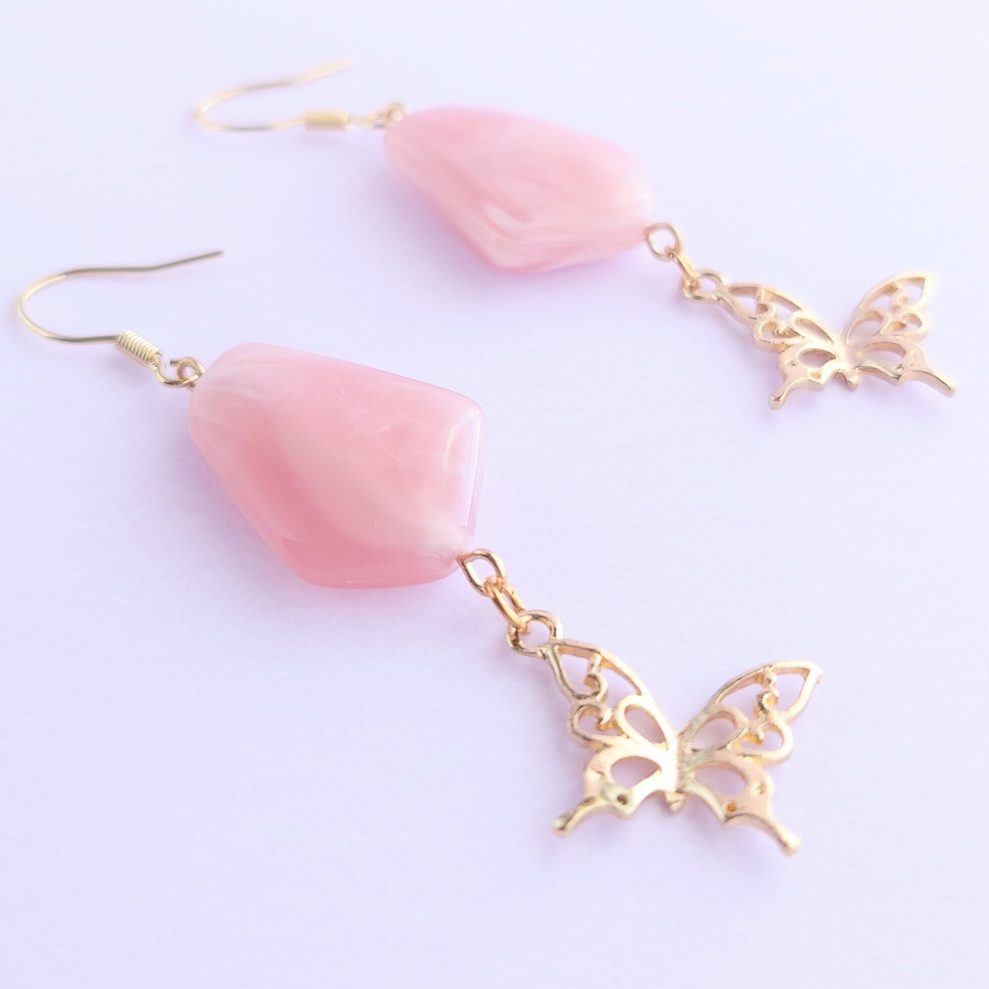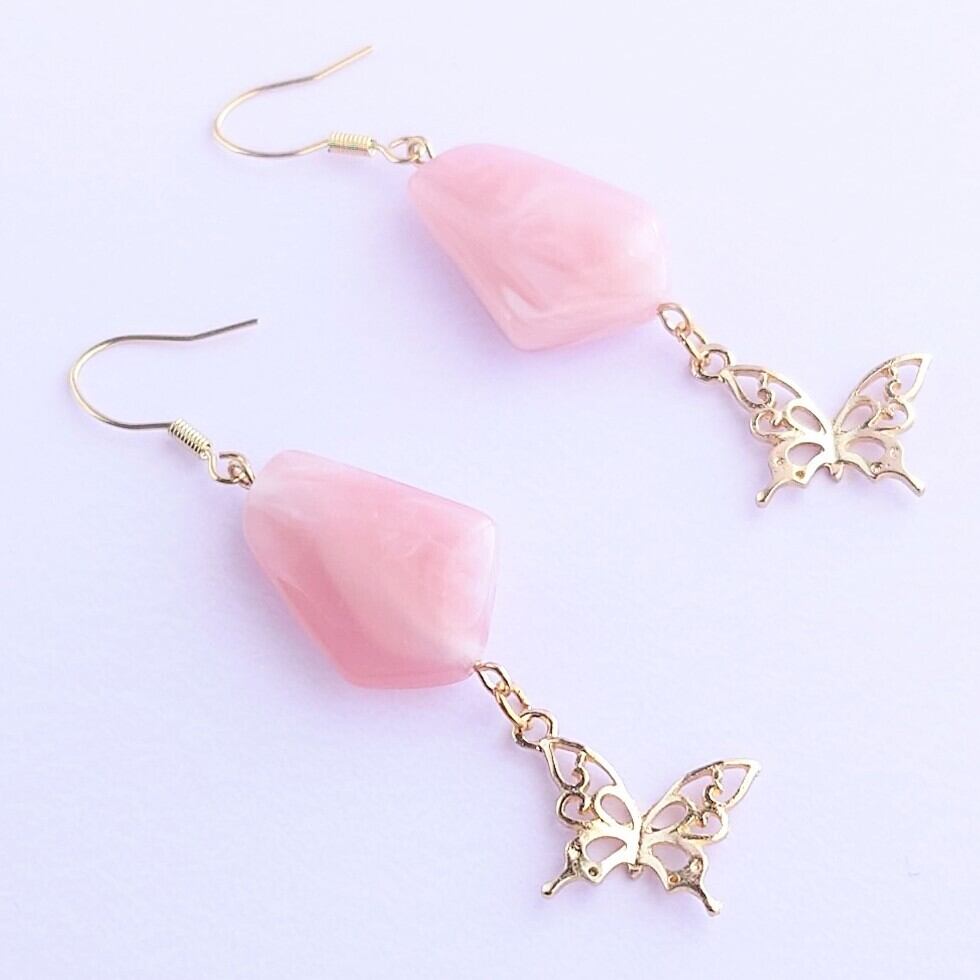 ピンクのアクリルマーブルビーズに蝶のゆれるピアス✨