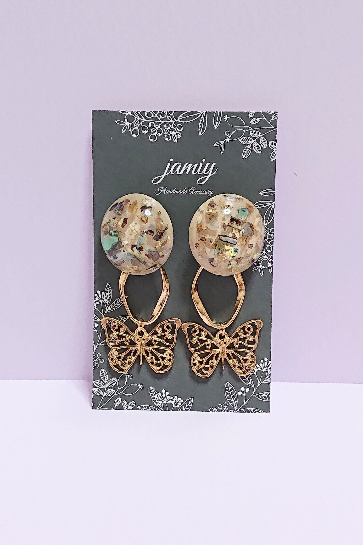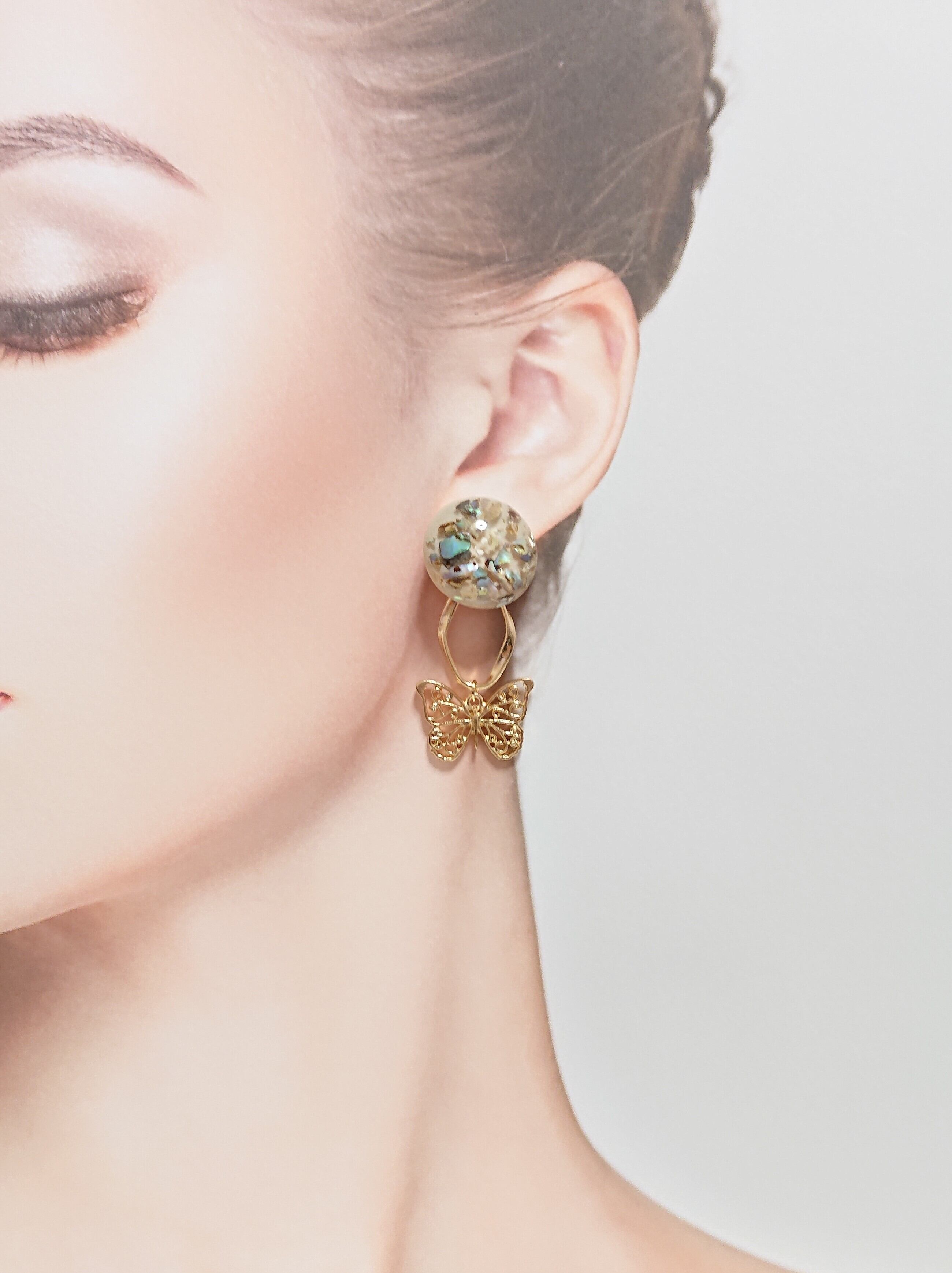 シェル入りベージュのカボションに蝶のゆれるピアス✨