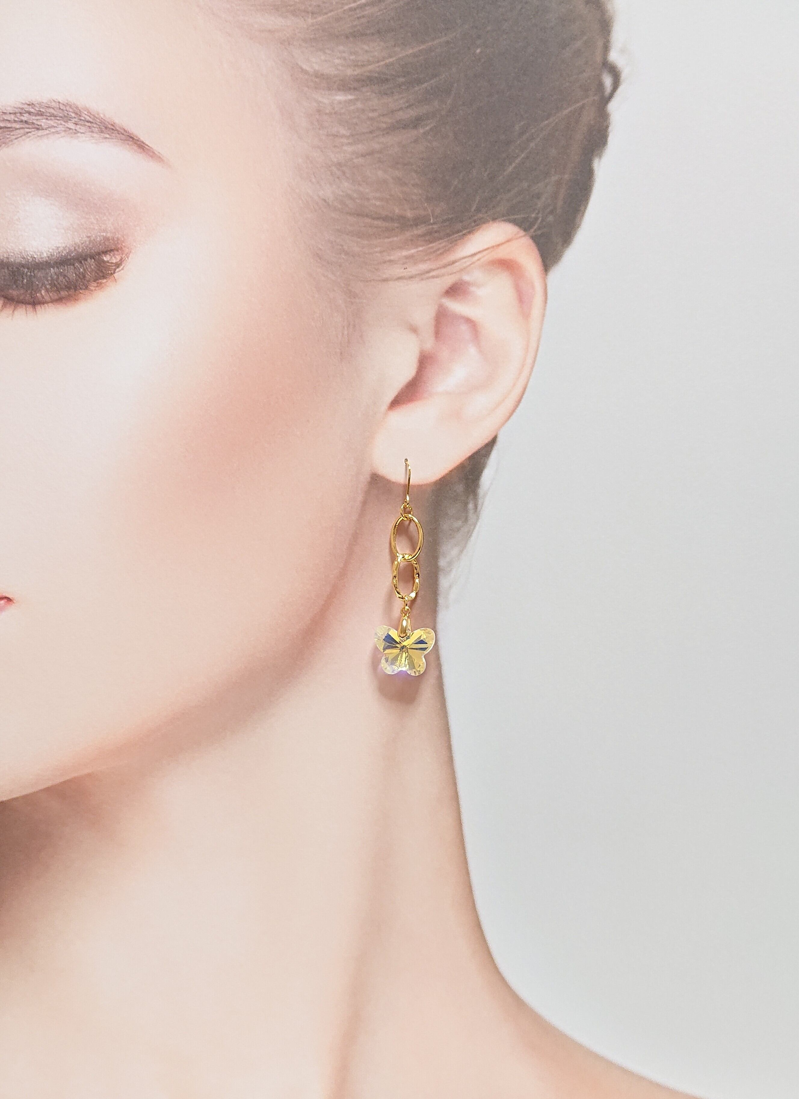 ダブルデザインリングに蝶のガラスチャームがゆれるピアス✨