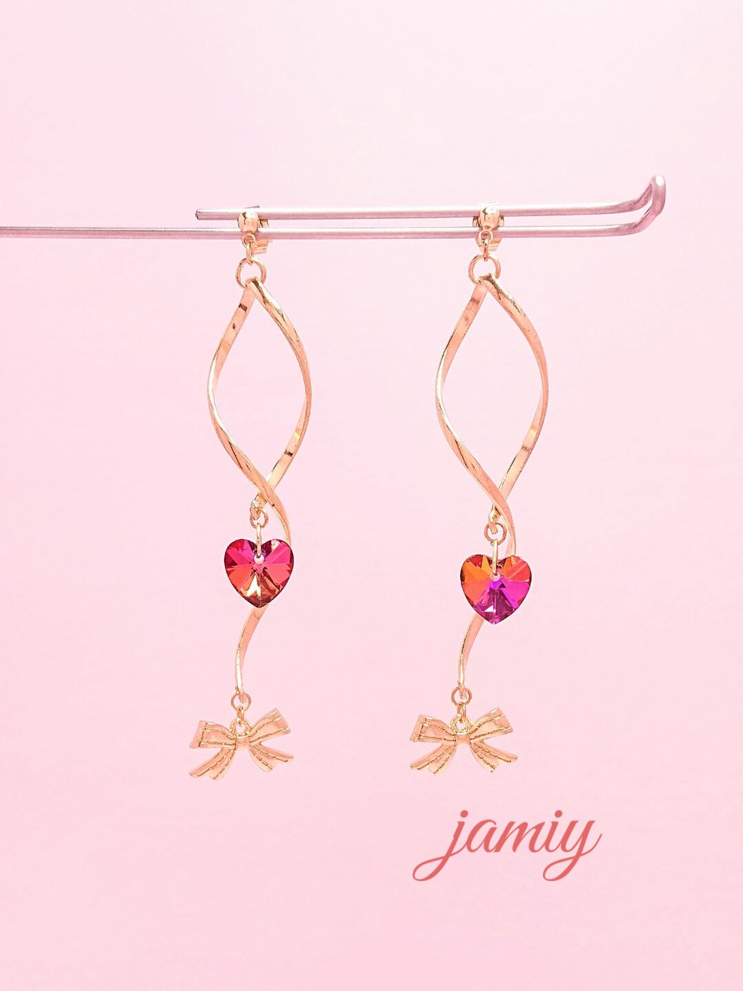 ガラスのハートとリボンをツイストループでゆれるピアスに✨