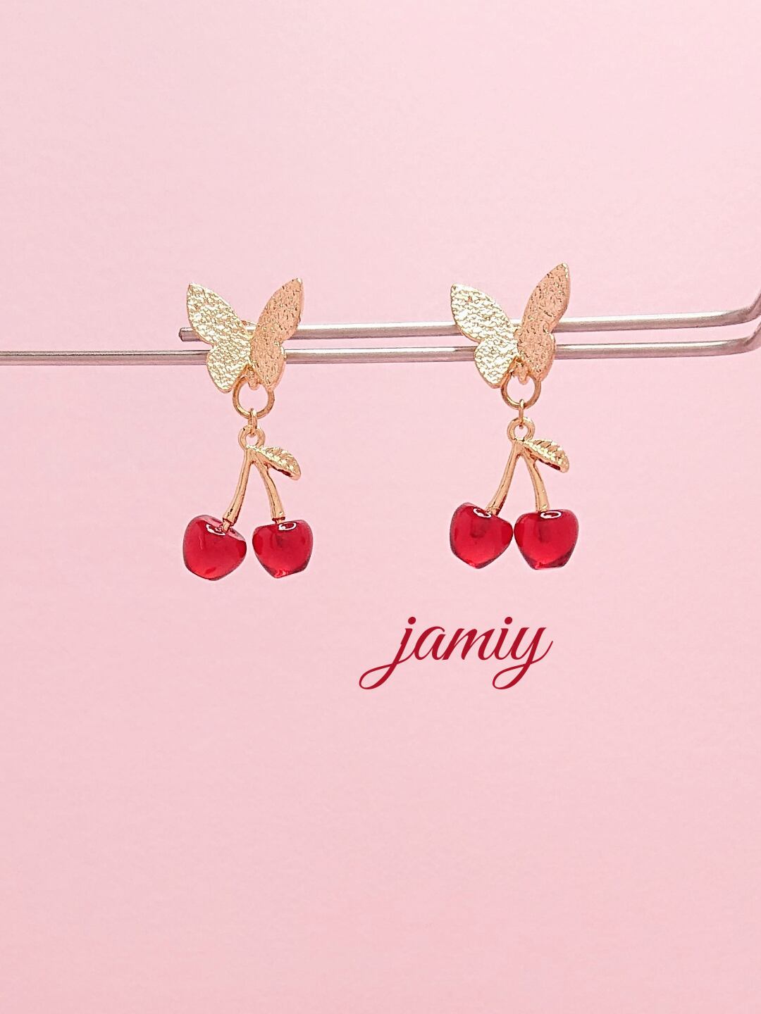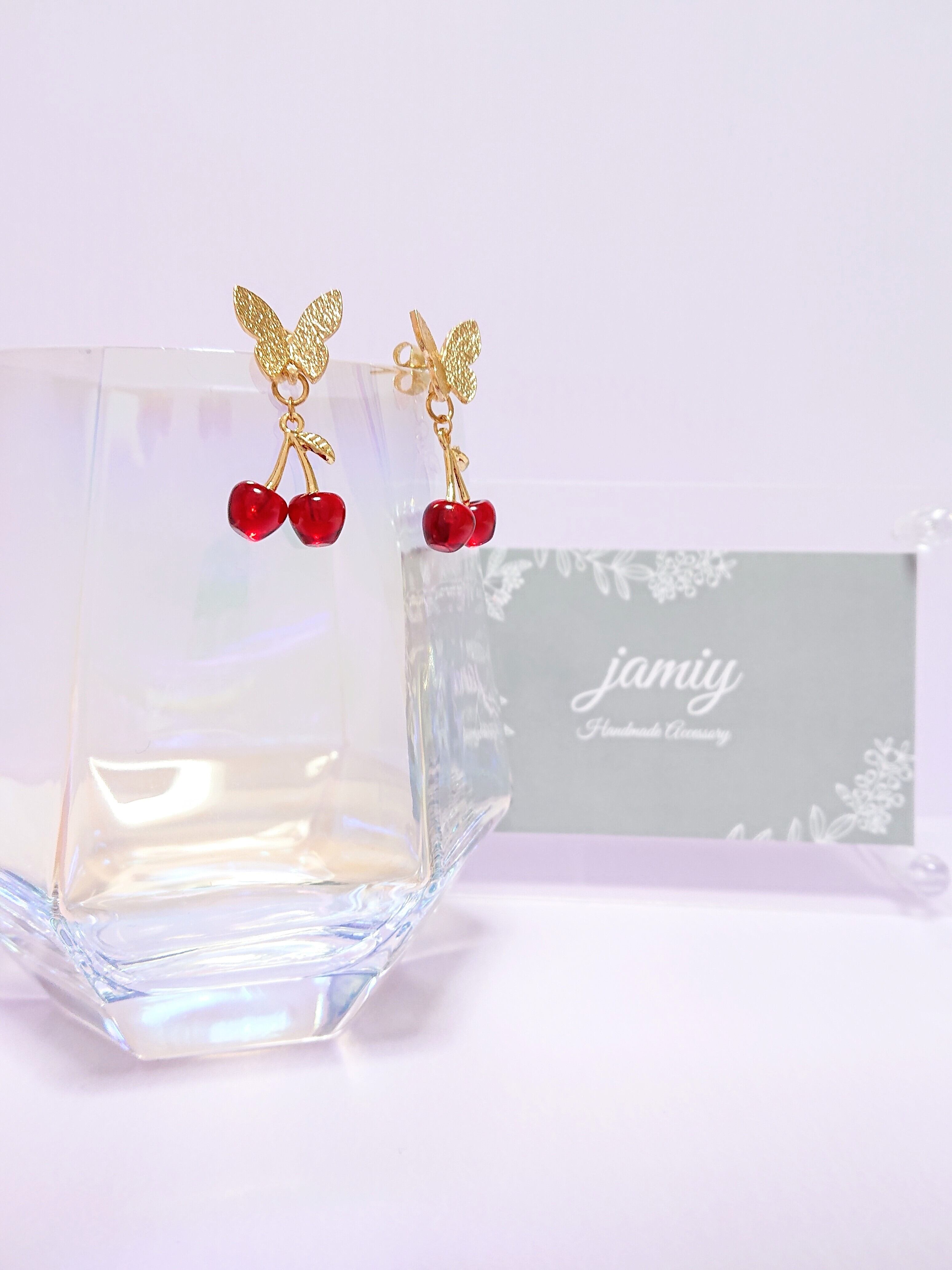 蝶ピアスに真っ赤なさくらんぼがゆれるピアス✨シンプルだけどファッションのアクセントになるピアスに✨