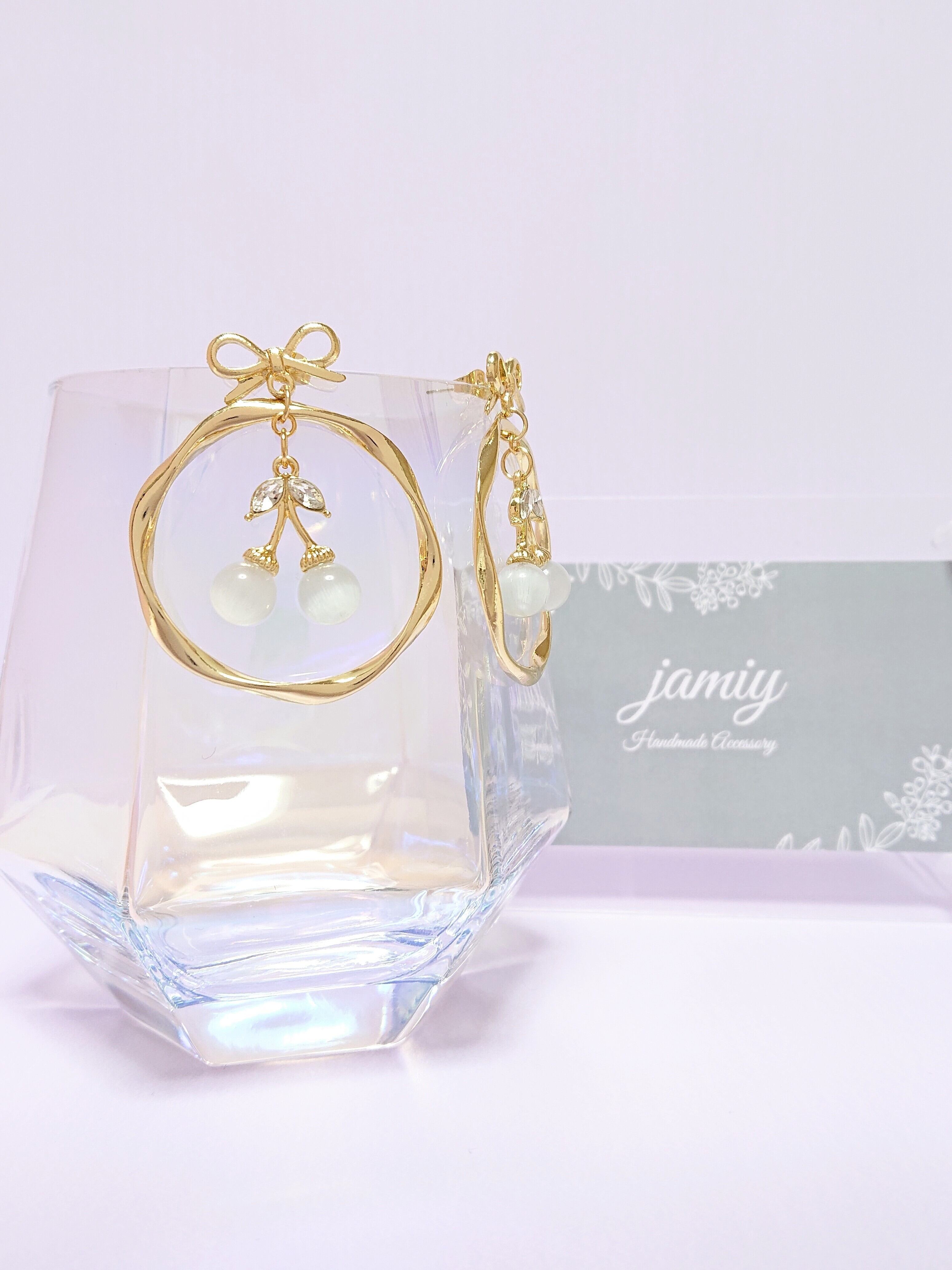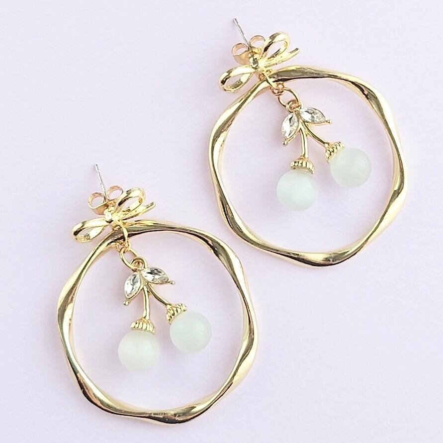リボンピアスにキャッツアイのさくらんぼチャームがループにゆれるピアス✨