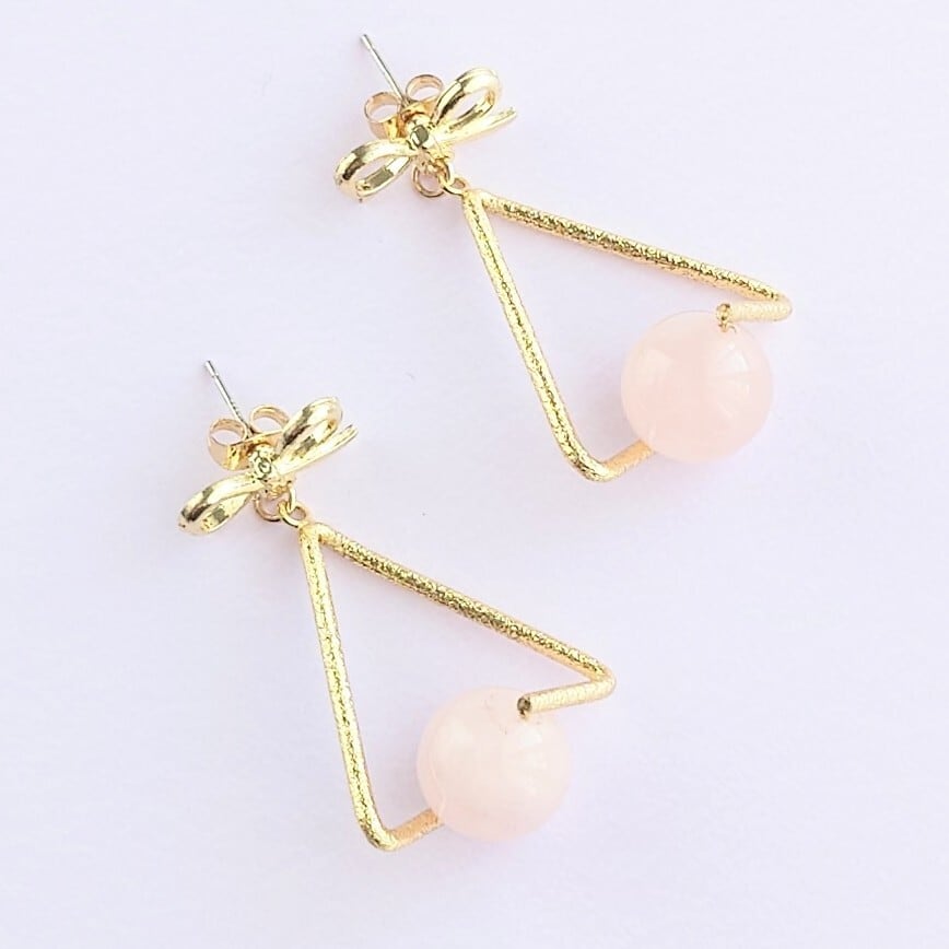 リボンピアスにトライアングルバチカンにローズクォーツをあわせたゆれるピアス✨