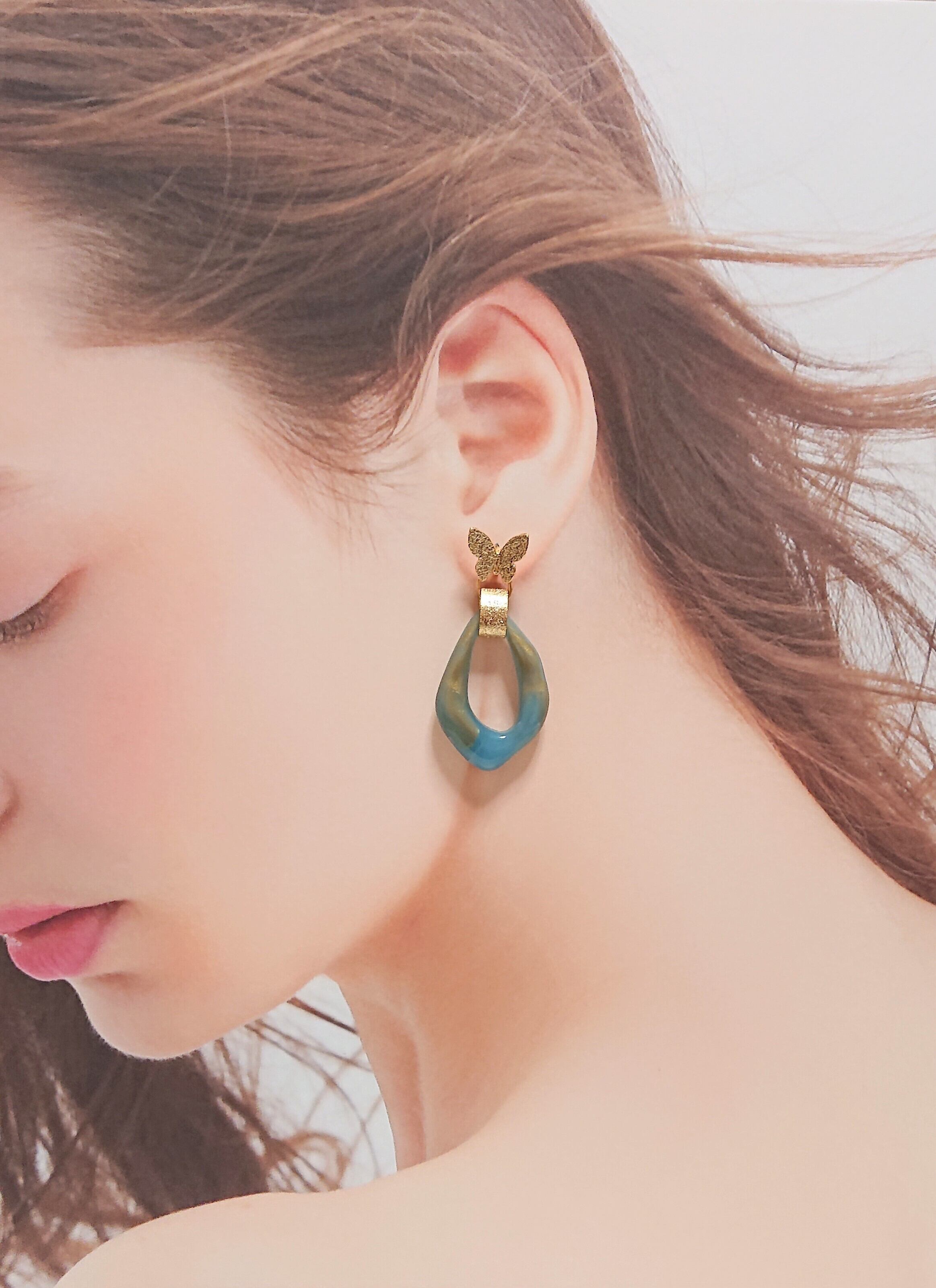 蝶のピアスにゴールドのマーブル入りのアクリルフープを太めのスターダストつなぎカンでゆれるピアスに✨