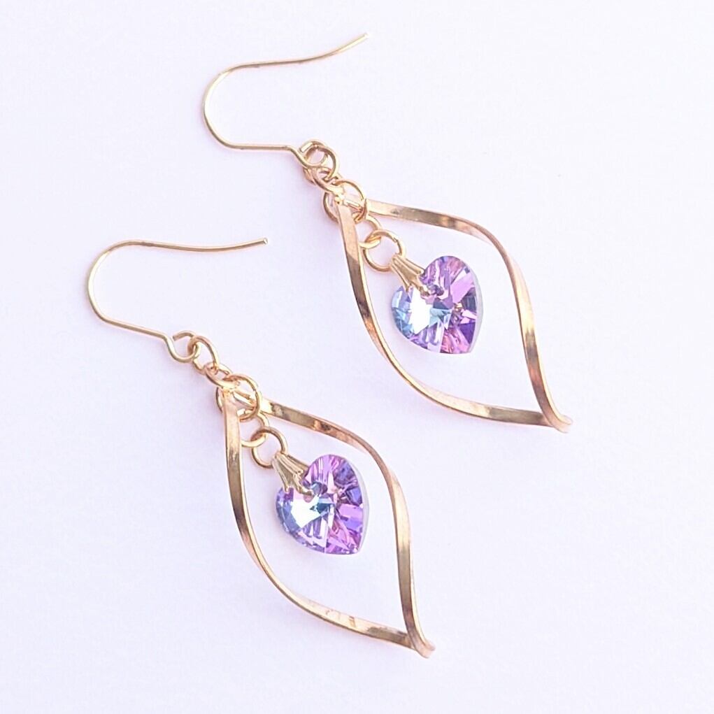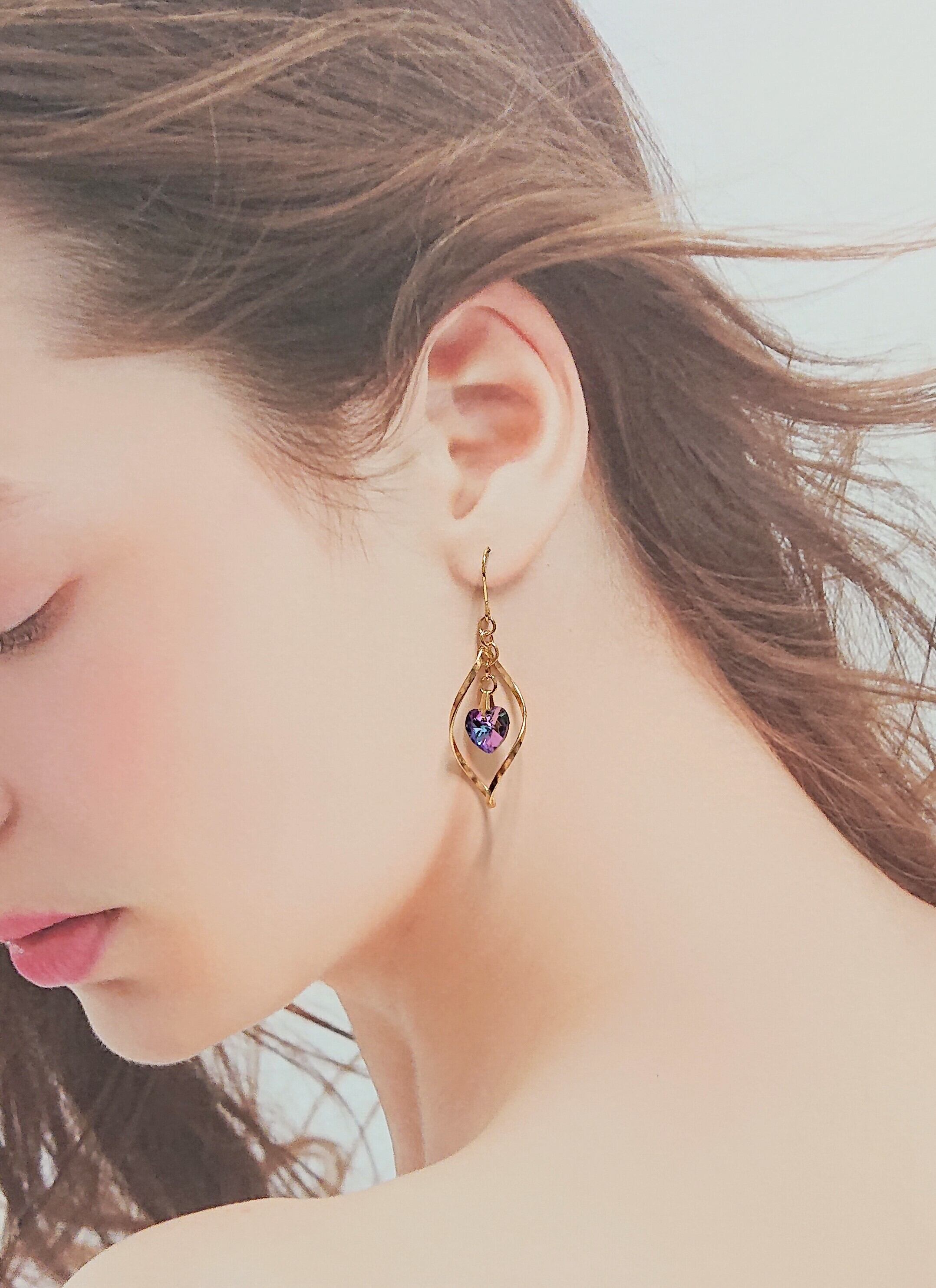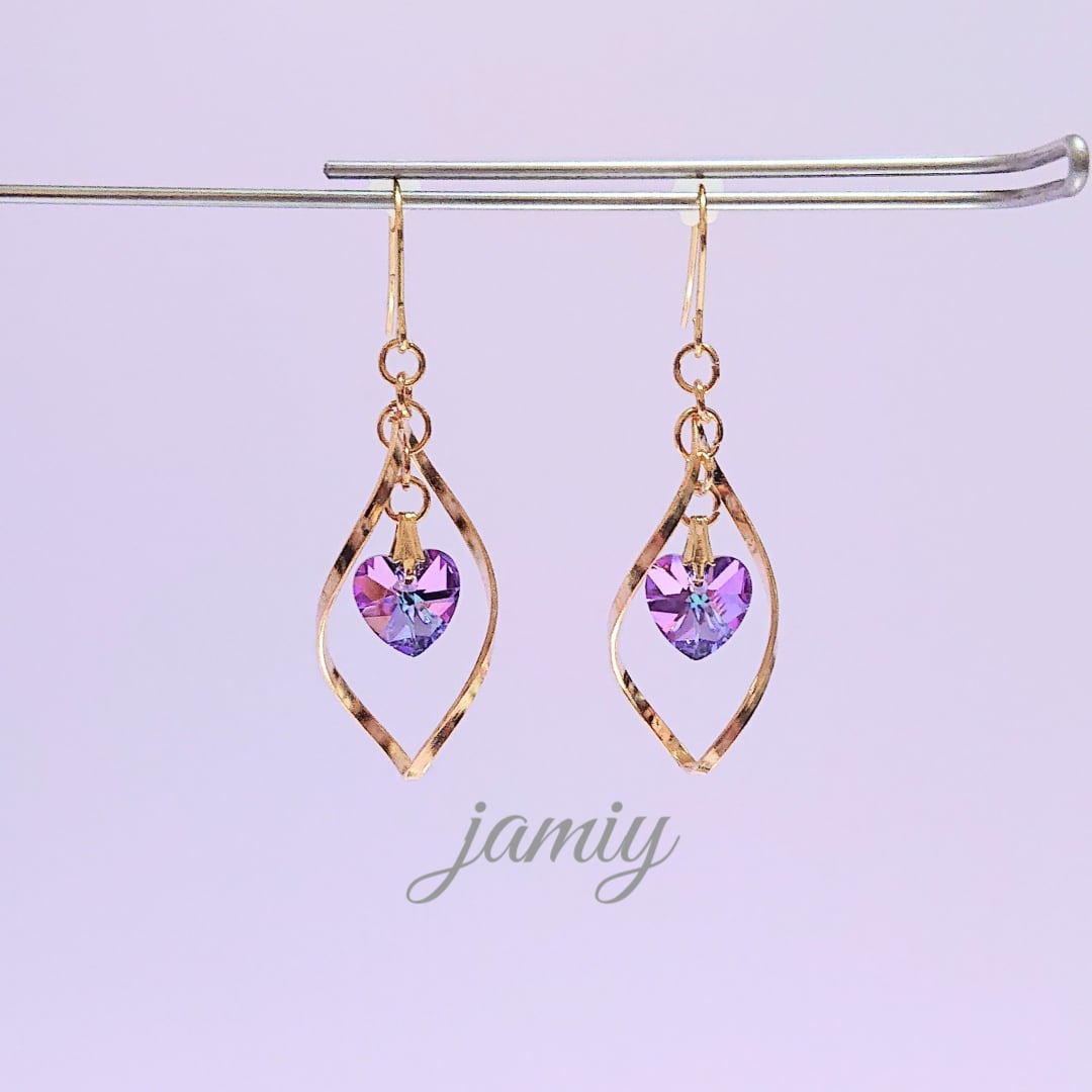 ループにパープルのハートのガラスチャームがゆれるピアス✨
