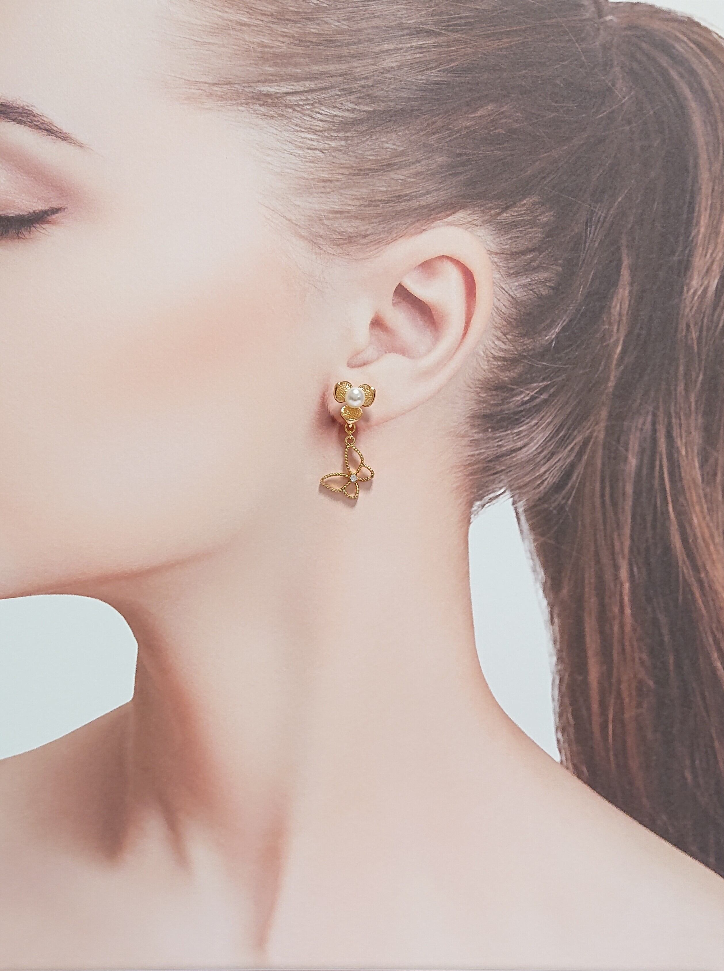 蝶にはさりげなくストーンが入っていて、お花の真ん中にパールで上品な感じのピアスです。