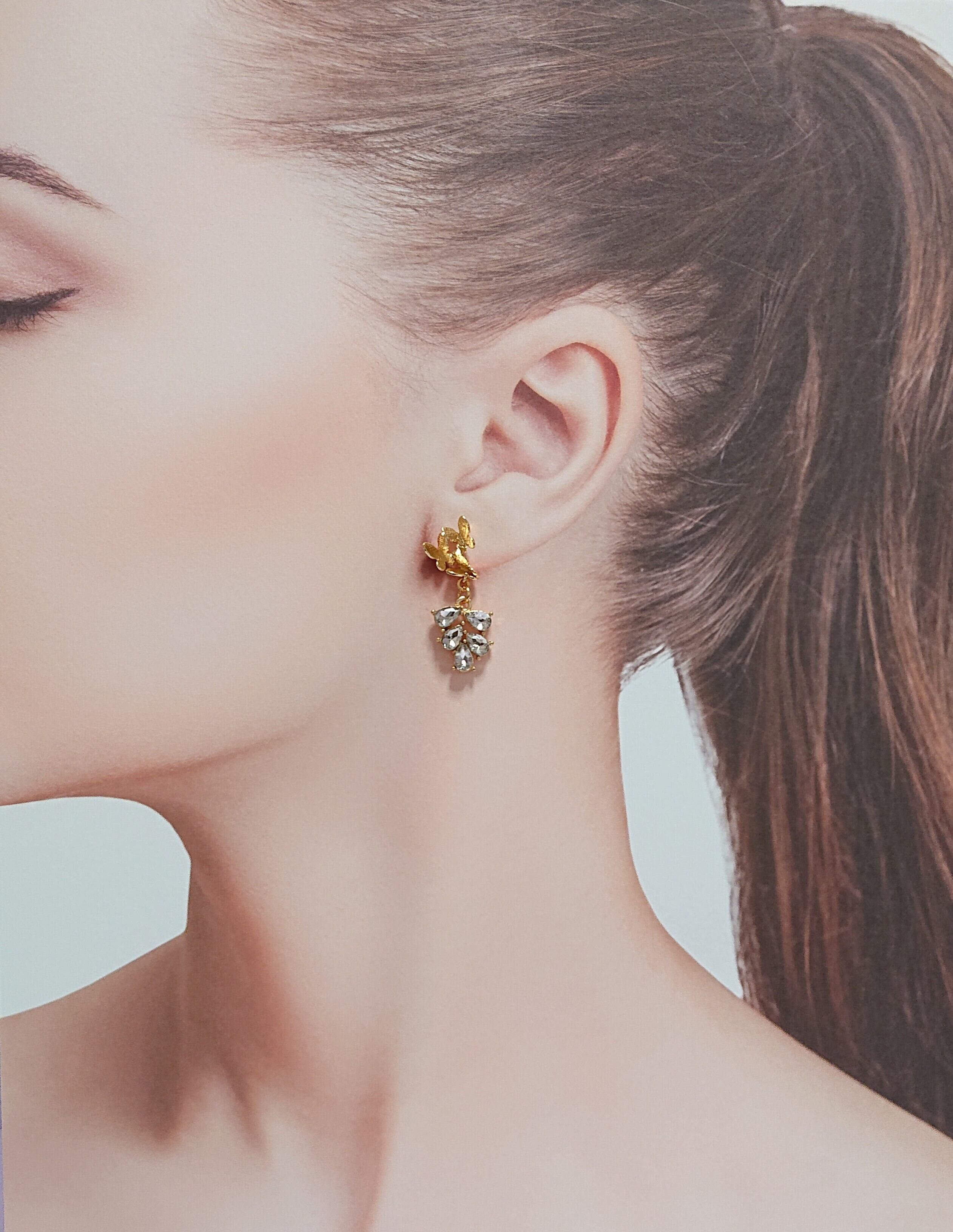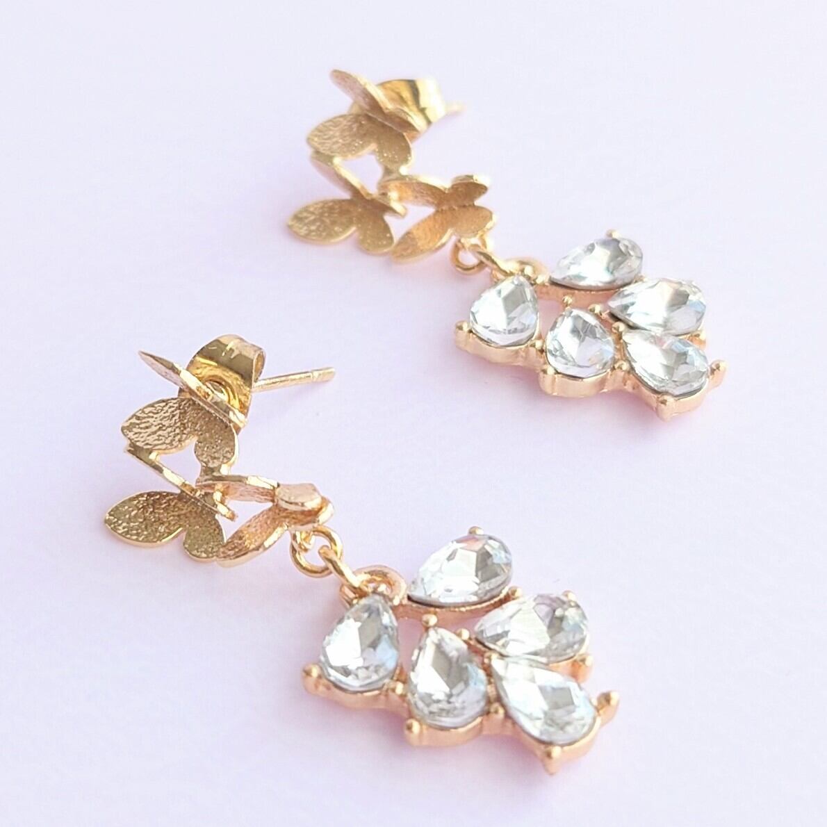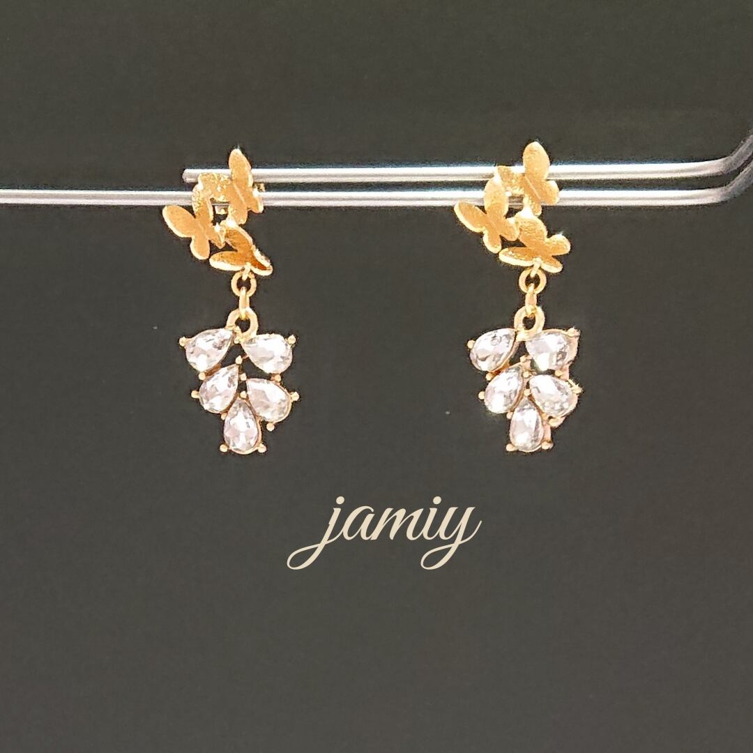 トリプル蝶ピアスにガラスストーンのリーフのゆれるピアス✨