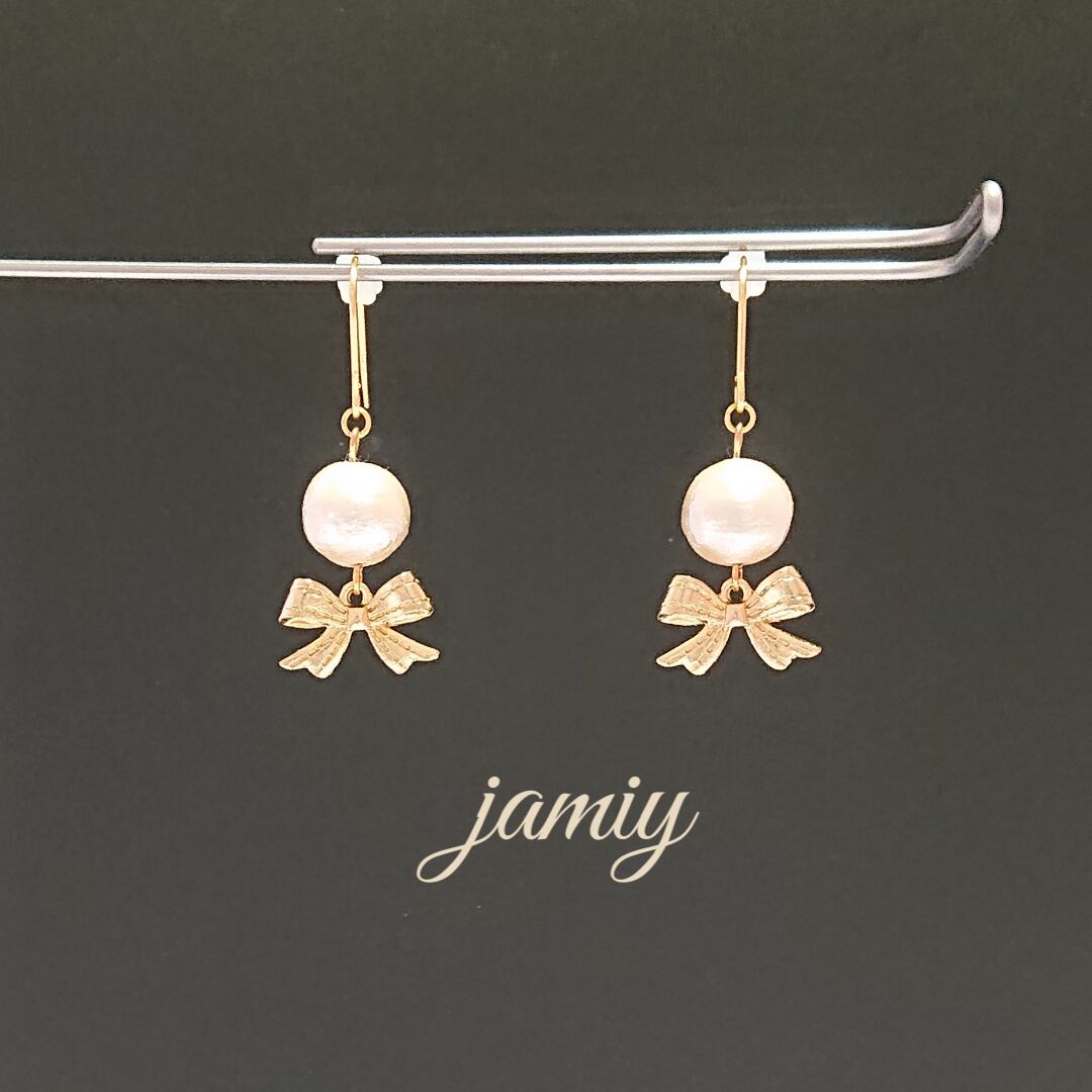 10mmのコットンパールにリボンチャームのゆれる華奢で上品なピアス✨