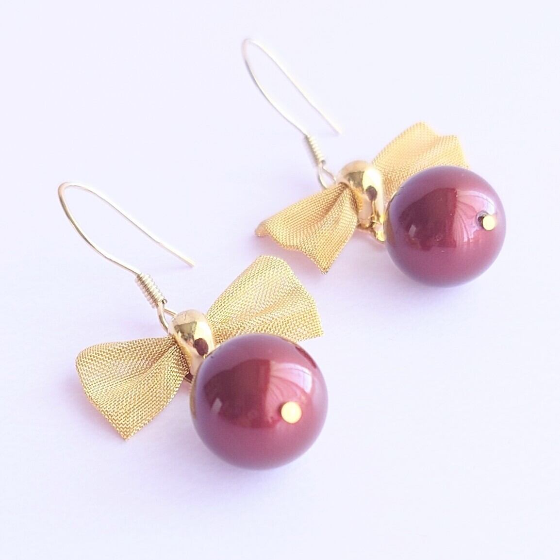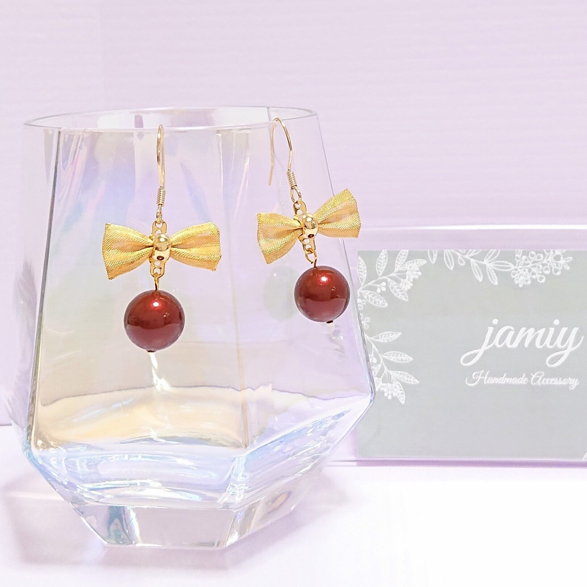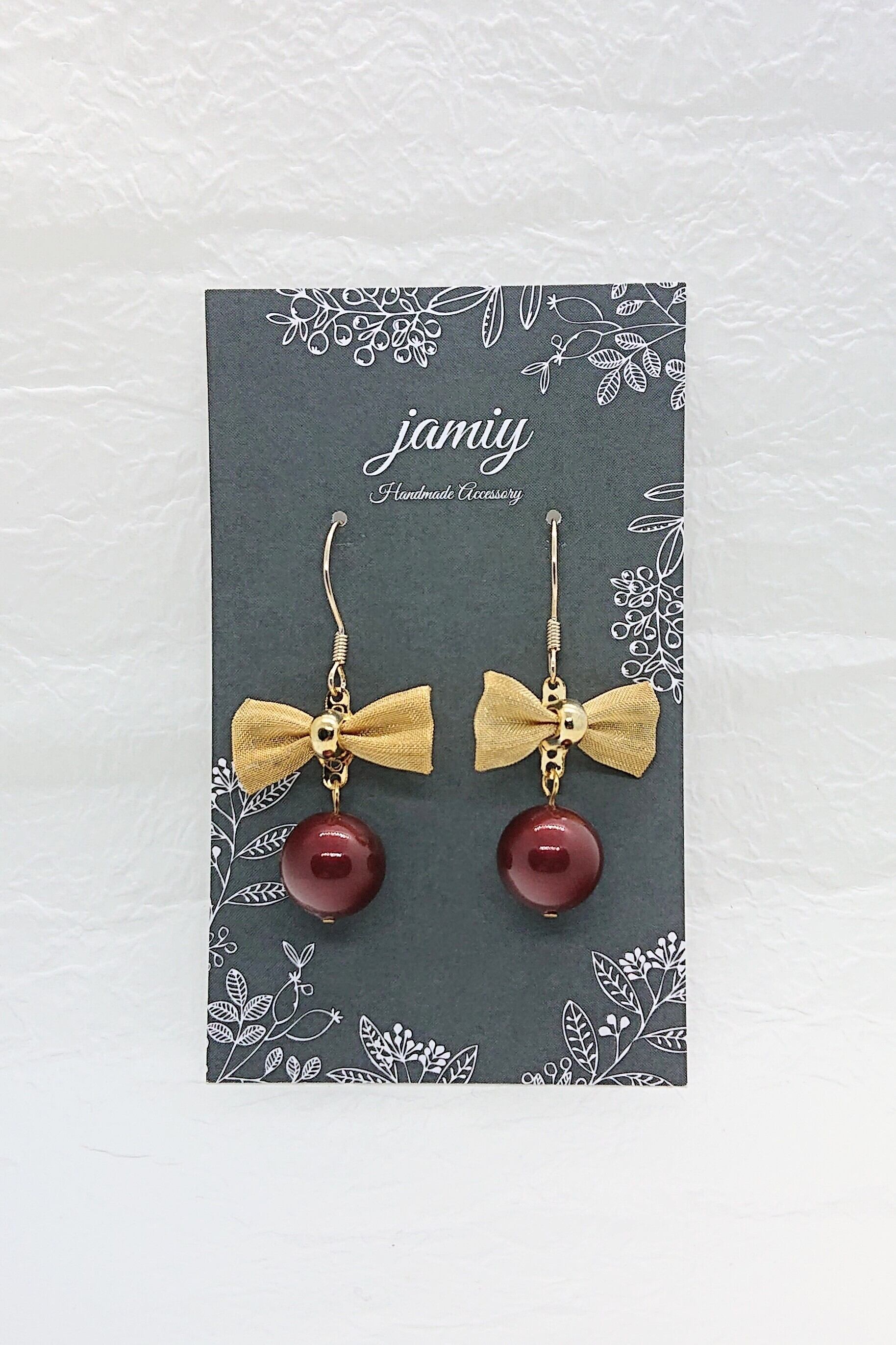 ゴールドのリボンにカラーパール(ボルドー)のゆれるピアス✨