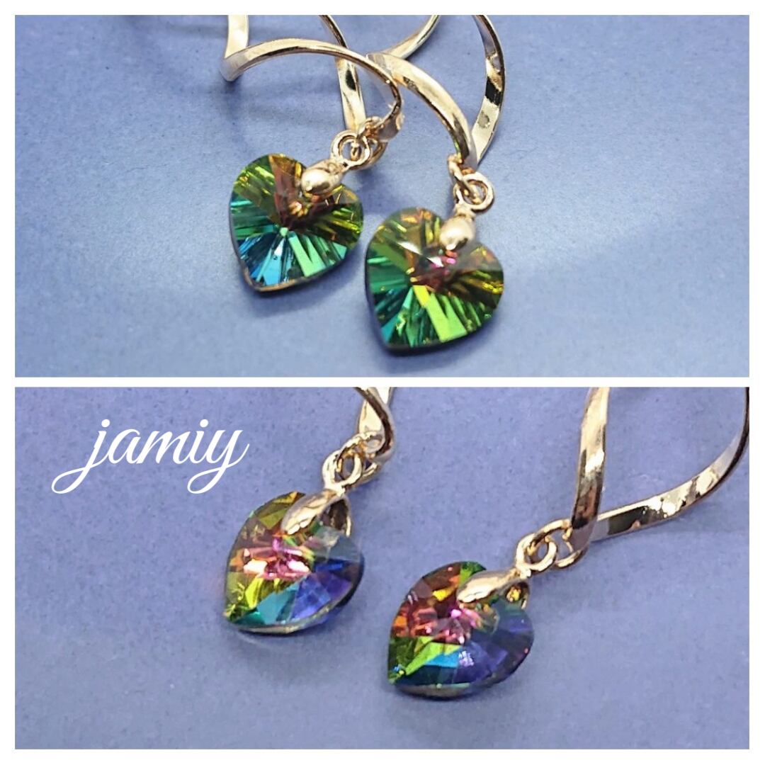 ガラスハートは角度によって色味が変化するレインボーカラー。(緑、赤、青)