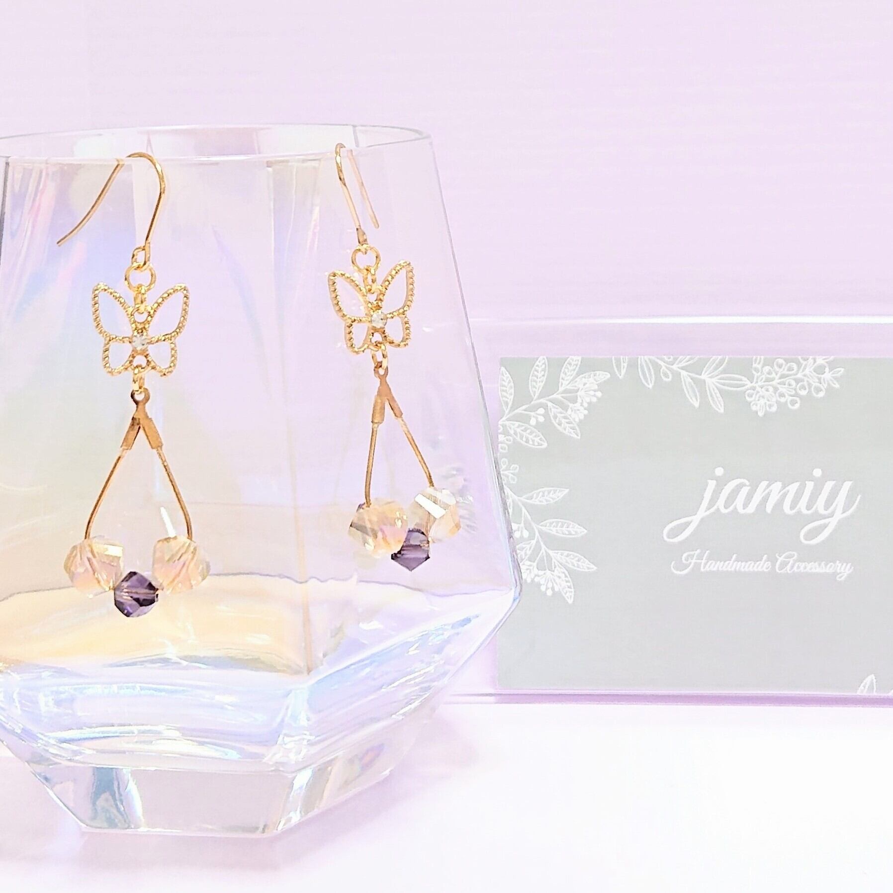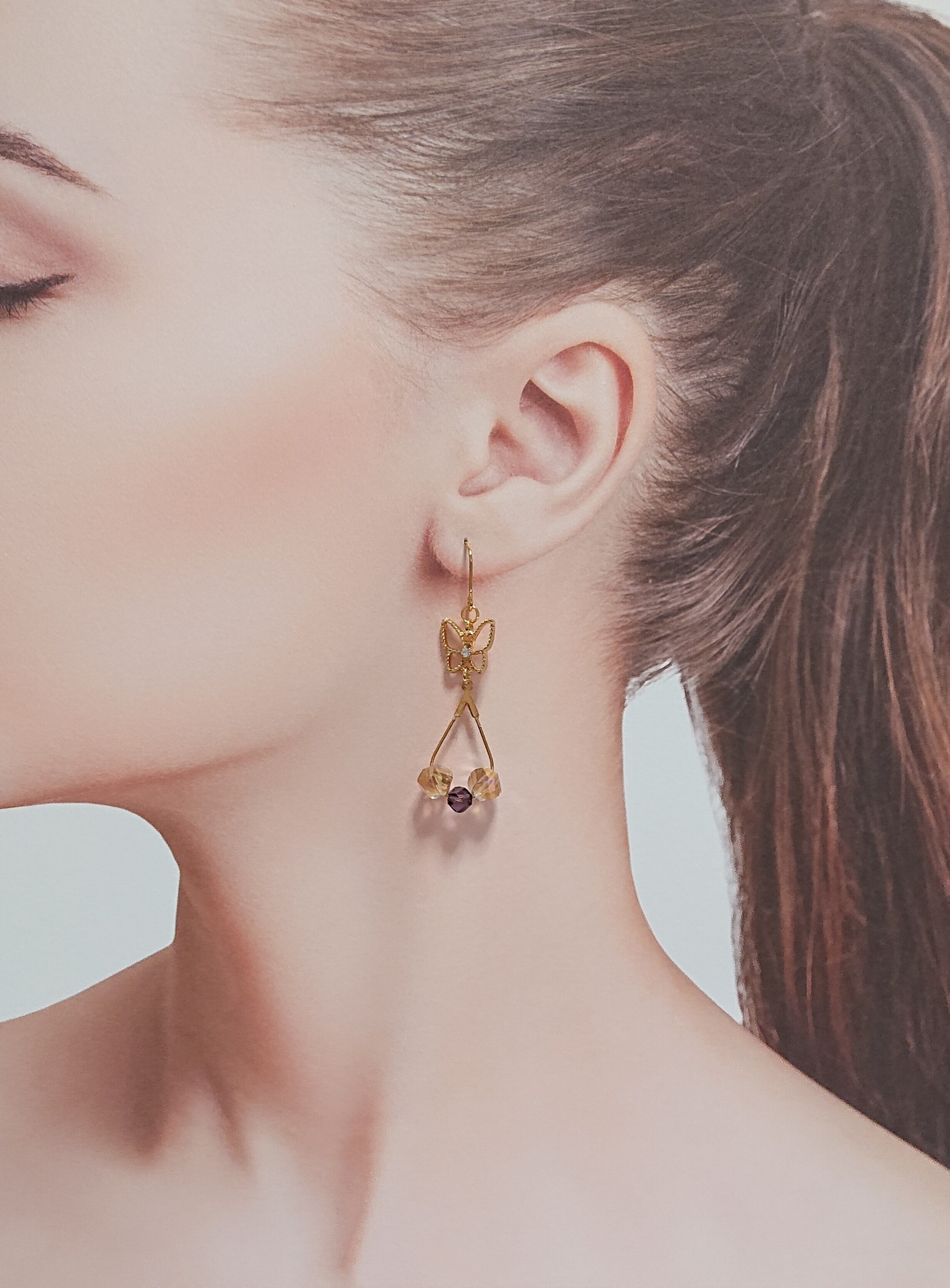 蝶チャームとしずくフープにライトブラウンとパープルのツイストガラスビーズがゆれるピアス✨